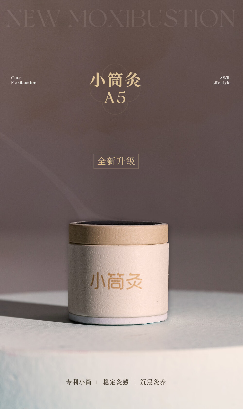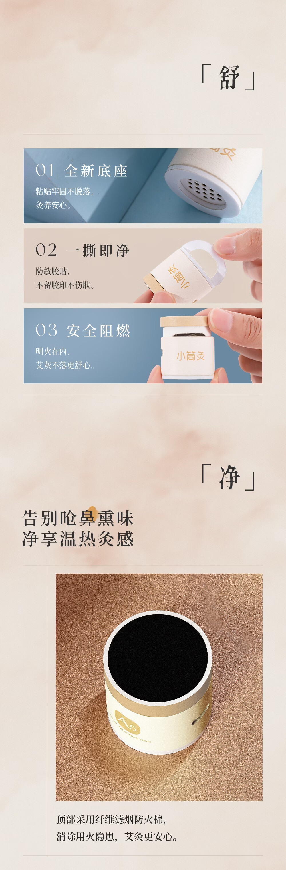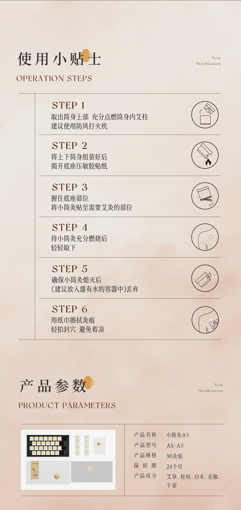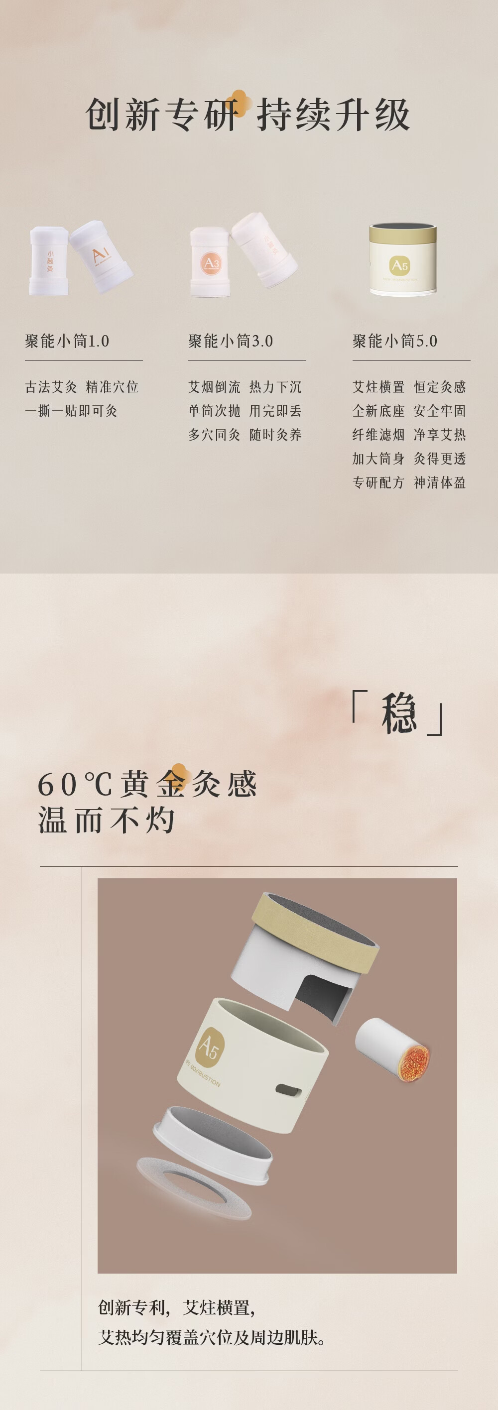 天然陈蕲艾,搭配艾叶,桂枝,茯苓,白术,花椒,干姜;搭配聚能筒设计,直径加大易定位,采用横置艾柱;可达约40分钟深度灸疗,产品搭配穴位图精准调理
