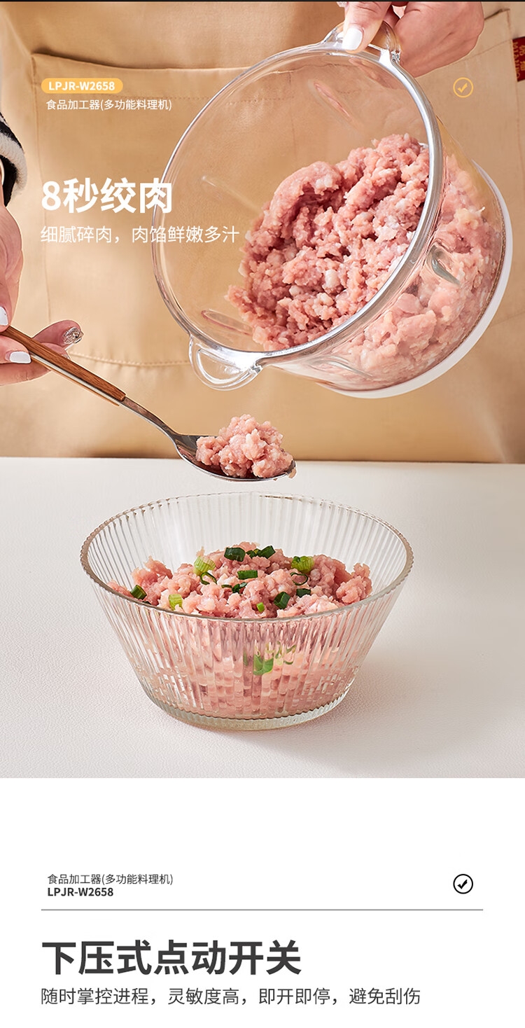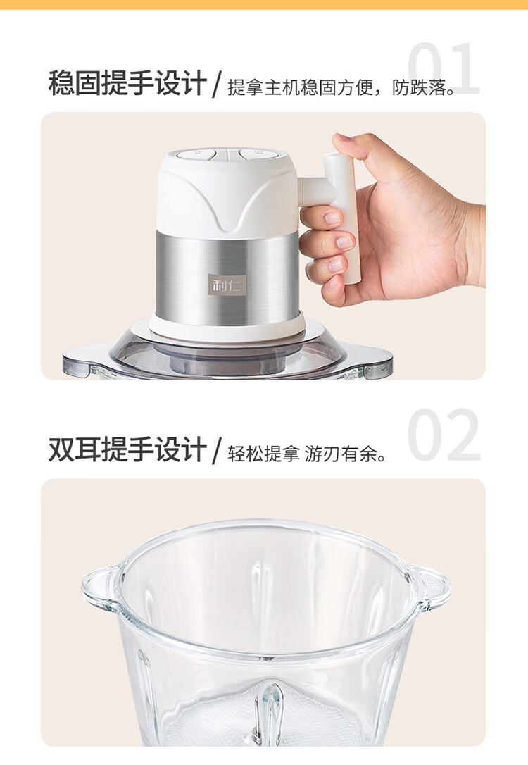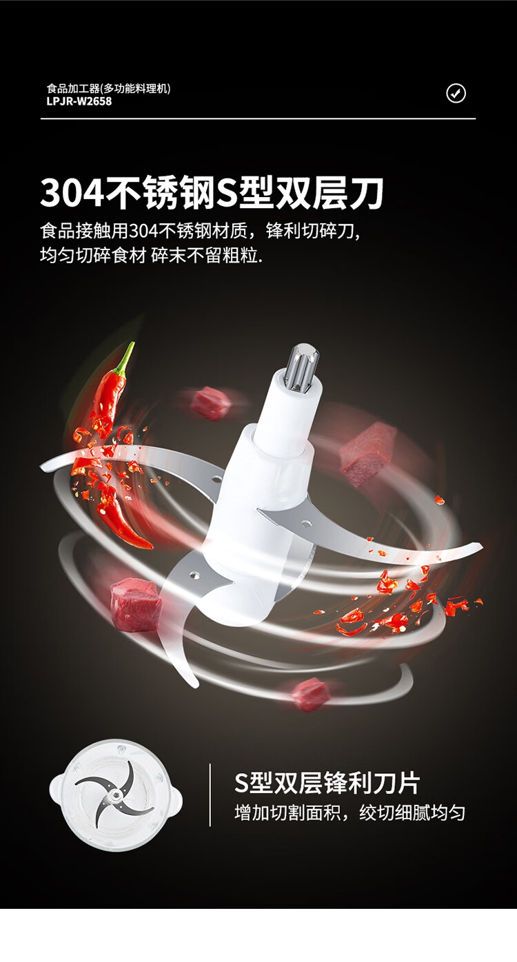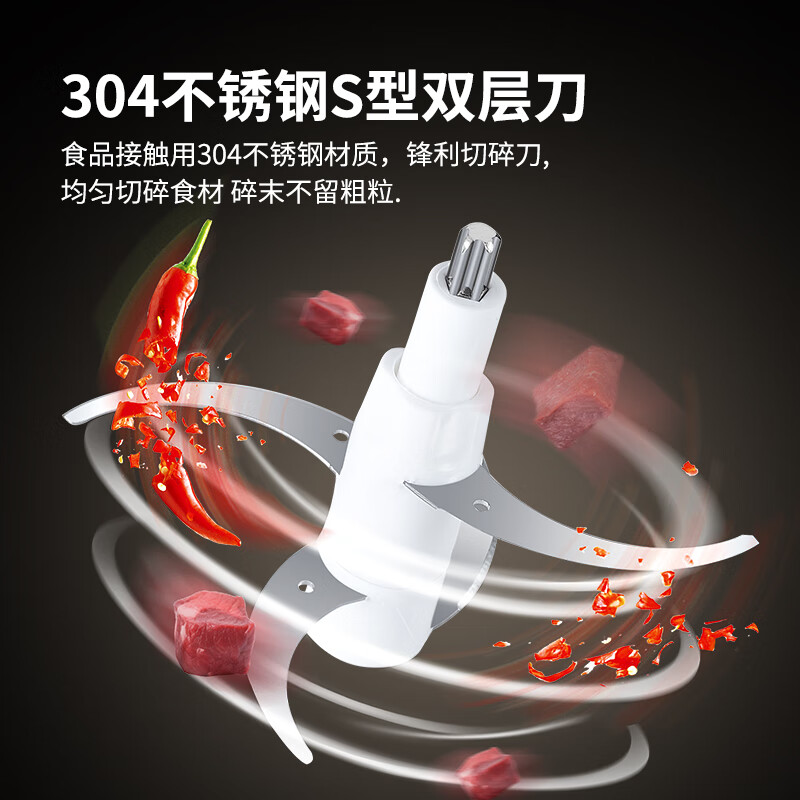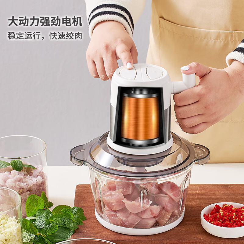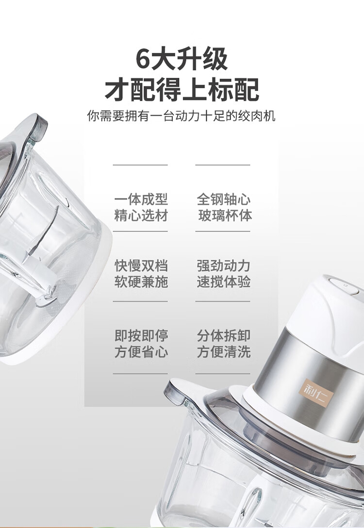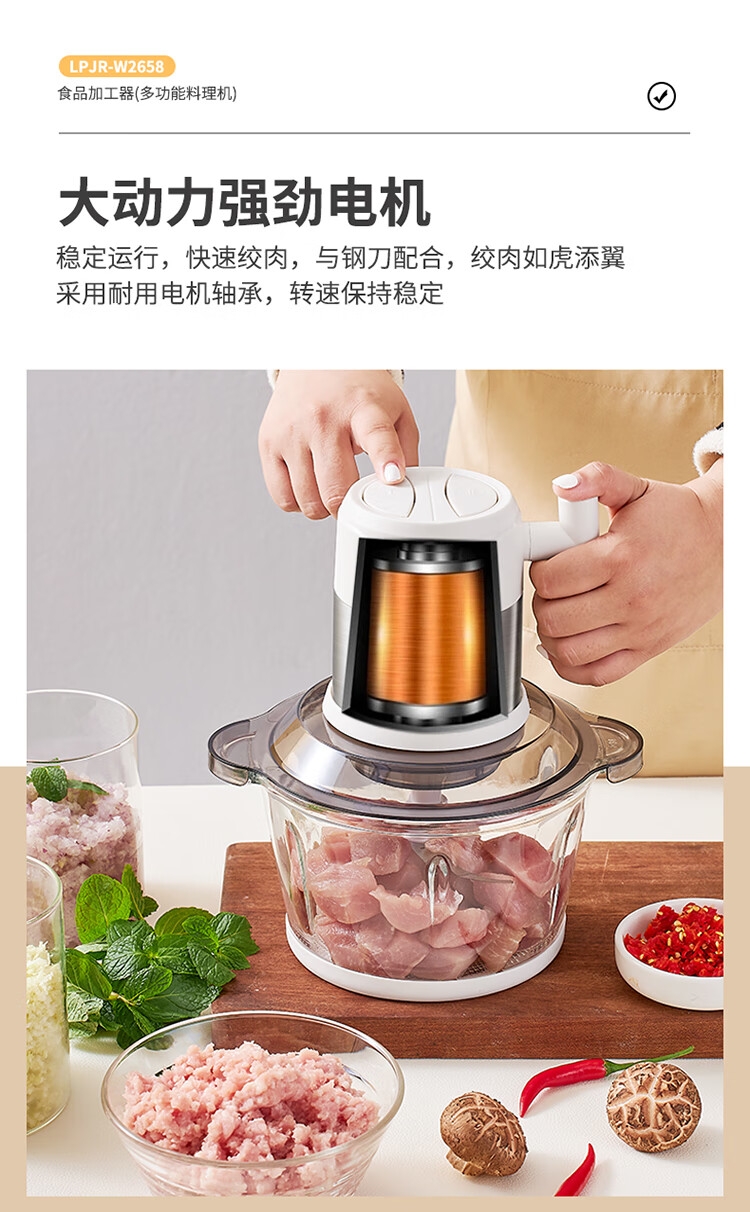 2L大容量 满足全家用量;双层立体4刀片 锋利速绞不塞肉;快慢两档 适合不同食材;加厚杯体 坚固耐用;一机多能 绞肉/蔬菜/辅食