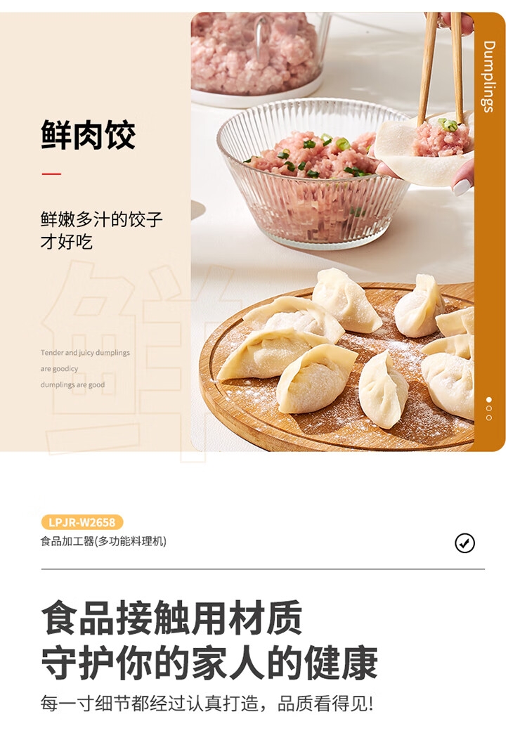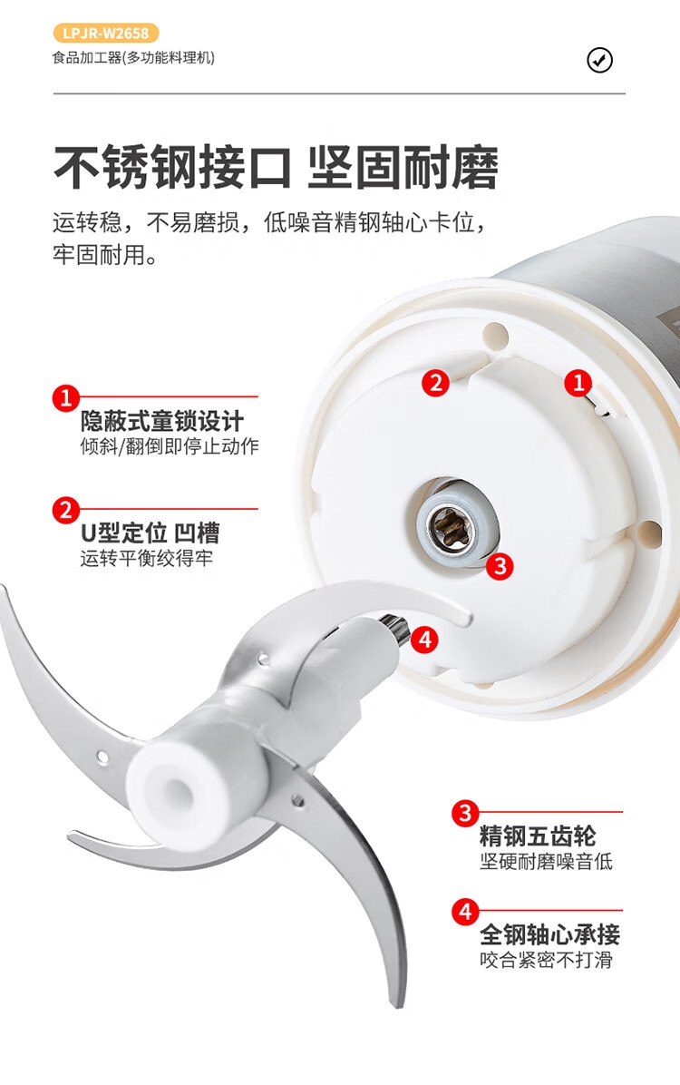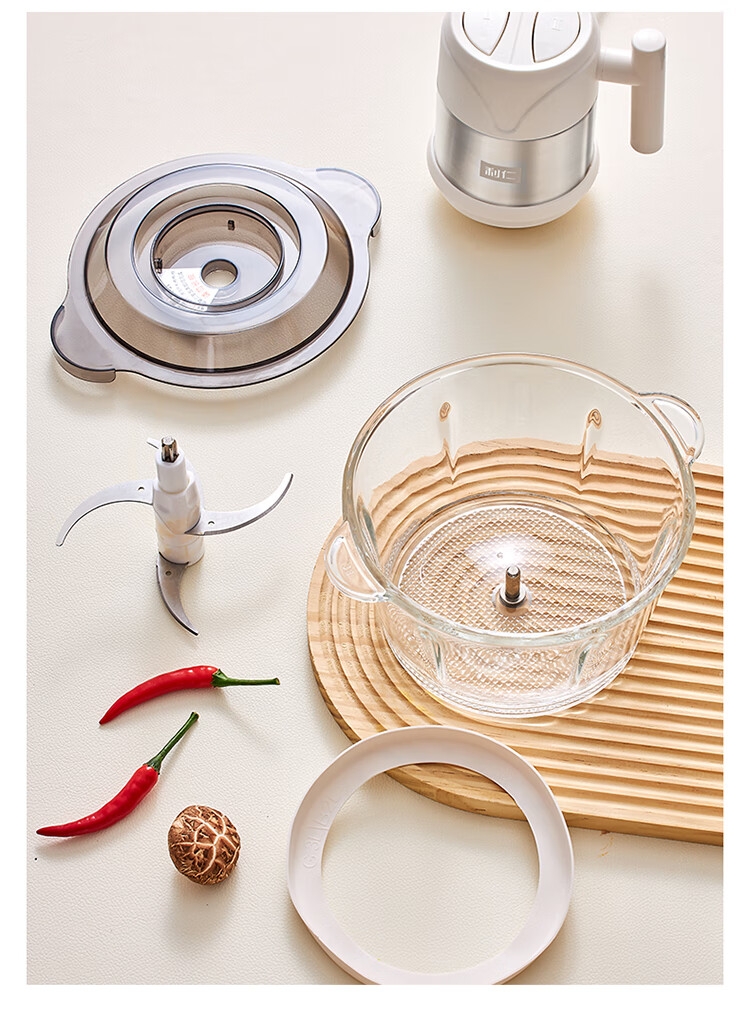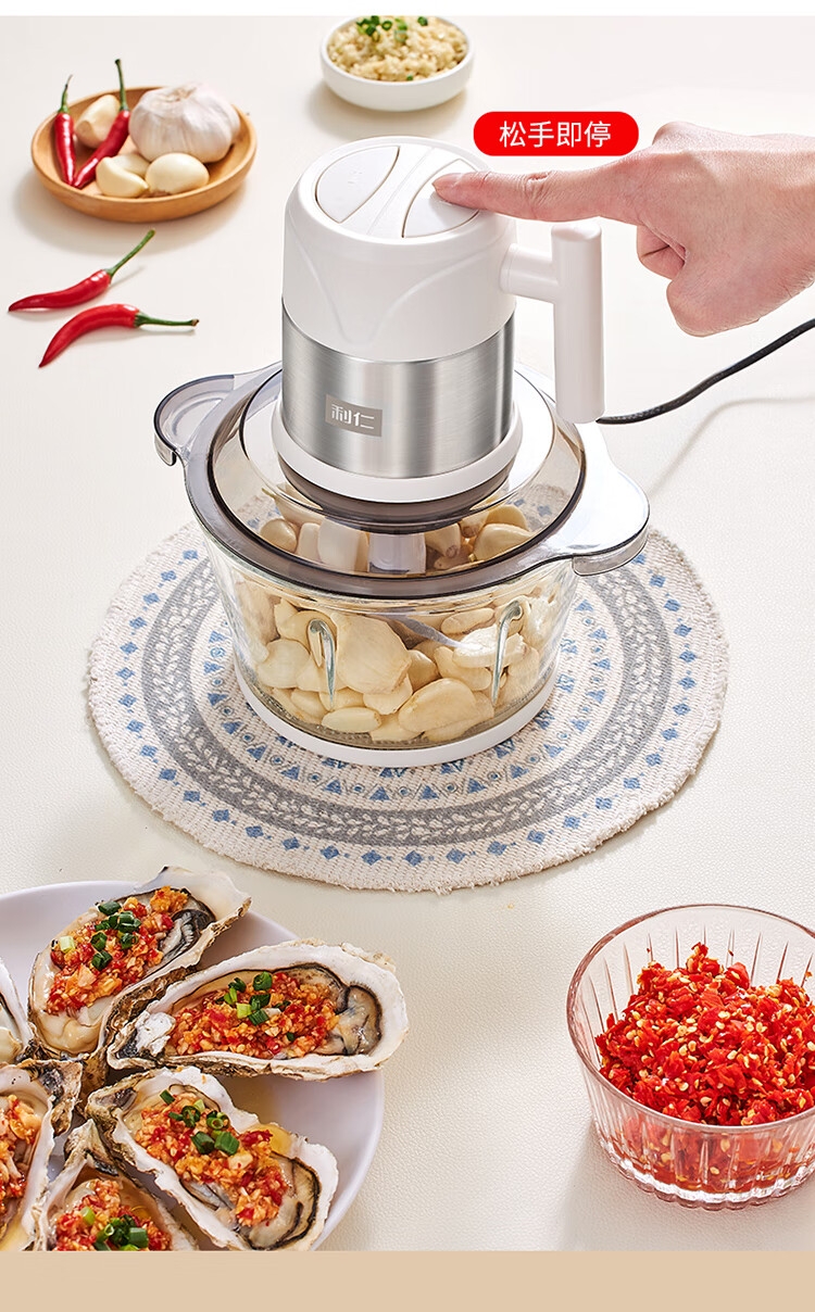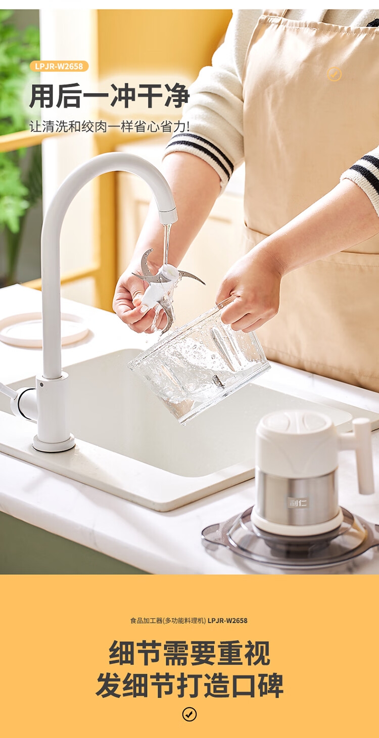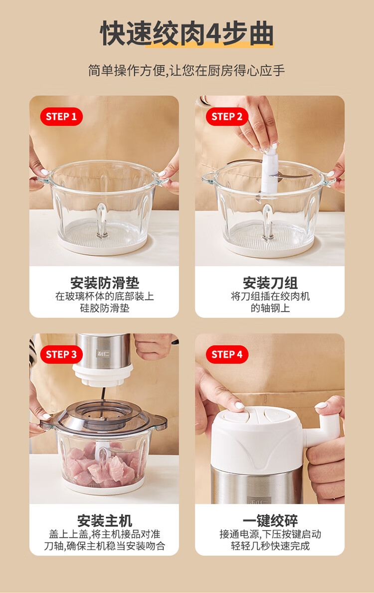 2L大容量 满足全家用量;双层立体4刀片 锋利速绞不塞肉;快慢两档 适合不同食材;加厚杯体 坚固耐用;一机多能 绞肉/蔬菜/辅食