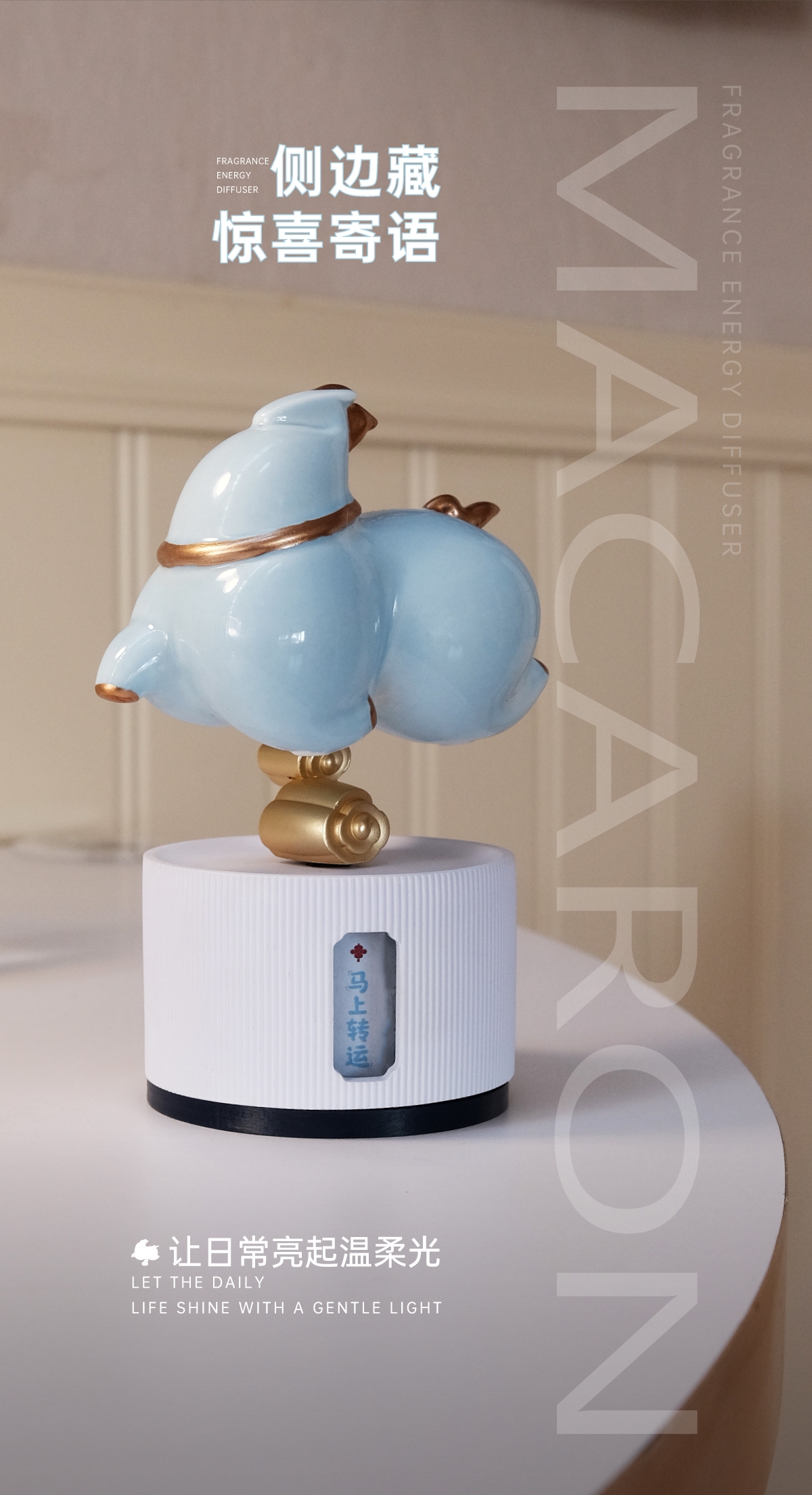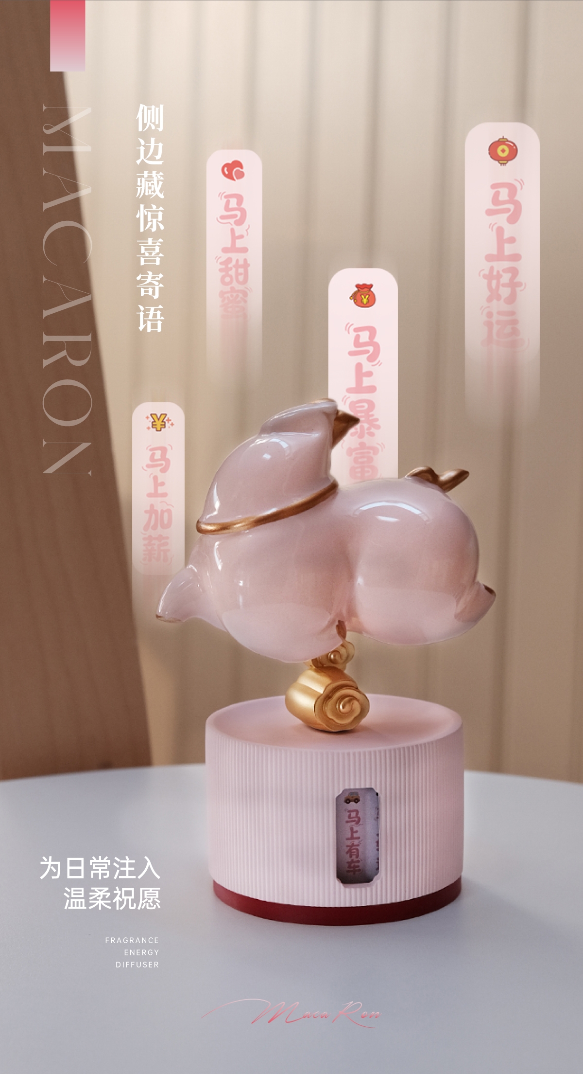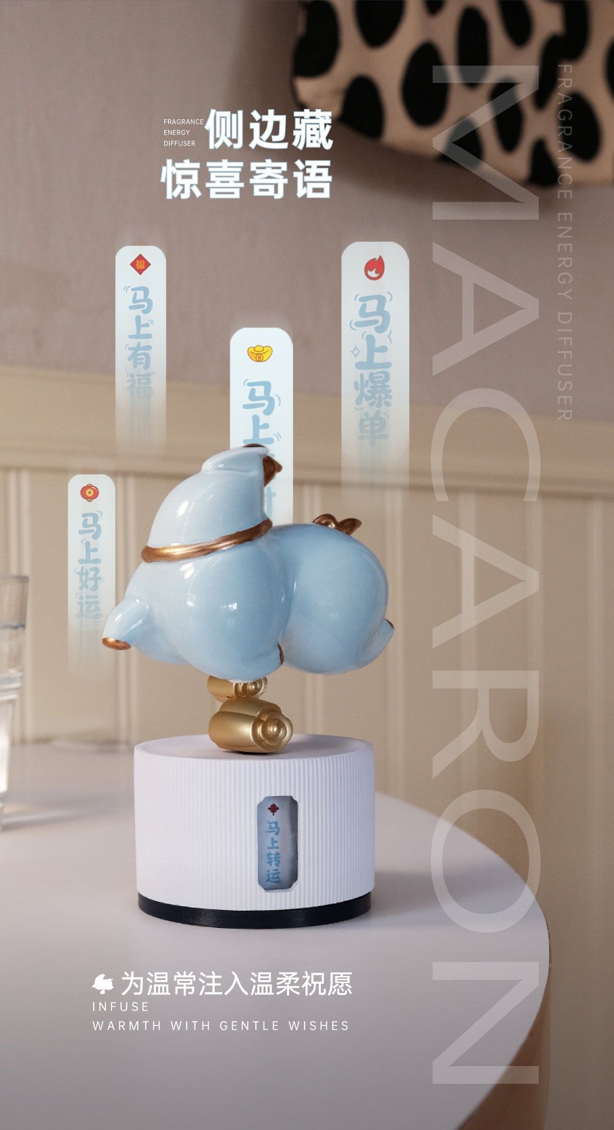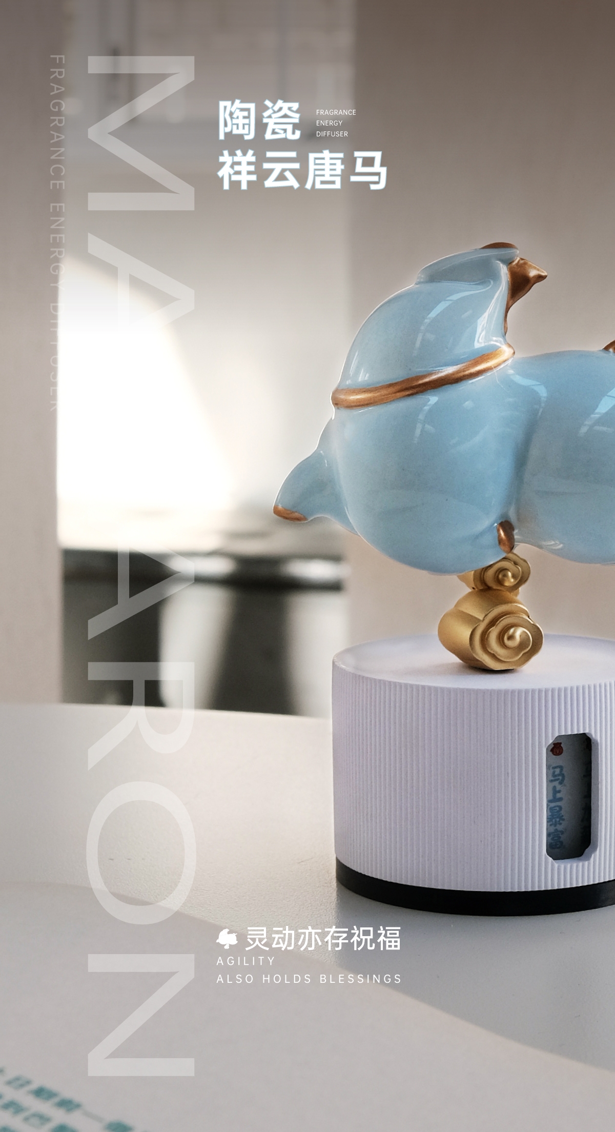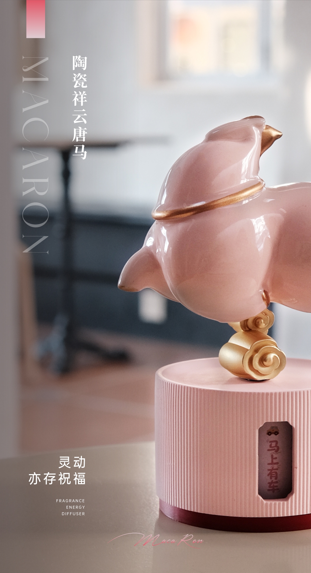 陶瓷祥云唐马,灵动亦存祝福;侧边藏惊喜寄语,为日常注入温柔祝愿;手动充能,香气续航,治愈身心的仪式感