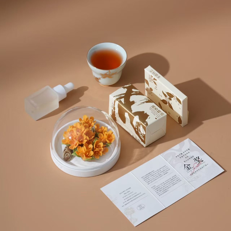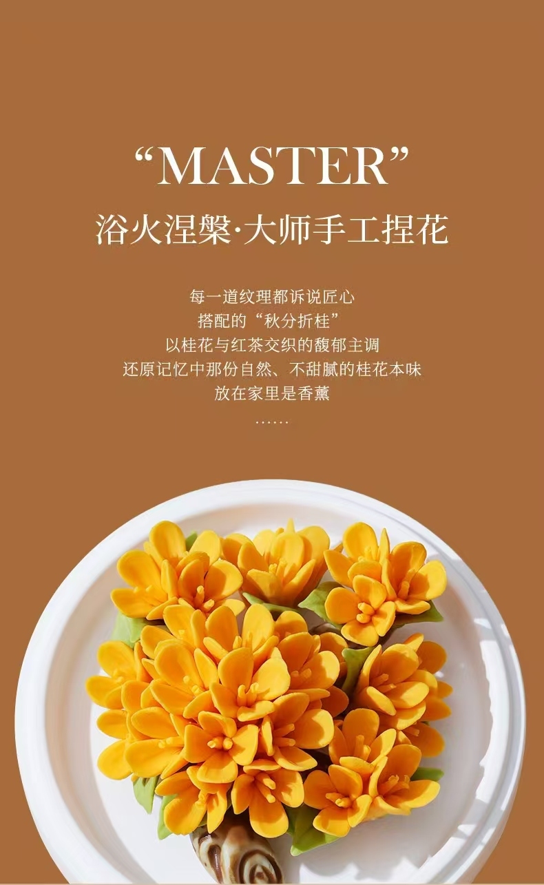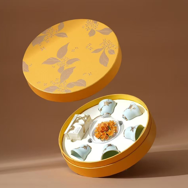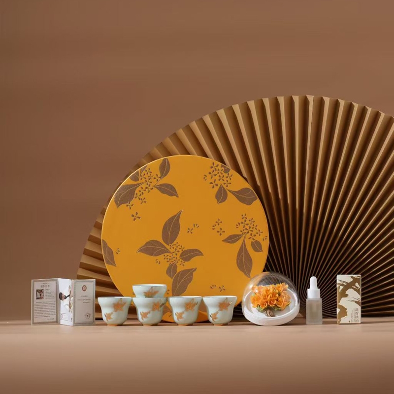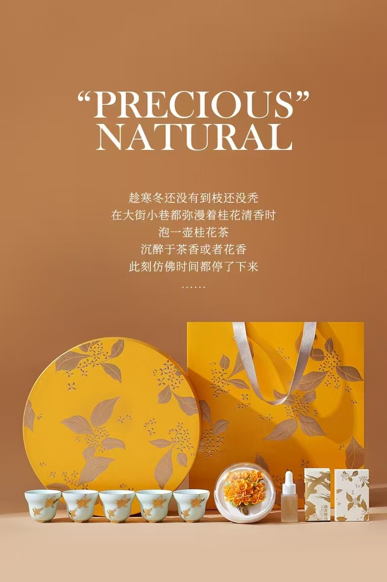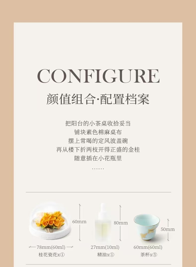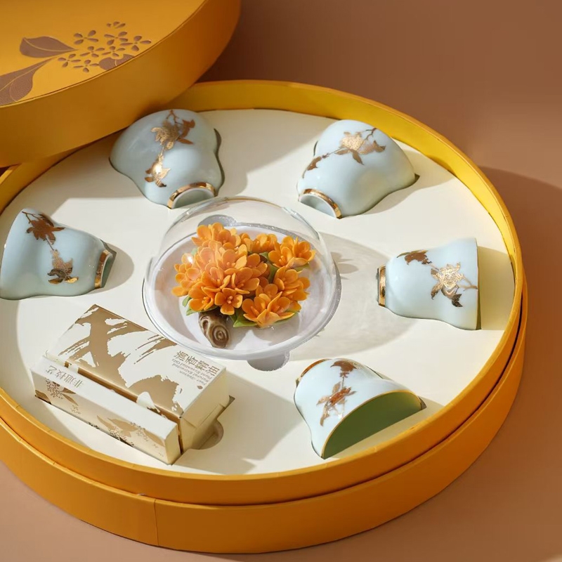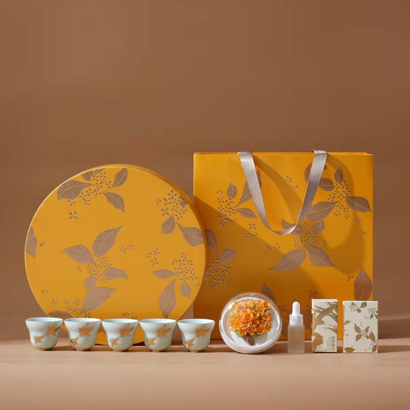 配制:1桂花瓷雕 5杯 1滴香精油 1证书圆形礼盒 手提袋