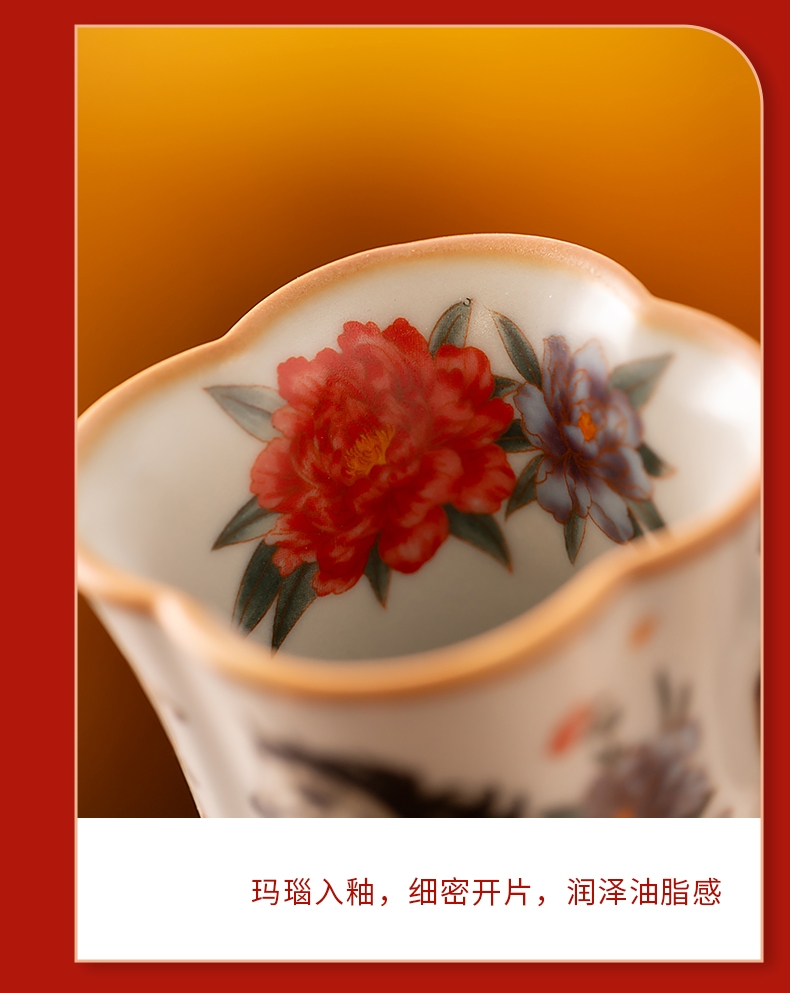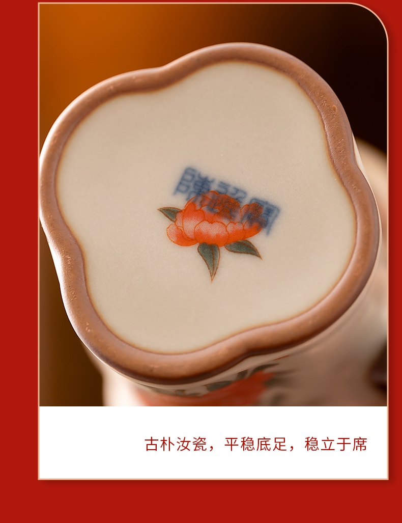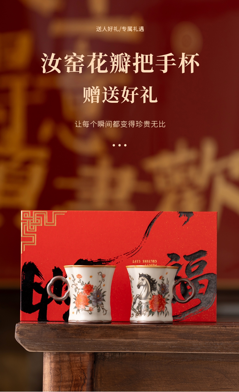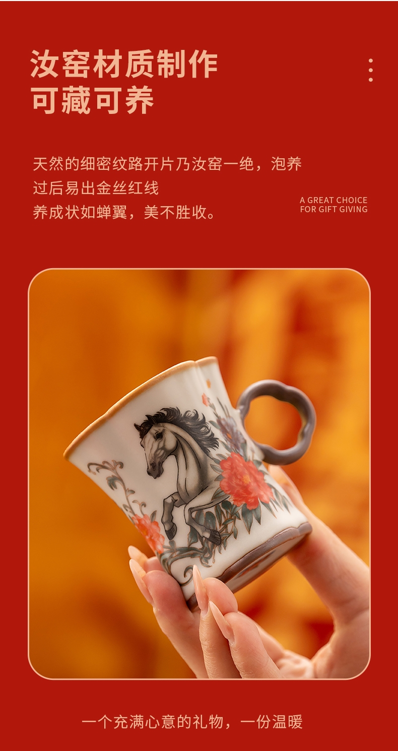 马上花开。亚黄汝瓷,玛瑙入釉,蝉翼开片,内外皆有花;家有千财万贯,不如汝窑一片。独家专利技术新品;画面堆料技术,富有立体浮雕质感,真实感强。杯身开片