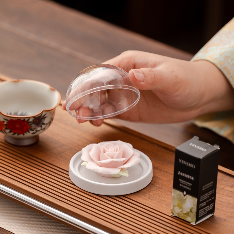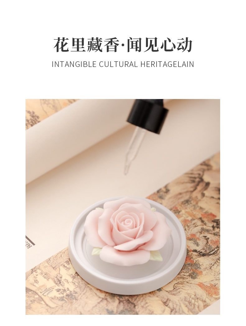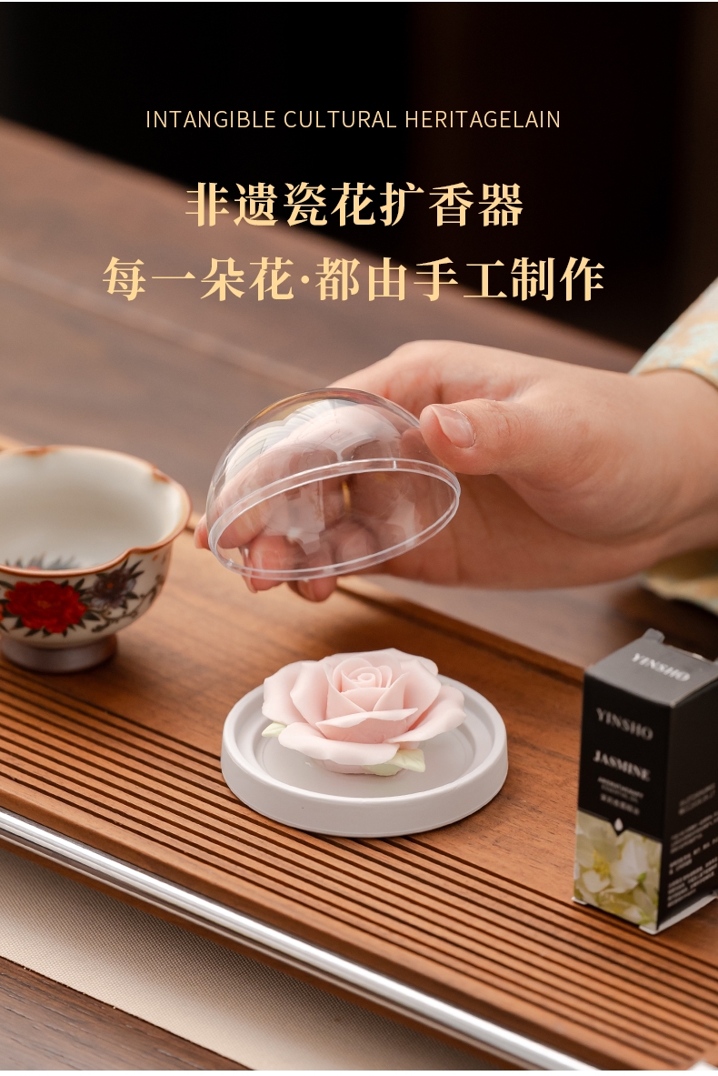 马上花开香薰套装,非遗文化手工瓷雕玫瑰,扩香器,;亚黄汝瓷,玛瑙入釉,蝉翼开片,内外皆有花面,;独家专利技术新品。画面堆料技术,富有立体浮雕质感,