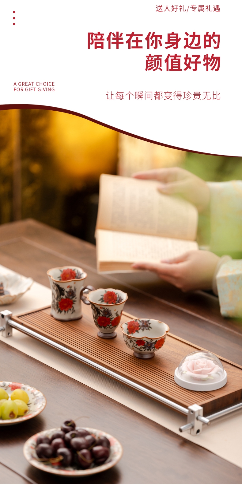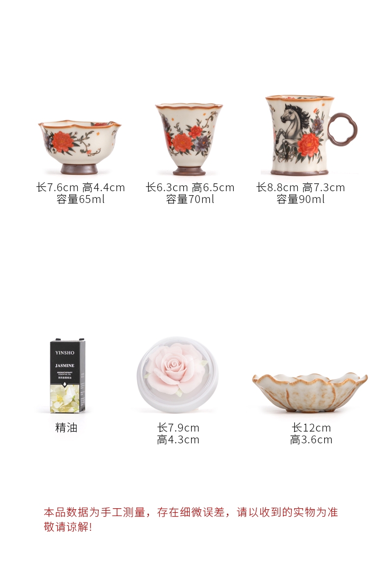 规格:手柄杯 6*9cm 闻香杯6.5*6.3cm 碗7.6*4.4cm 香盘12*3.6cm 玫瑰扩香器7.9*4.3cm