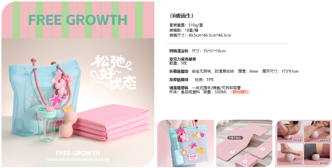 配置:网格清凉包 亚克力装饰徽章*5枚 折叠瑜伽垫 按摩筋膜球 弹盖吸管杯