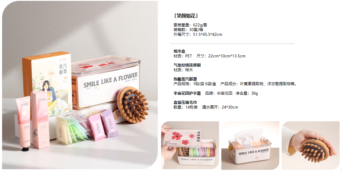 A款配置:纸巾盒 气垫经络按摩刷 热敷蒸汽眼罩 半亩花田护手霜 盒装压缩毛巾
