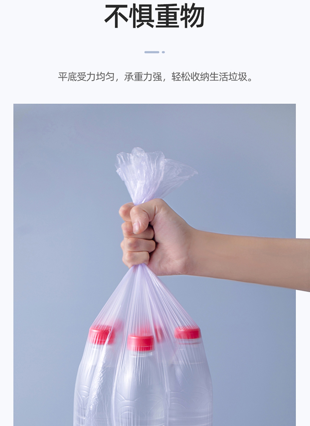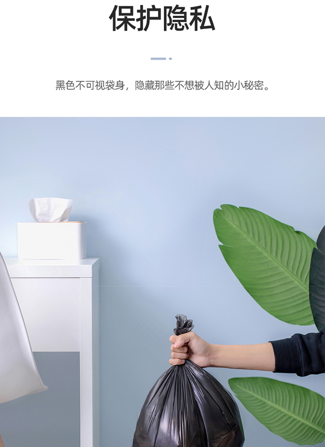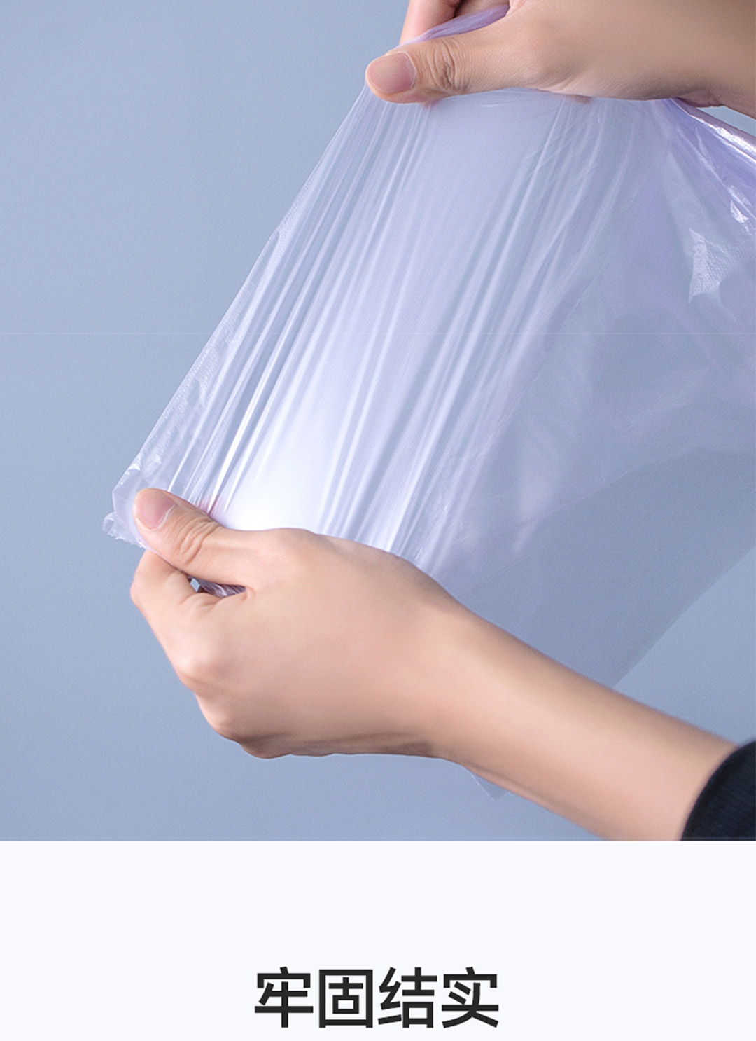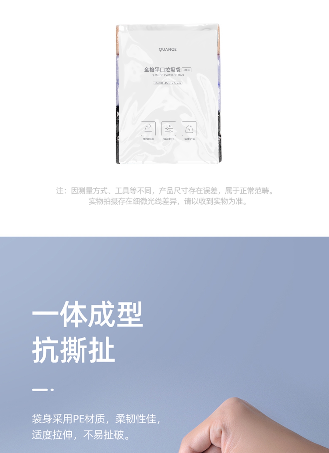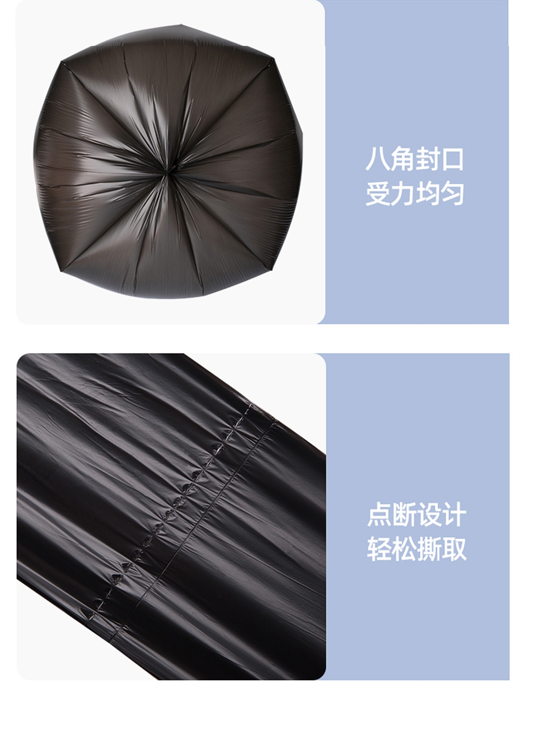 45x55cm大尺寸垃圾袋 一体成型,不易扯破;恒温封口工艺,点断设计,不易撕取;八角封口,受力均匀,承重力强,防漏设计