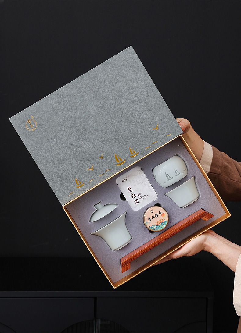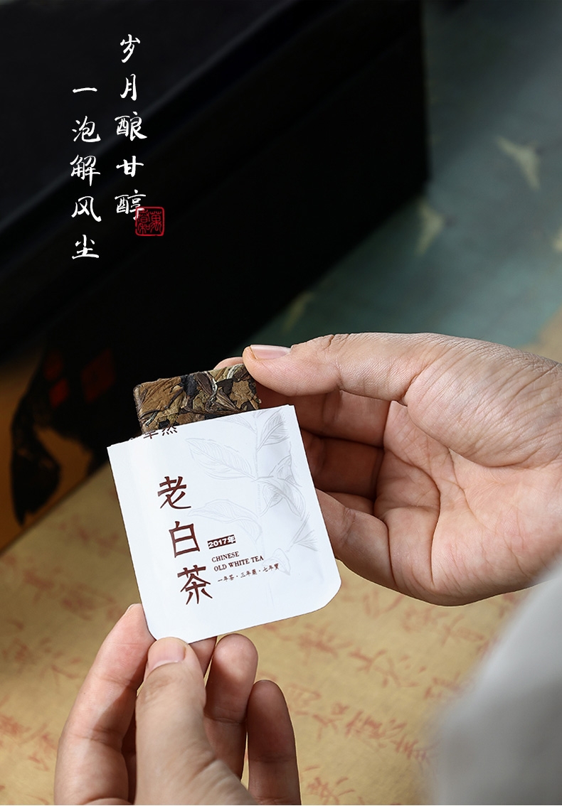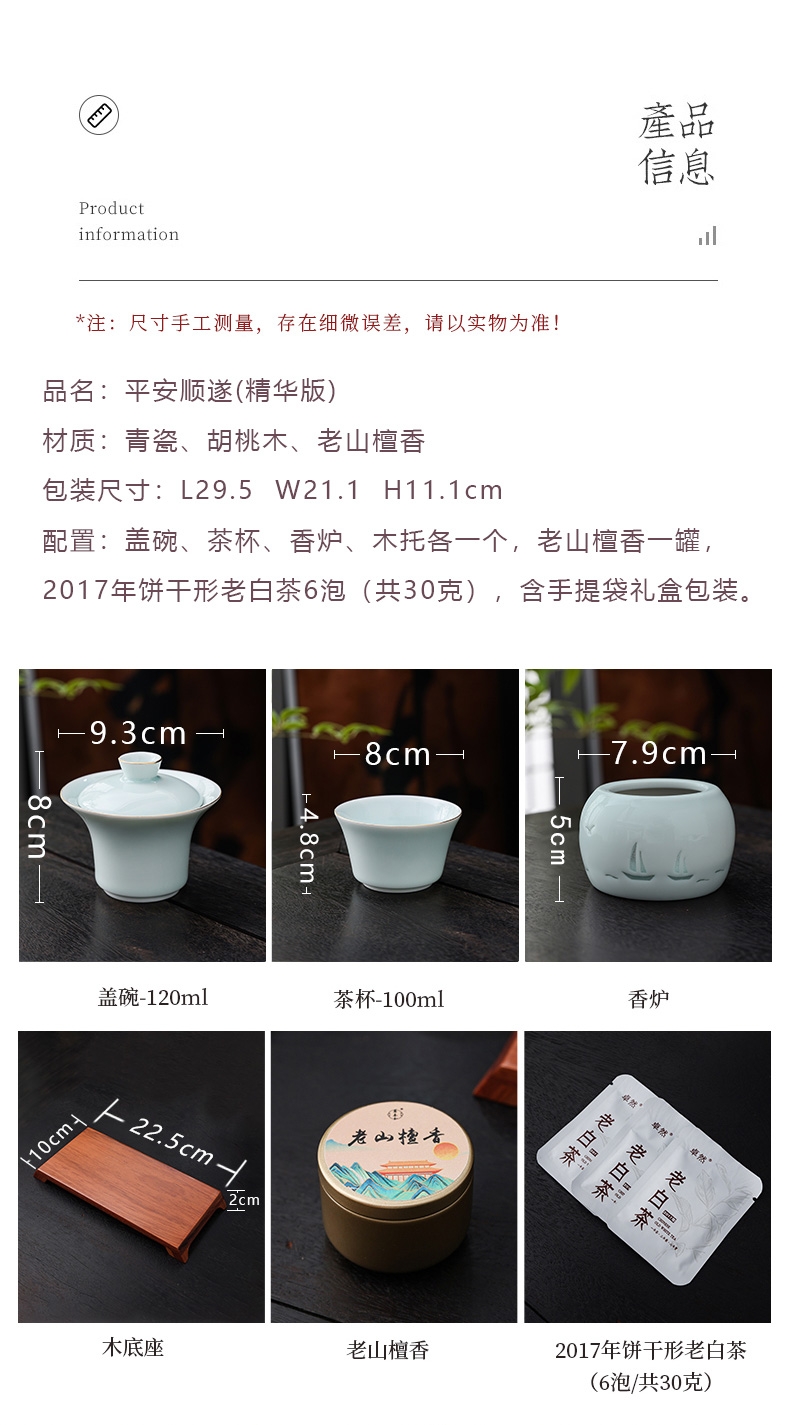 配置清单:盖碗、茶杯、香炉、木托各一个,老山檀香一罐,2017年饼干形老白茶6泡(共30克),含手提袋礼盒包装。