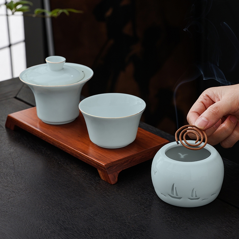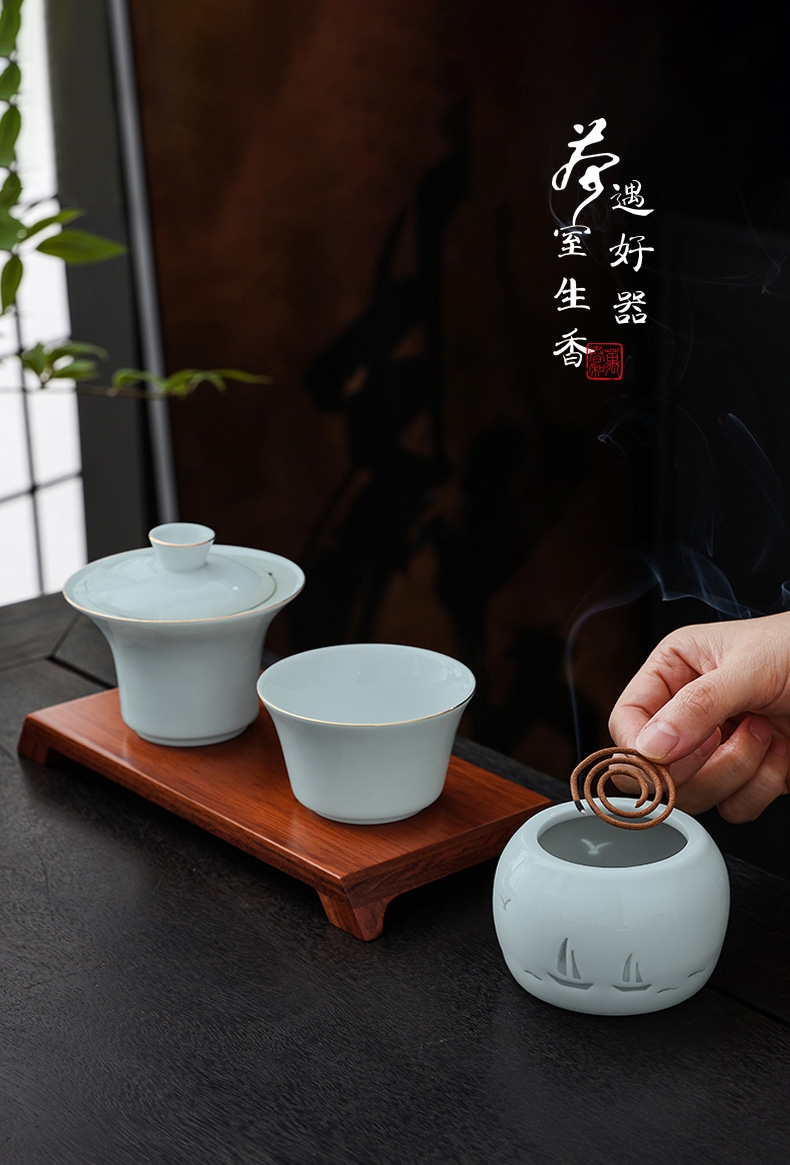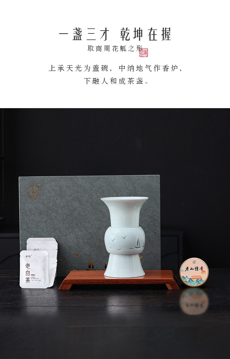 东方花觚为灵感,融茶香三器,品茶焚香,仪式感十足;花瓶寓平安,香炉刻祥纹,日常茶事伴美好祝愿;配老白茶与檀香,品茶闻香,开启沉浸式感官体验