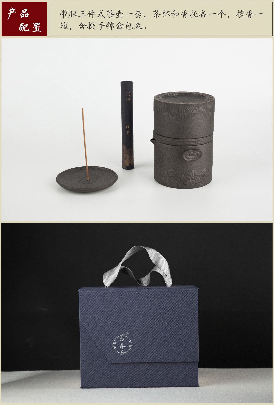 配置清单:带胆三件式茶壶一套,茶杯和香托各一个,檀香一罐,含提手锦盒包装。