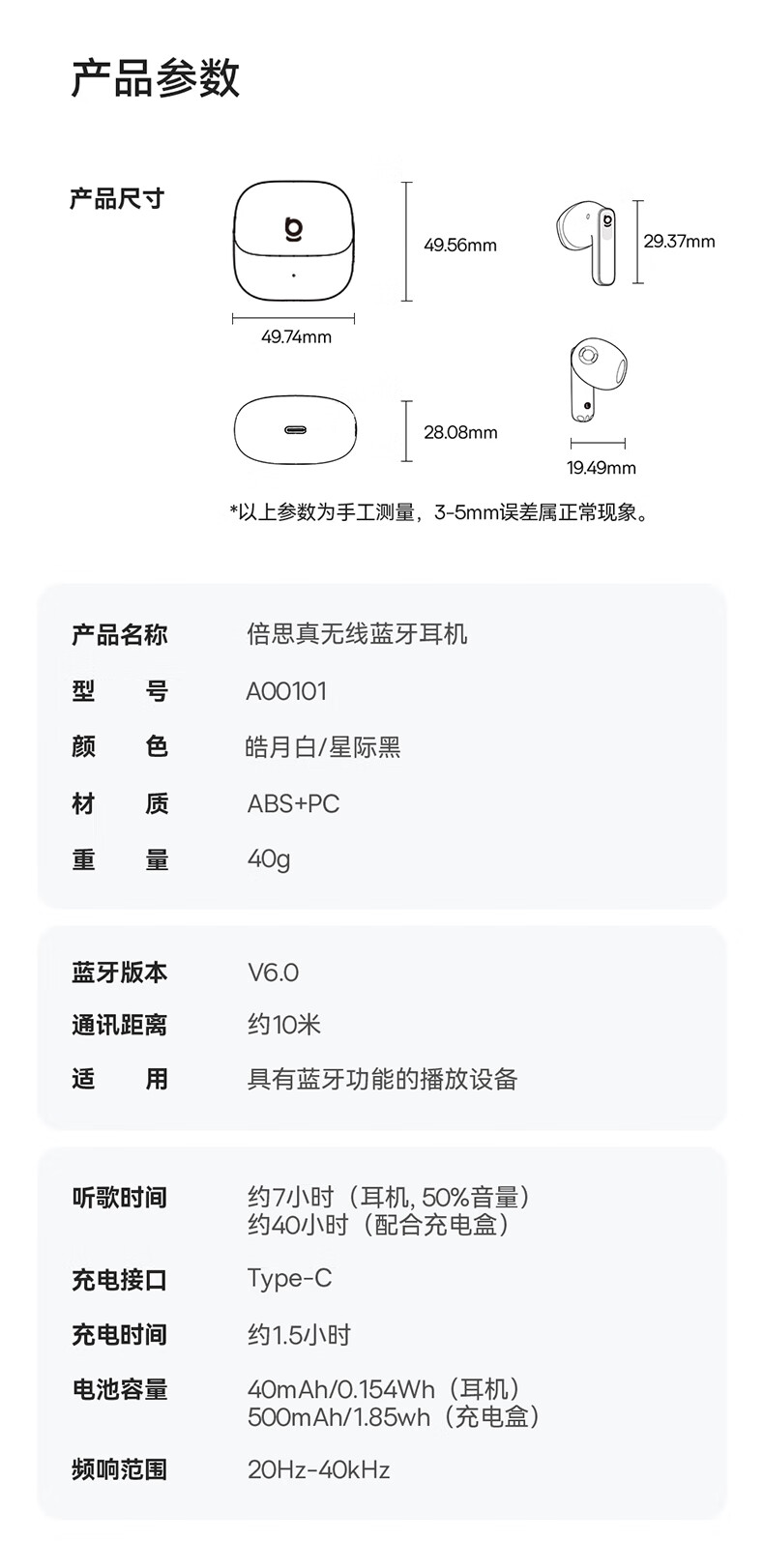 电池容量:耳机40mAh 充电仓500mAh