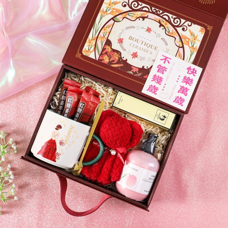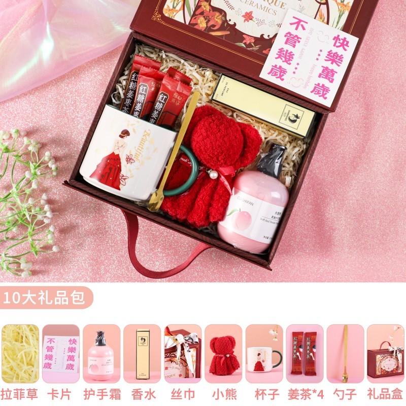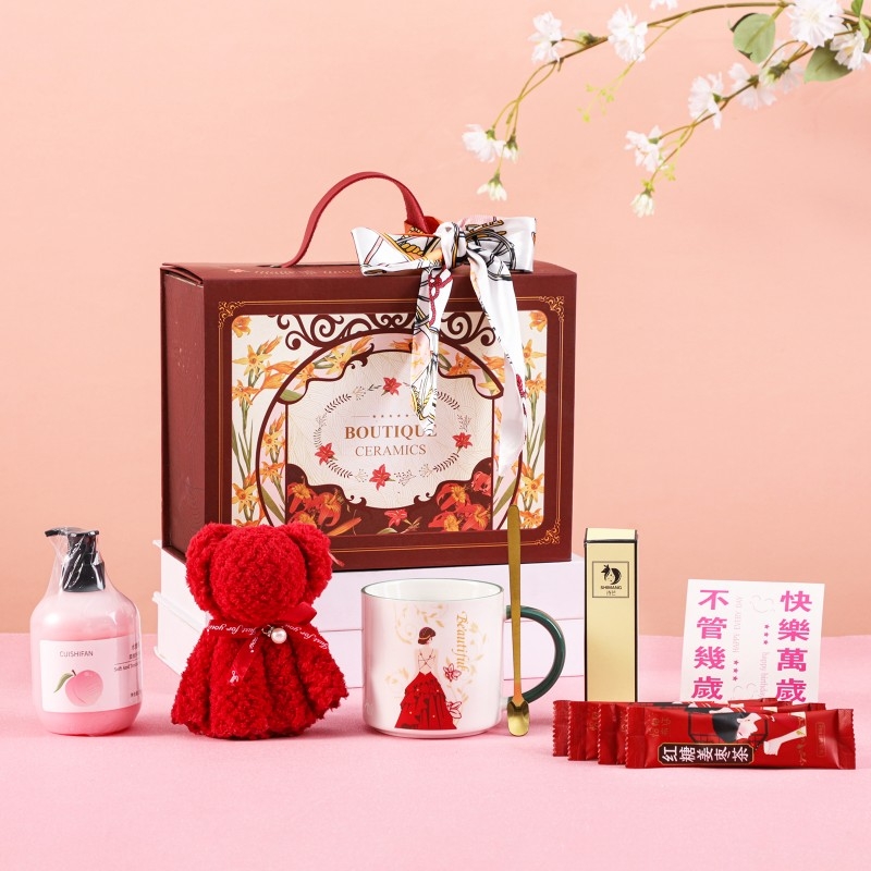 打开复古红金礼盒的瞬间,仪式感拉满;【女神杯 + 姜茶】暖心暖胃,呵护日常;高级香水】自带氛围感,走路都带风;【樱花护手霜】滋润双手,留住春日香气;小熊公仔和丝巾点缀,把 “快乐万岁” 的祝福送给她