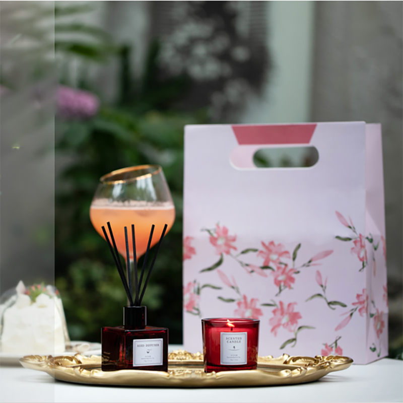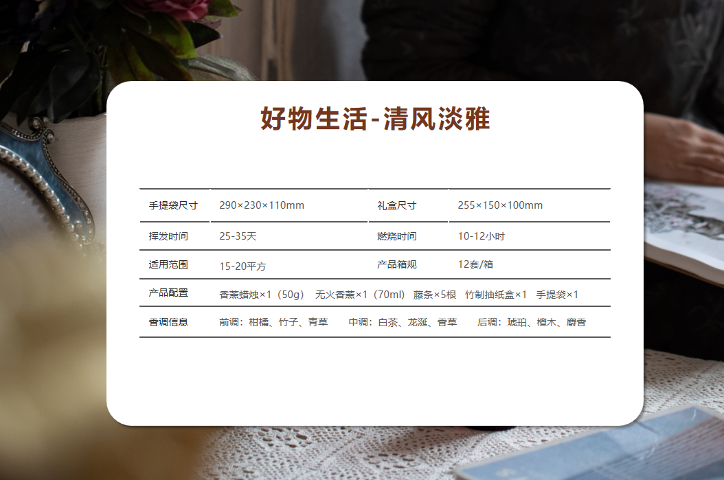 配置:香薰蜡烛×1(50g) 无火香薰×1(70ml) 藤条×5根 竹制抽纸盒×1 手提袋×1