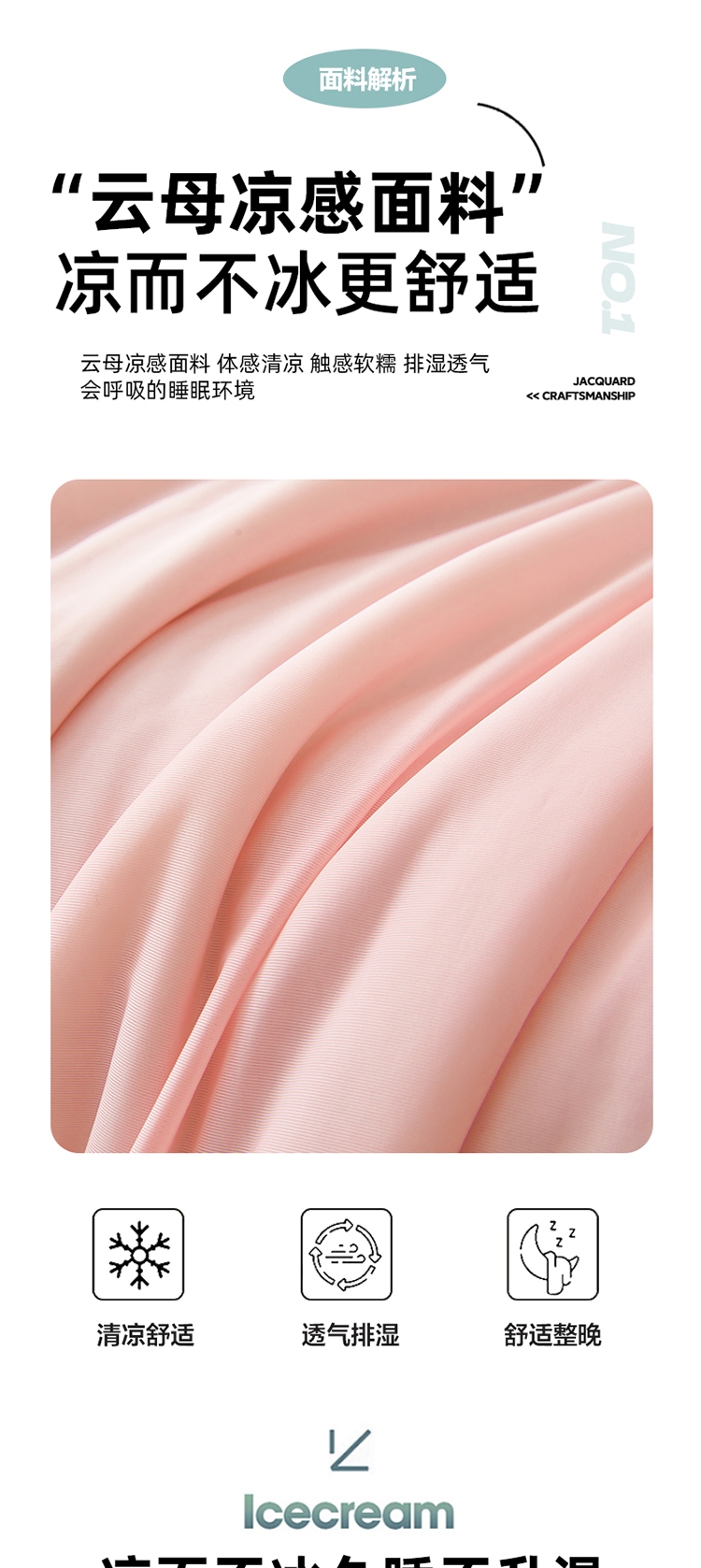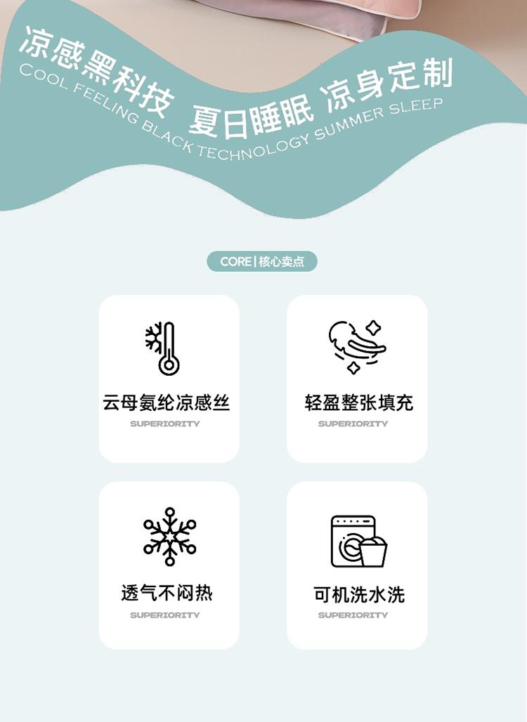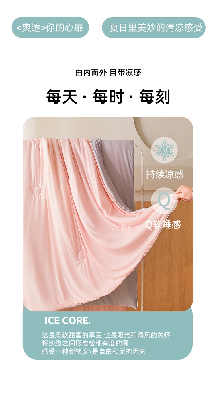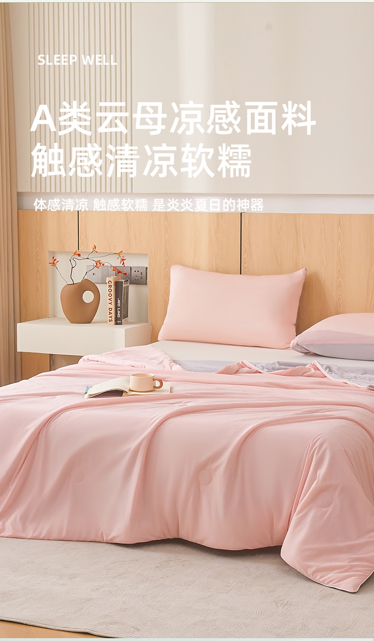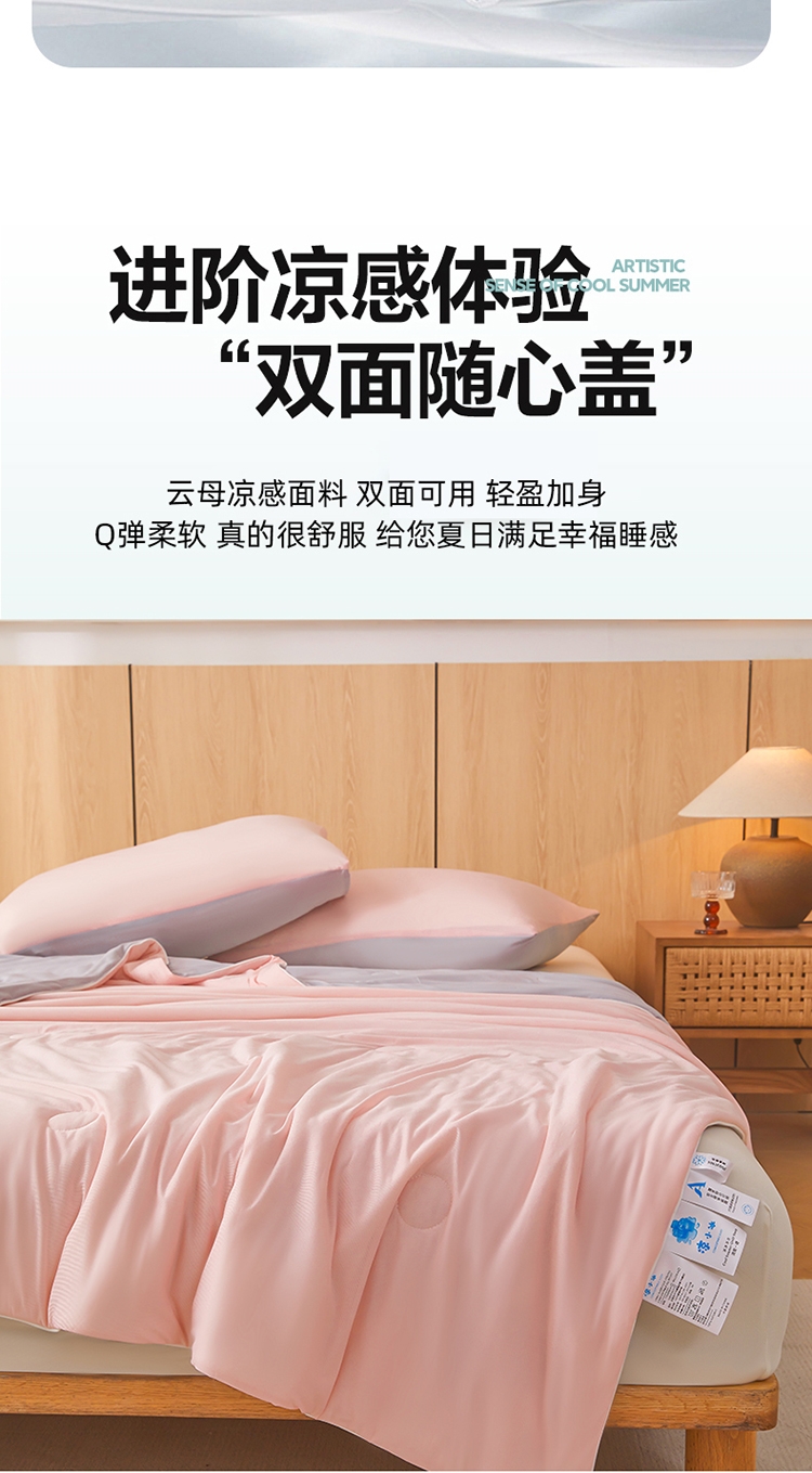 云母凉感面料体感清凉触感软糯排湿透气会呼吸的睡眠环;清凉夏日体验清凉触感(云母氨纶凉感丝夏凉被);凉而不冰,母婴级面料,舒适裸睡