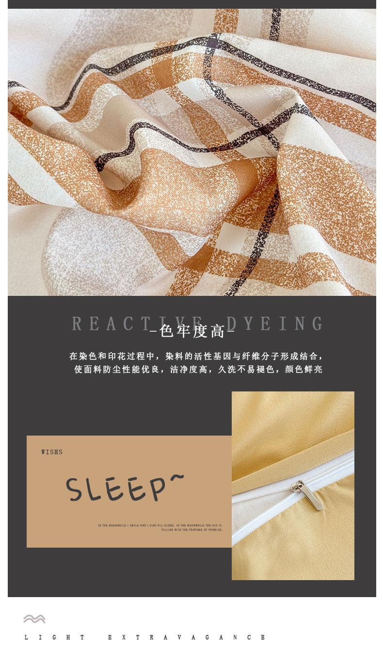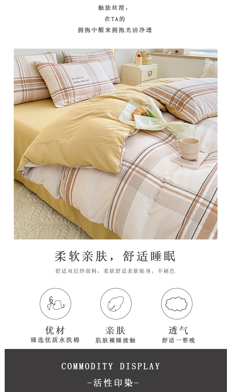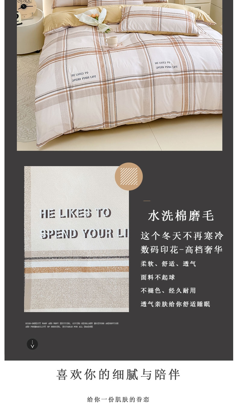 舒适睡眠每一天 A类水洗棉磨毛双层纱四件套;水洗棉磨毛,柔软、舒适、透气面料不起球不褪色、;隐藏式金属拉链 ,直角印花床单