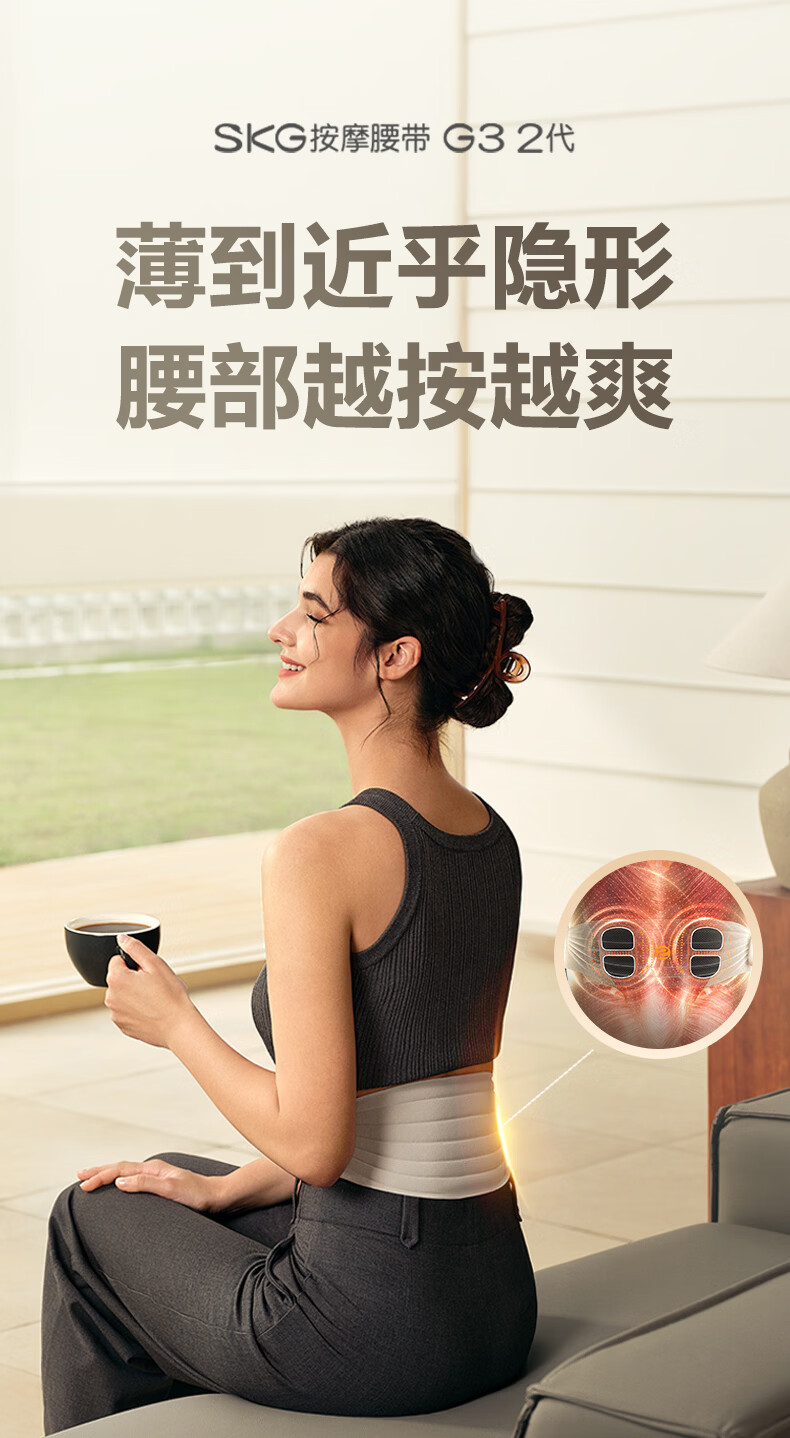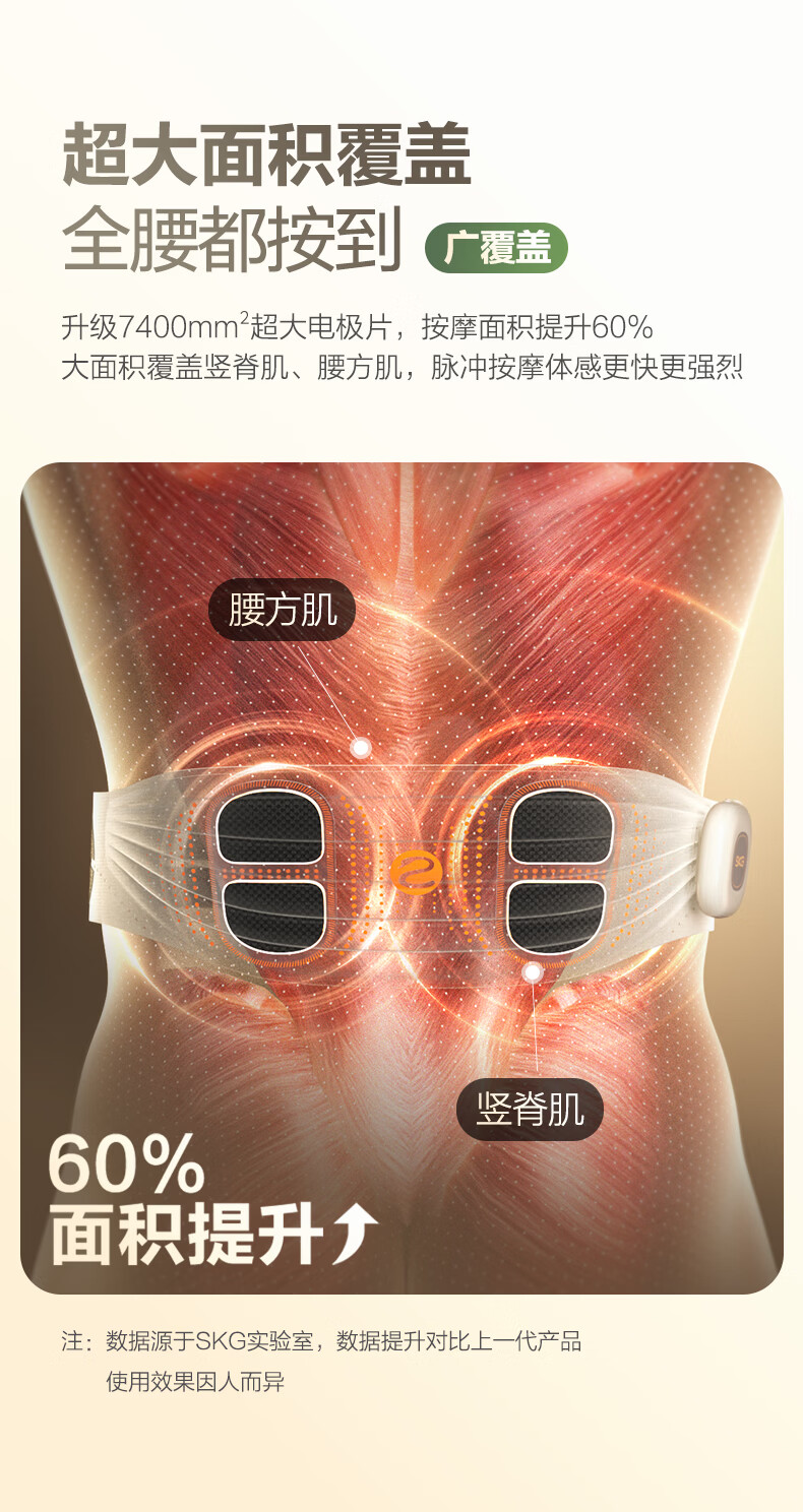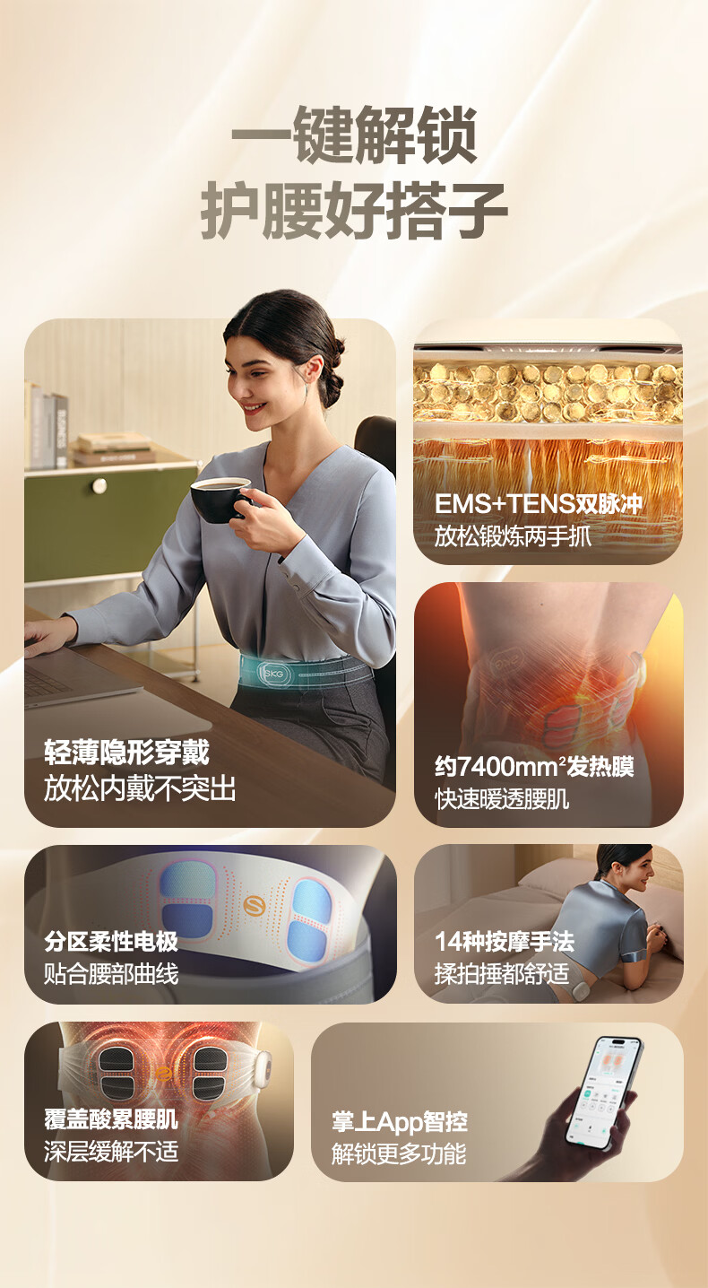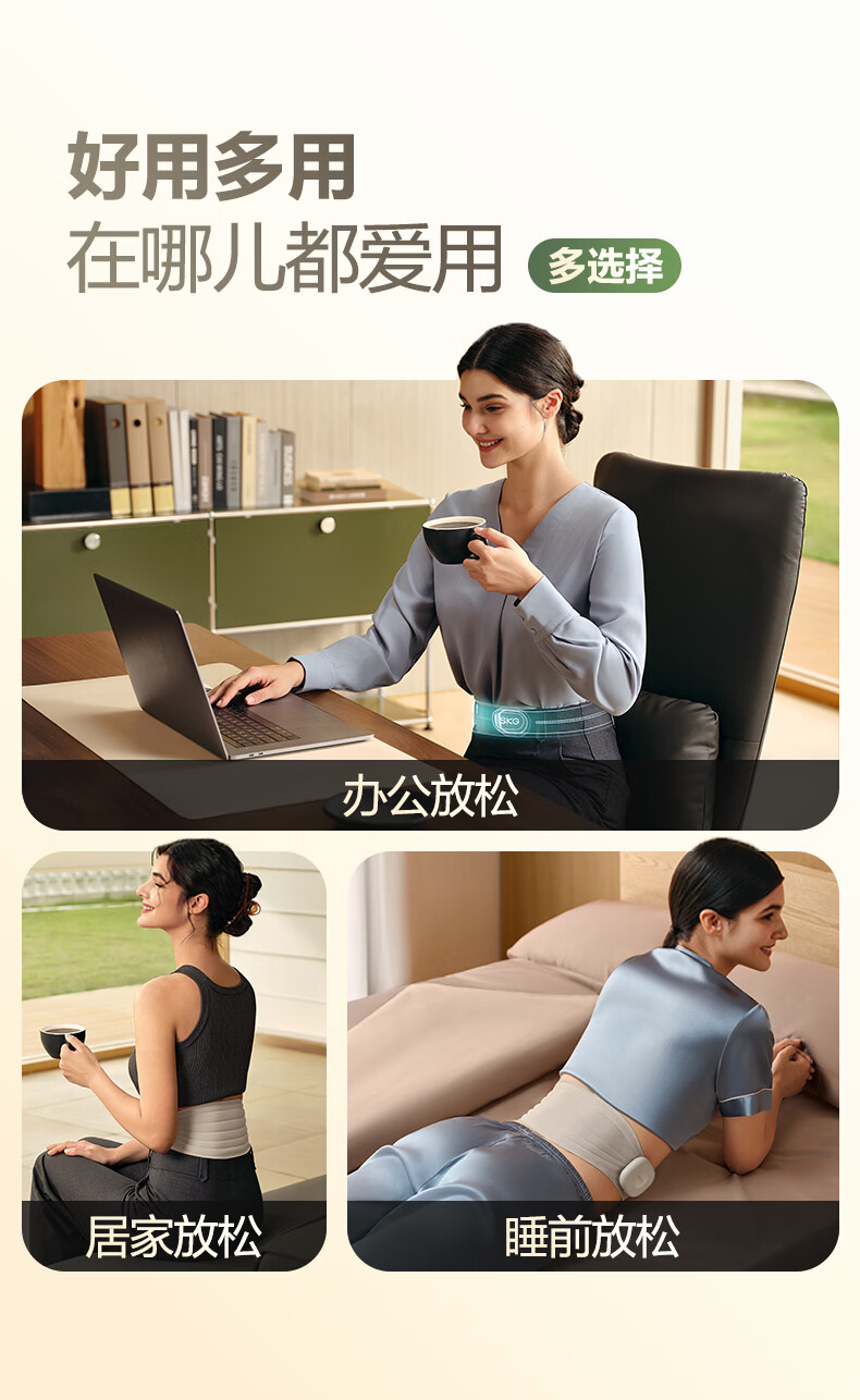 轻薄隐形穿戴,放松内戴不突出;分区柔性电极,贴合腰部曲线;14种按摩手法,揉拍捶都舒适