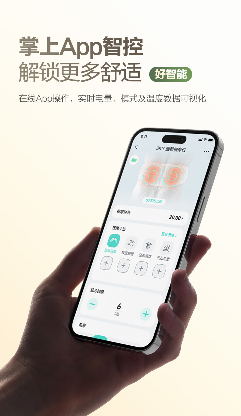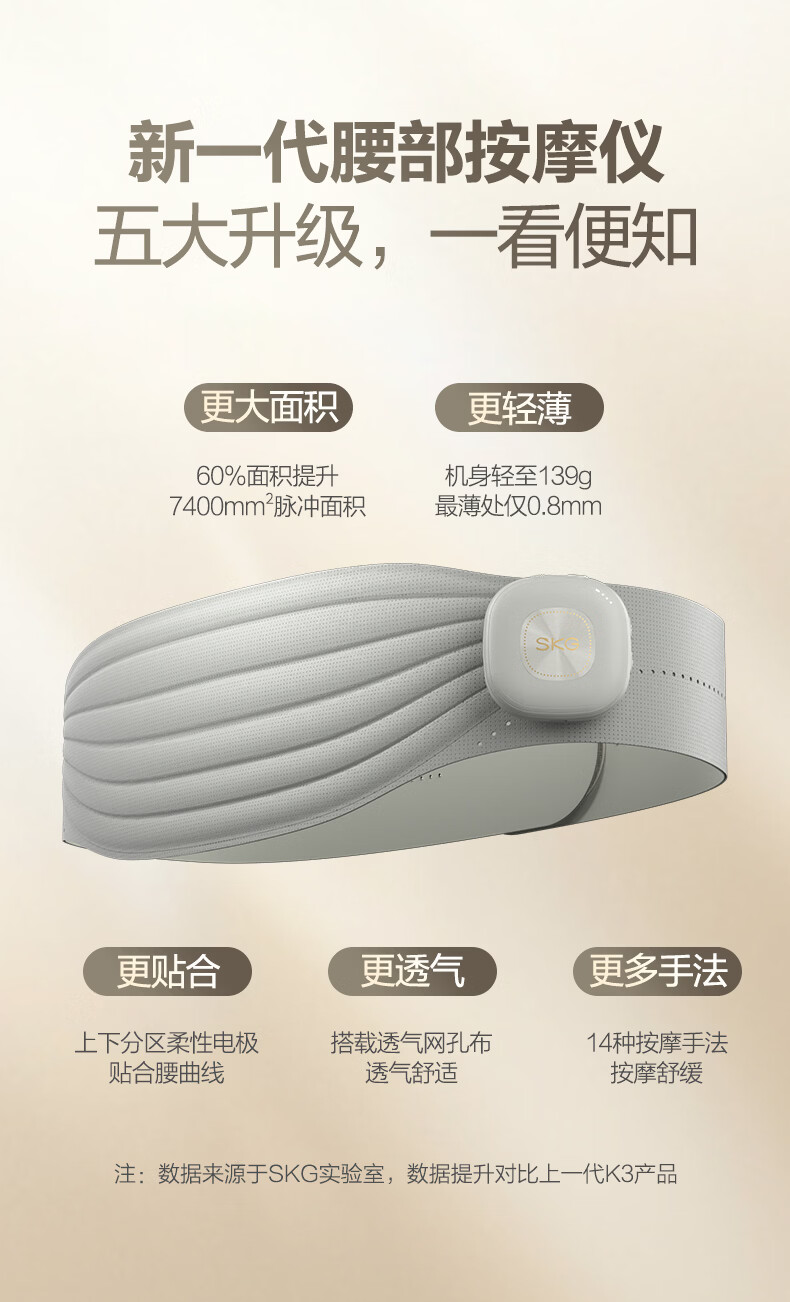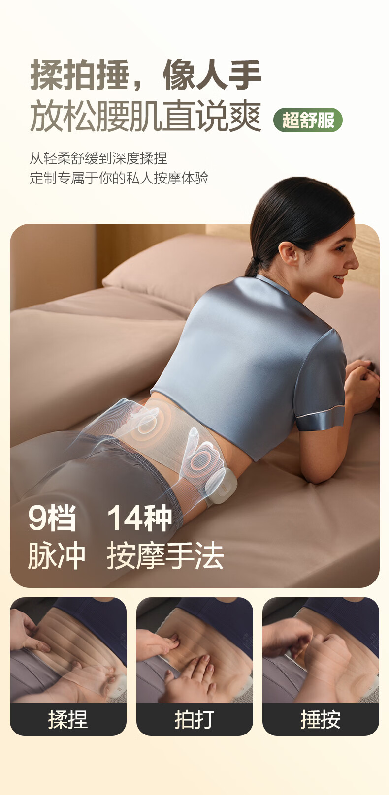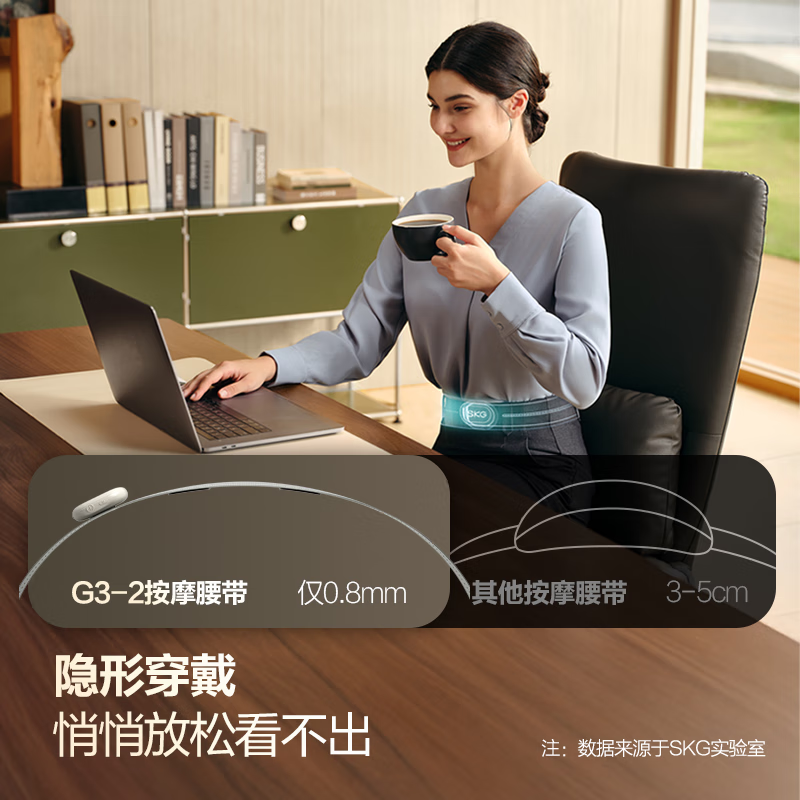 轻薄隐形穿戴,放松内戴不突出;分区柔性电极,贴合腰部曲线;14种按摩手法,揉拍捶都舒适