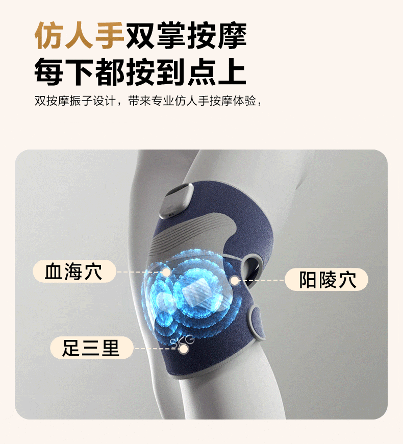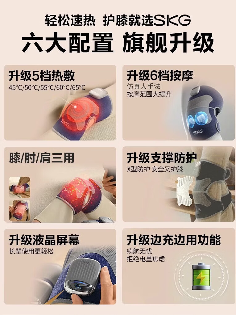 五档温度 科学调节;SKG远红外聚能热,科学设温;6档按摩 5档温度30种护膝享受
