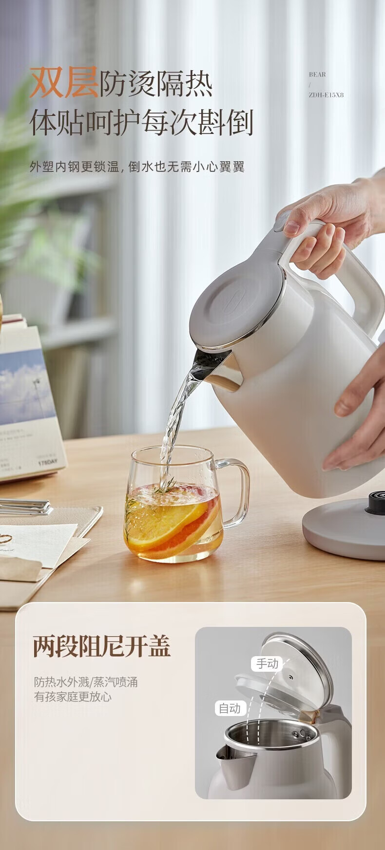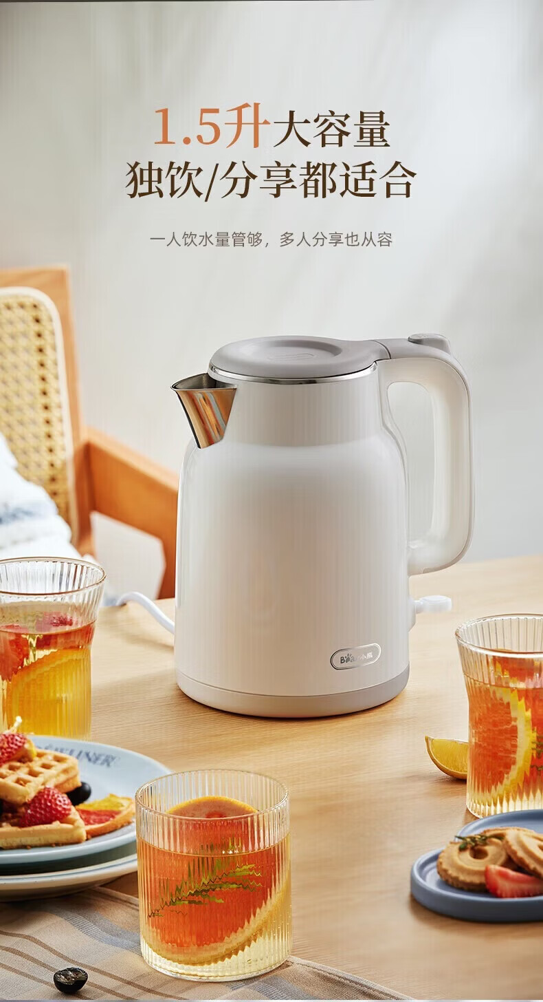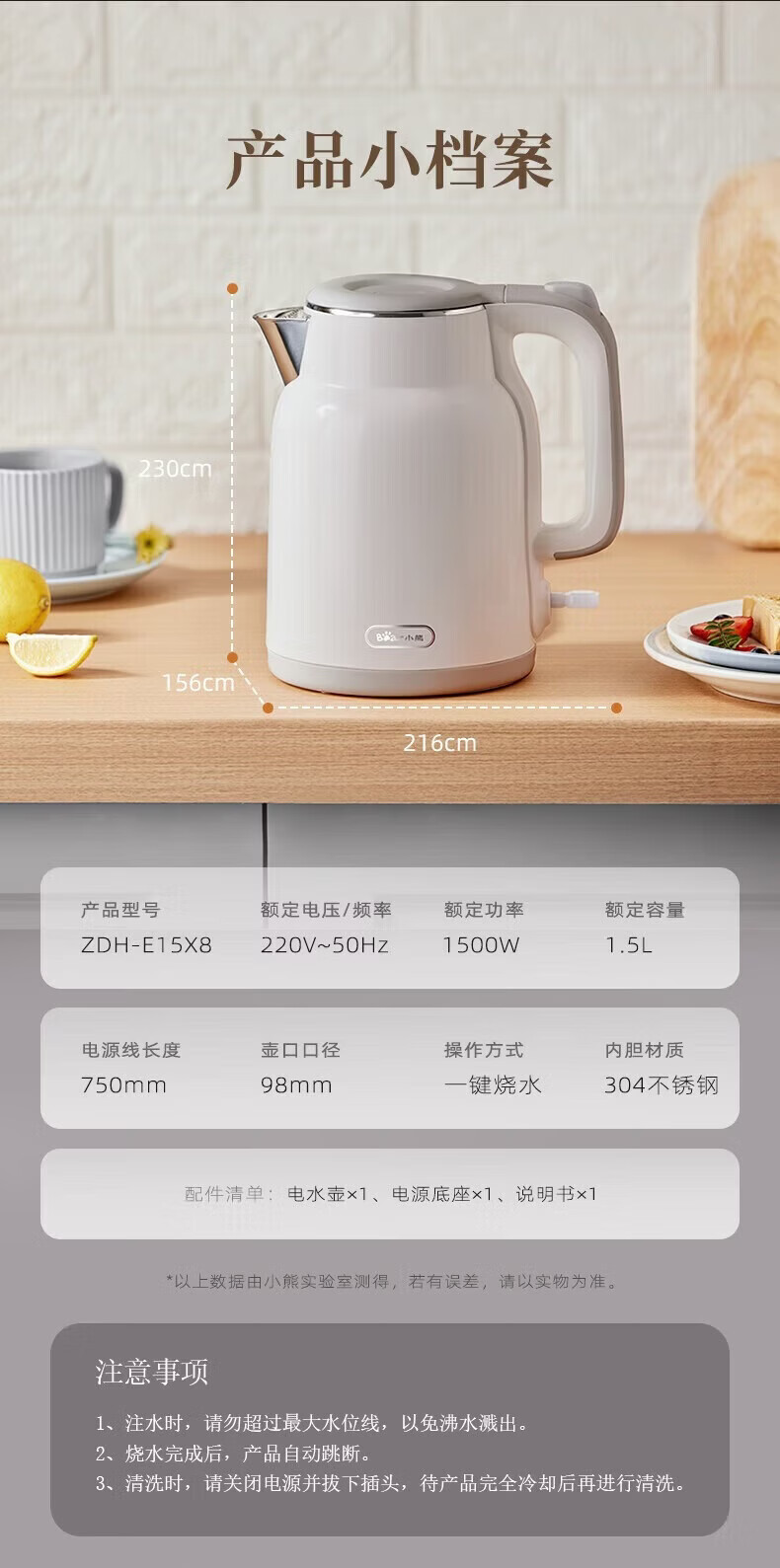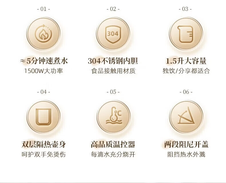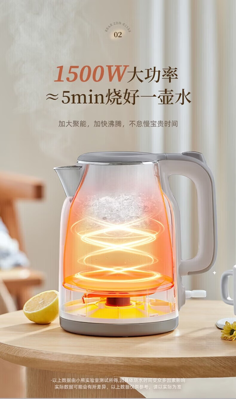 ≈5分钟速煮水(1500W大功率 );1.5升大容量(独饮/分享都适合 ) ;双层隔热壶身(呵护双手免烫伤 )