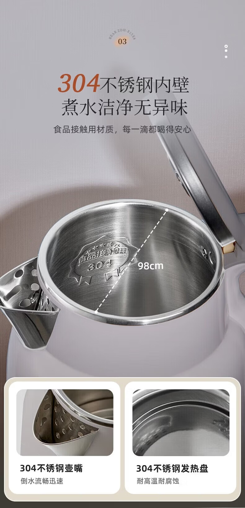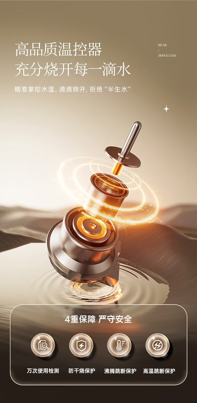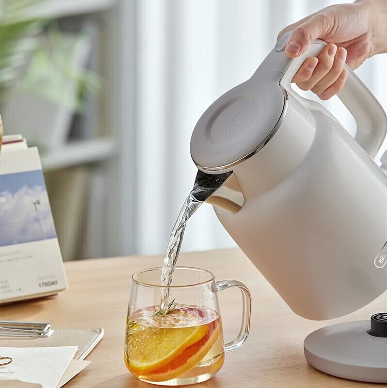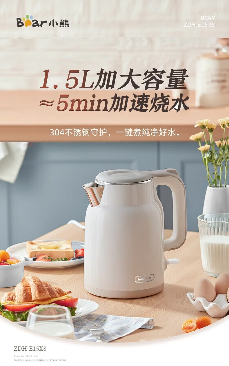 ≈5分钟速煮水(1500W大功率 );1.5升大容量(独饮/分享都适合 ) ;双层隔热壶身(呵护双手免烫伤 )