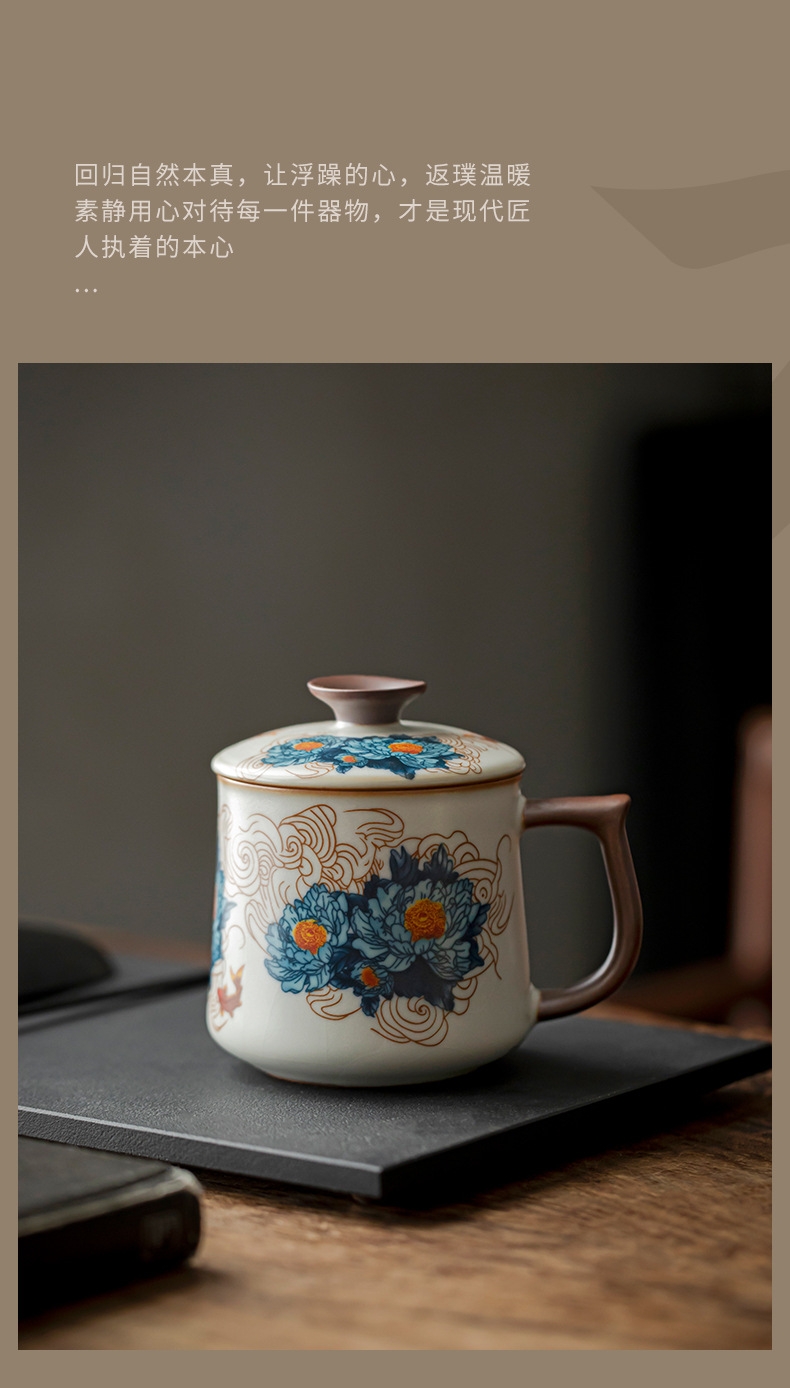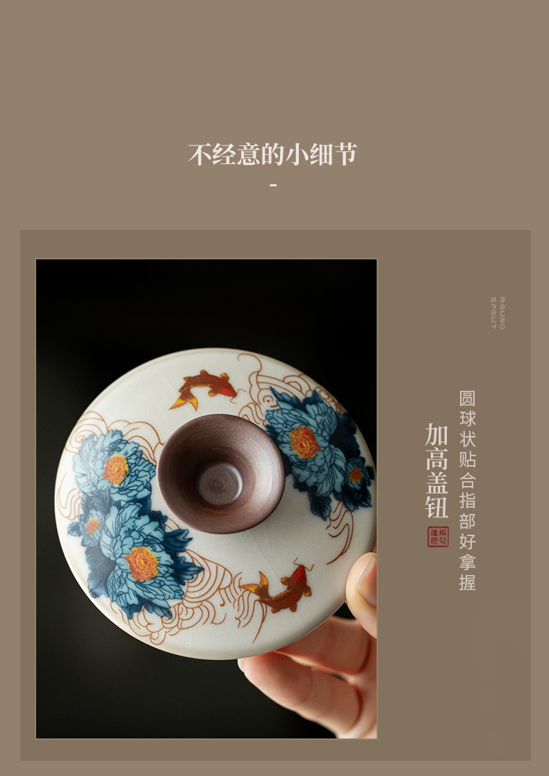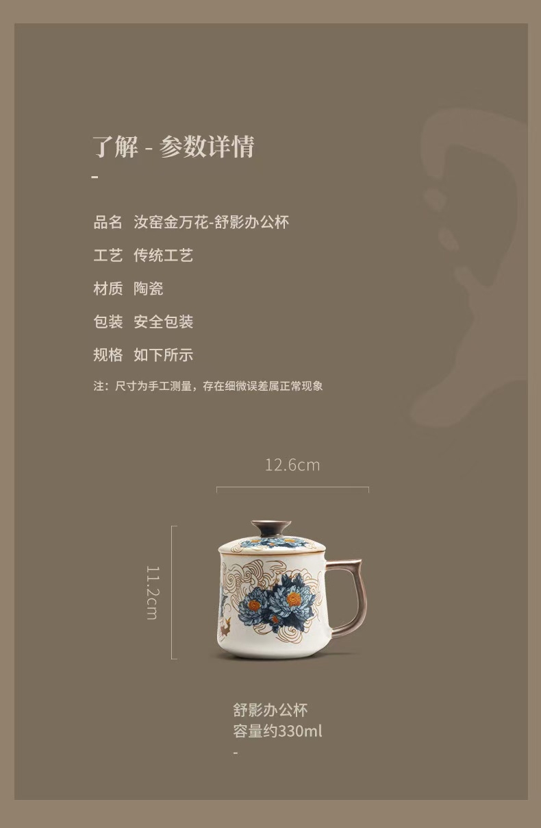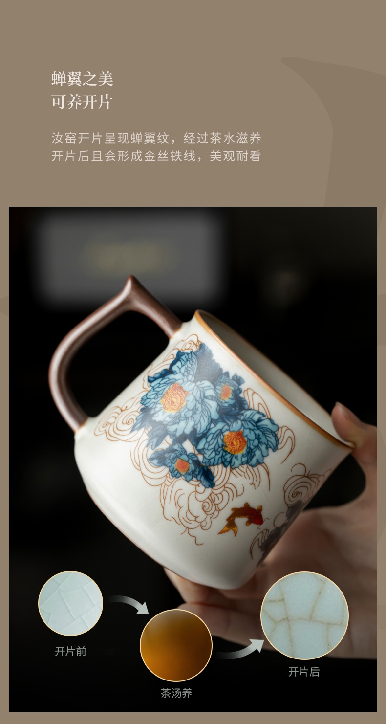 亚黄汝瓷,玛瑙入釉,蝉翼开片,家有千财万贯;不如汝窑一片,独家专利技术新品。画面堆料技术,;真实感强。杯身开片,可养瓷。