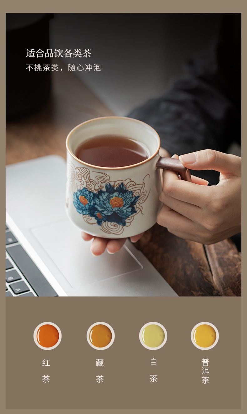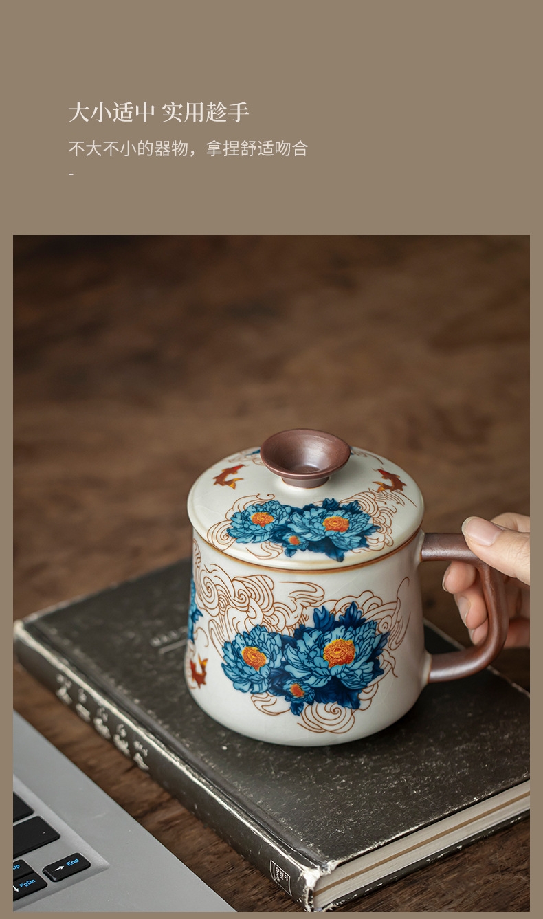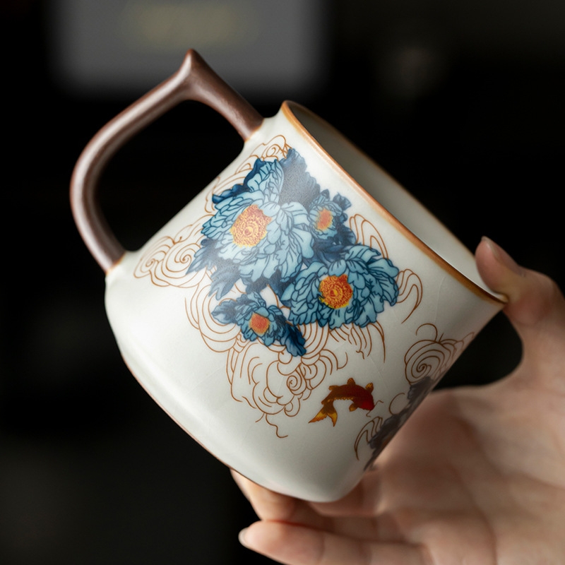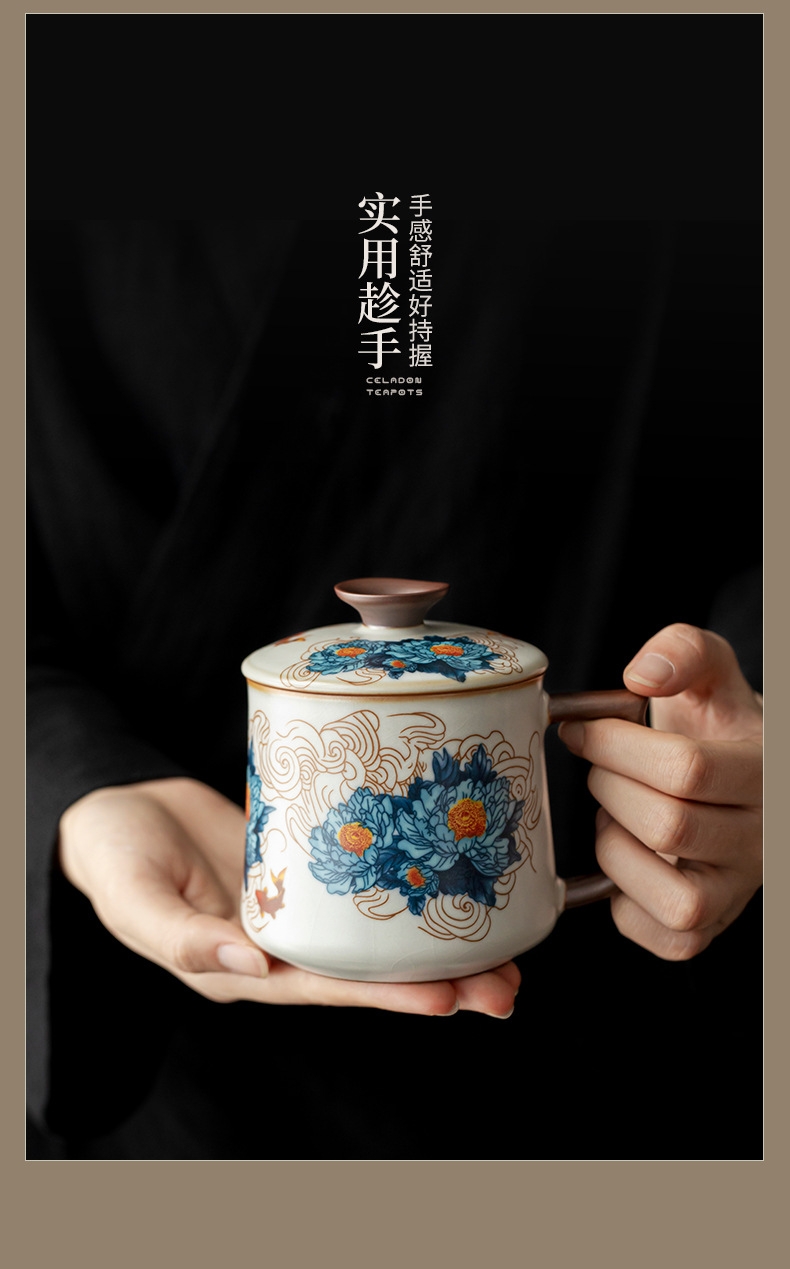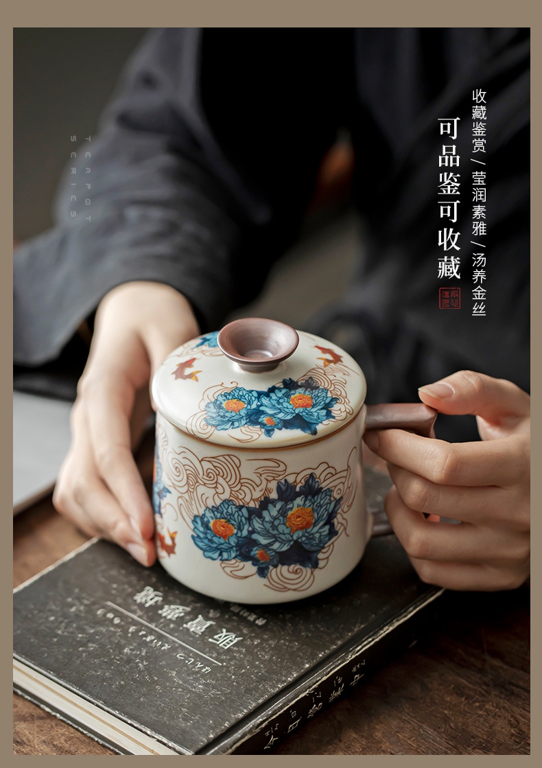亚黄汝瓷,玛瑙入釉,蝉翼开片,家有千财万贯;不如汝窑一片,独家专利技术新品。画面堆料技术,;真实感强。杯身开片,可养瓷。