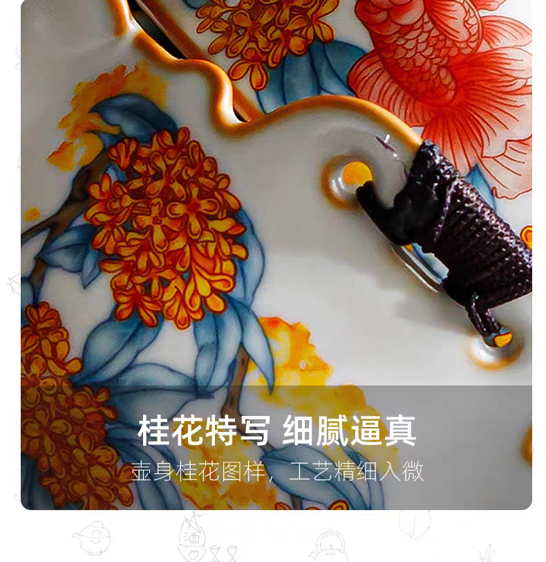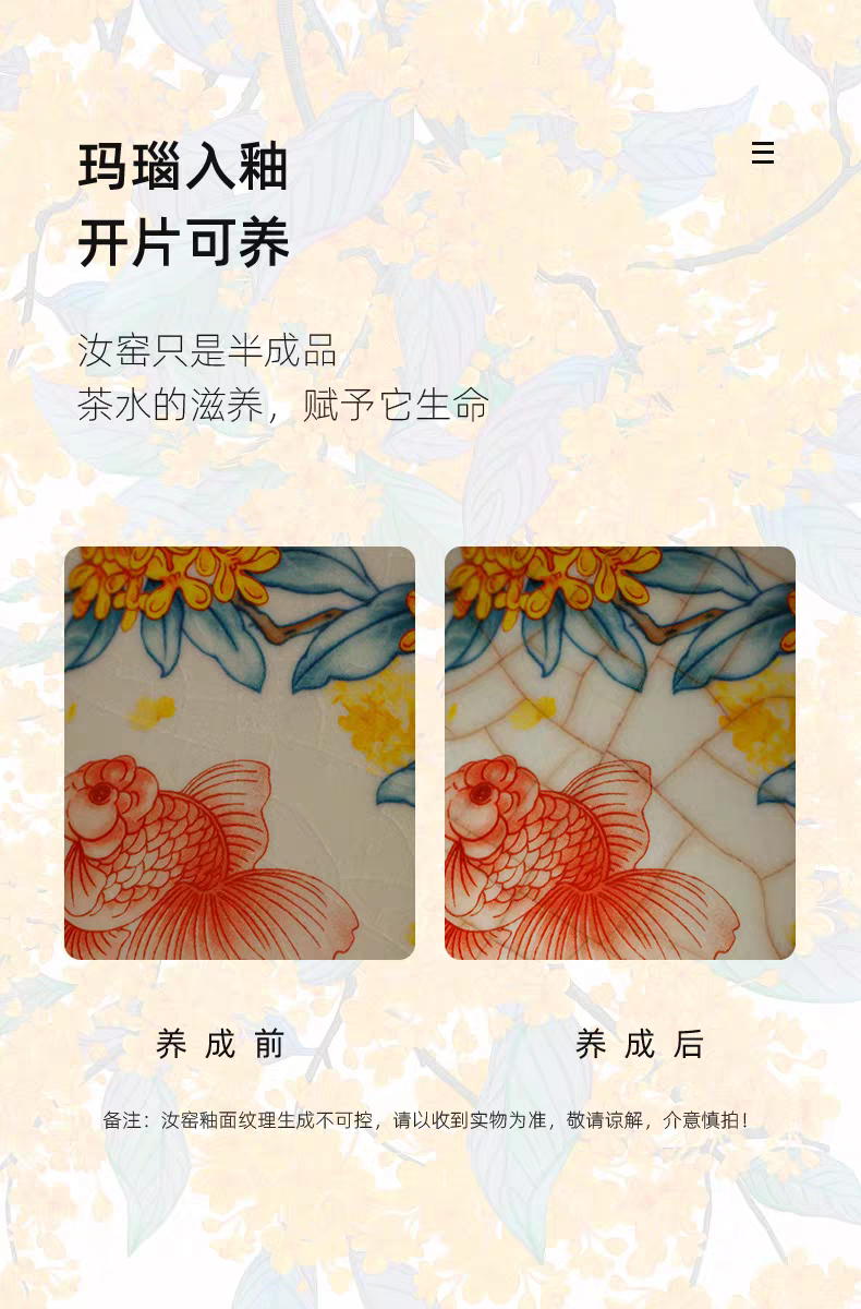 金鲤桂花,寓意金贵。杯内外皆有画面。亚黄汝瓷,;蝉翼开片,家有千财万贯,不如汝窑一片。独家专利技术;采用高价优质瓷土,紫口铁足,瓷质高档。立体浮雕杯身