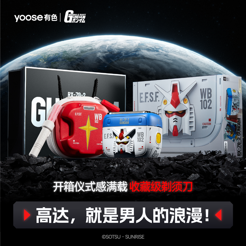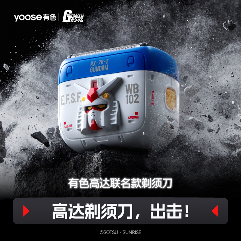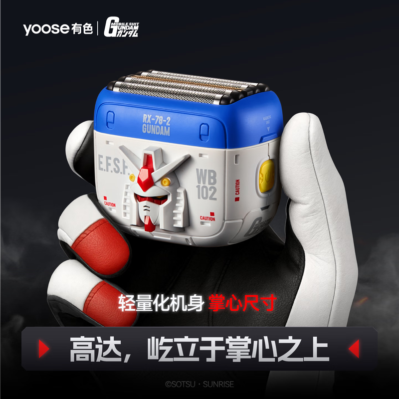 配置清单:有色高达联名款往复式剃须刀/高达盾牌收纳包/光束军刀清洁毛刷/磁吸保护盖V计划说明书/Type-C充电线/剃须刀礼盒包装/有色高达手提礼袋