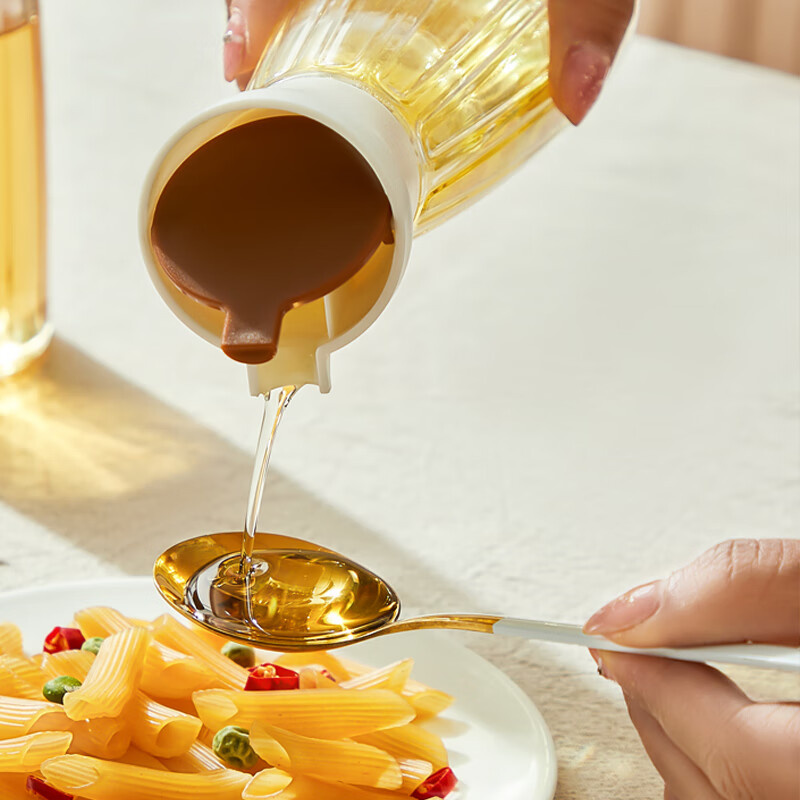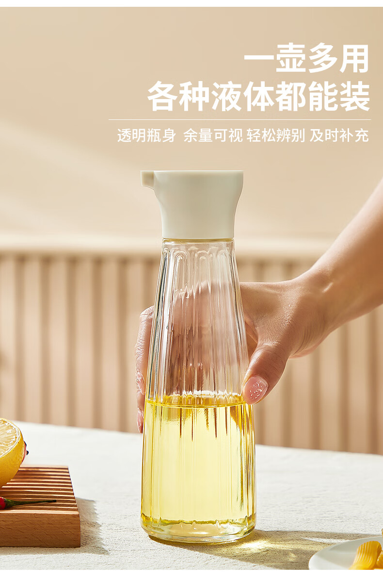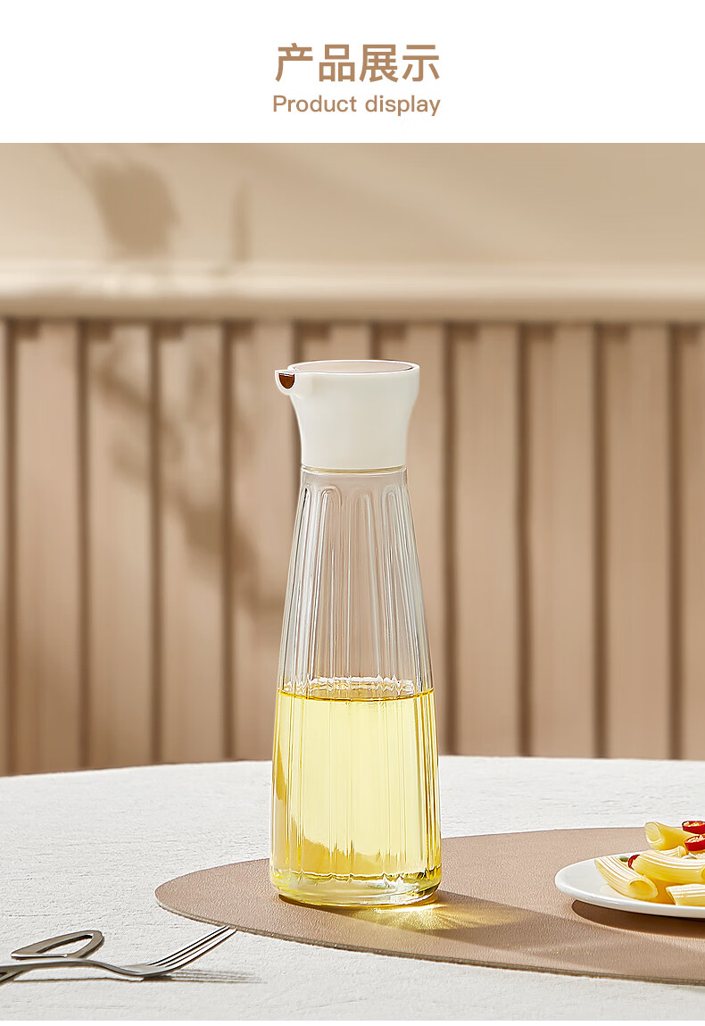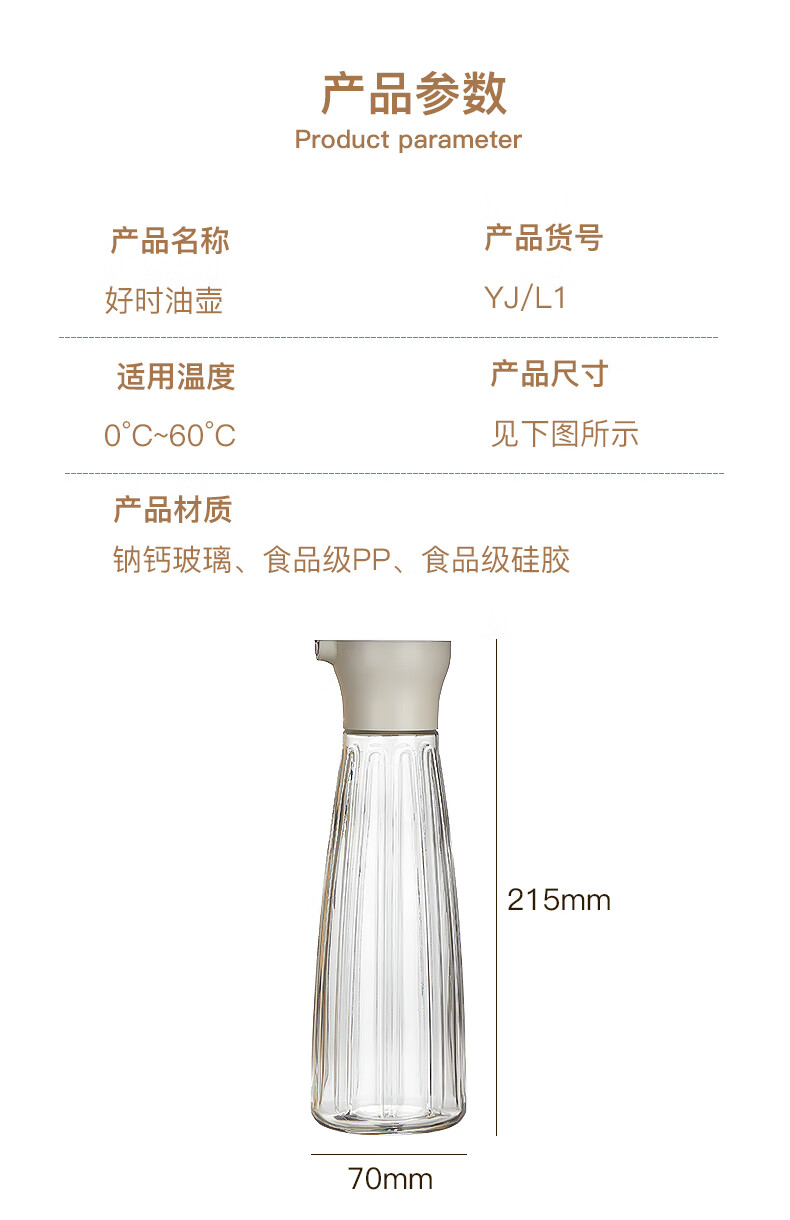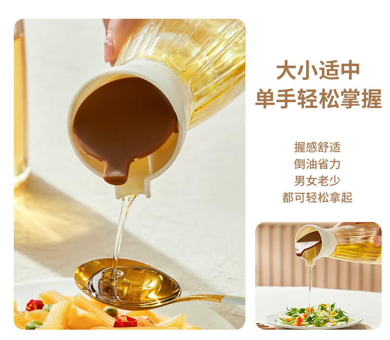 油壶盖子双孔设计;健康玻璃材质,设计感强;握感舒适,倒油省力
