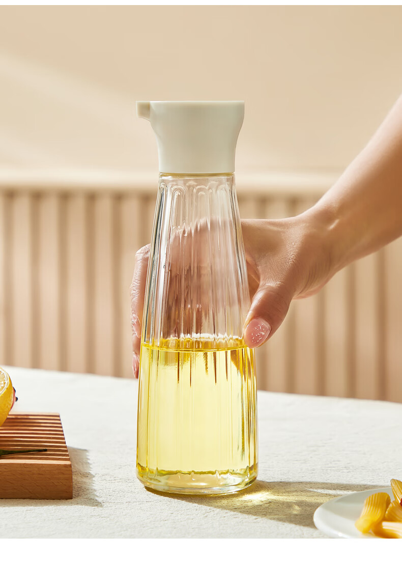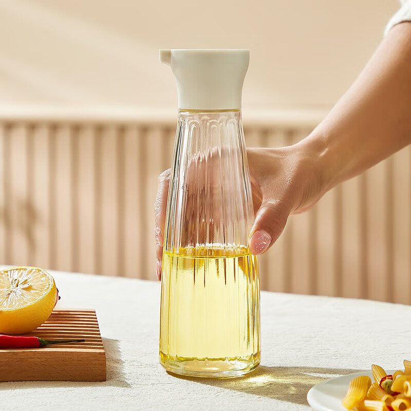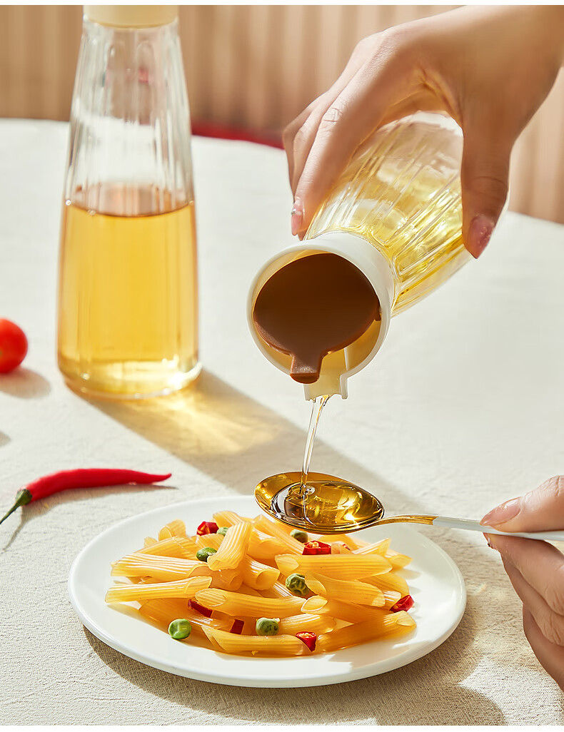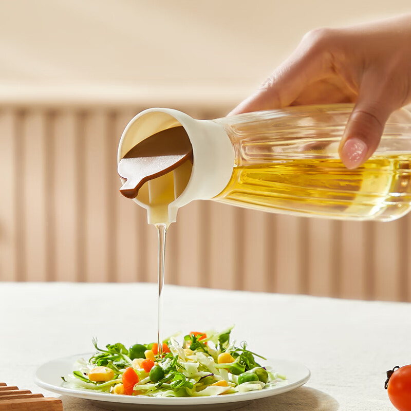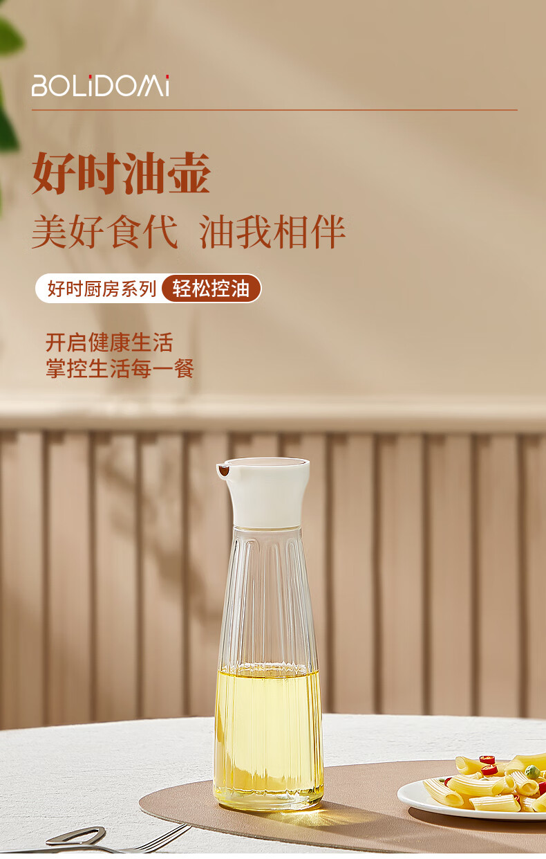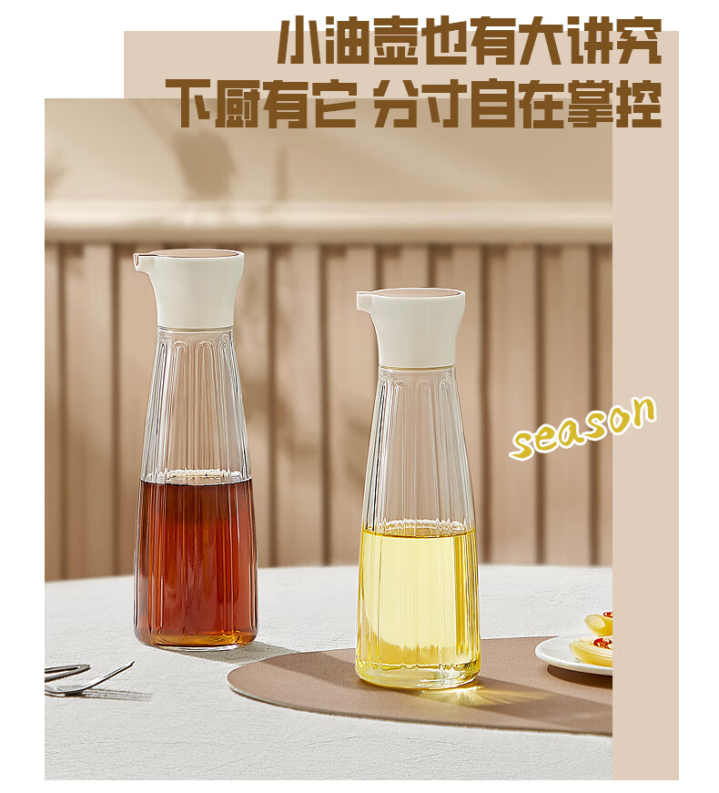 油壶盖子双孔设计;健康玻璃材质,设计感强;握感舒适,倒油省力