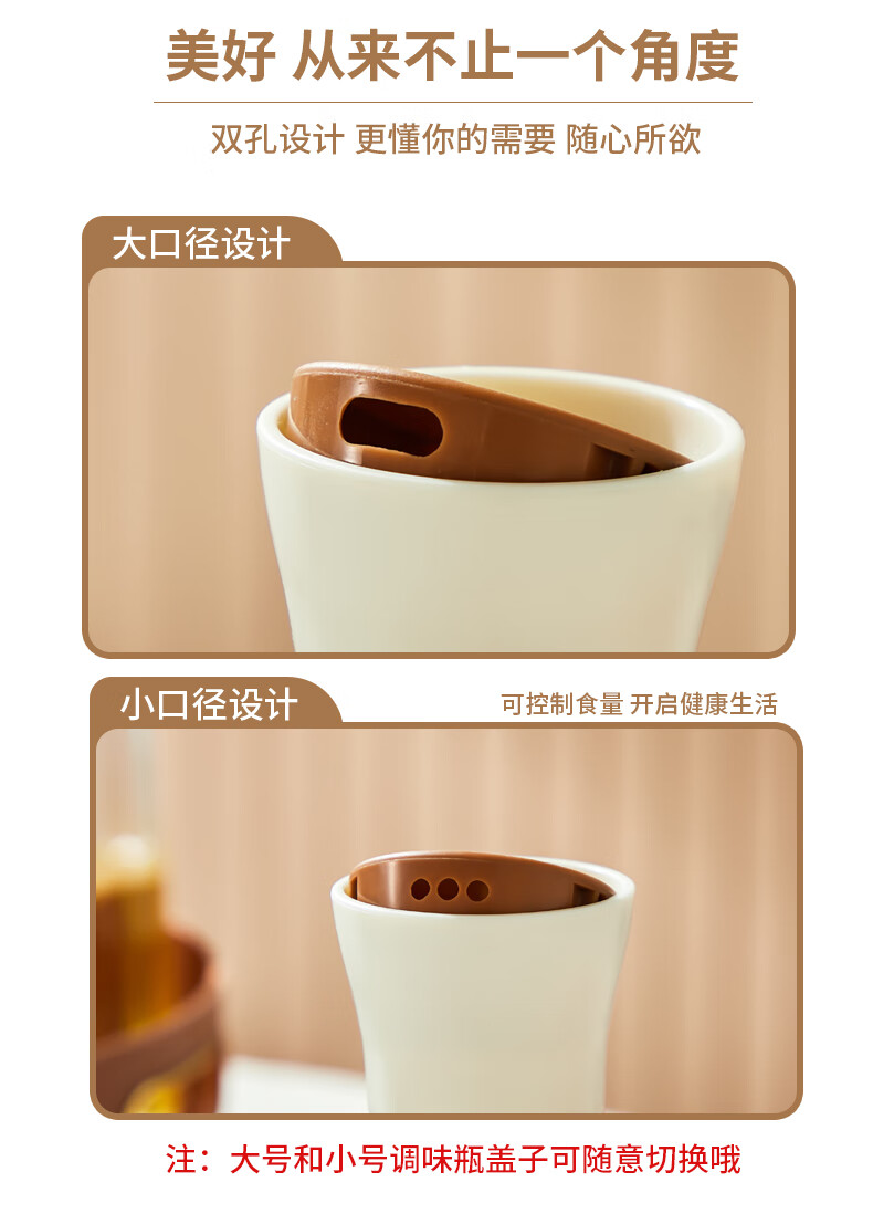 健康玻璃材质,设计感强;大小适中,握感舒适;油壶盖子双孔设计,大小口径可控制食量