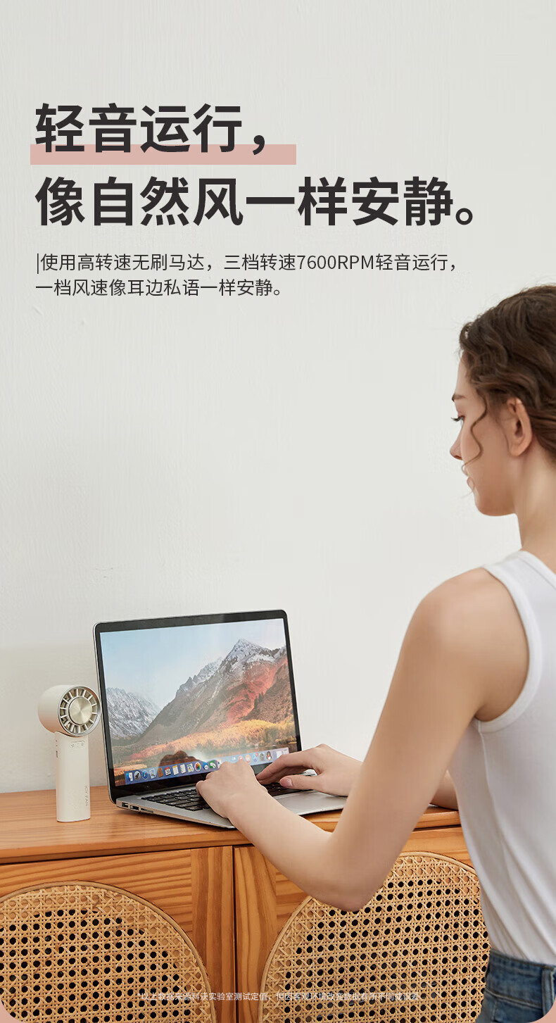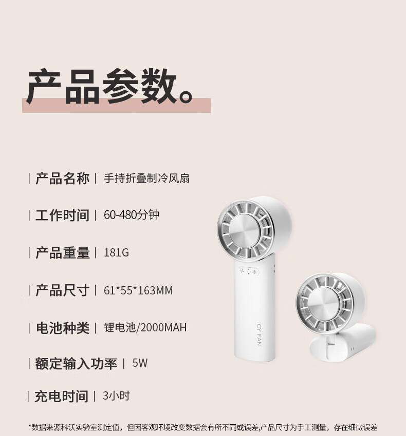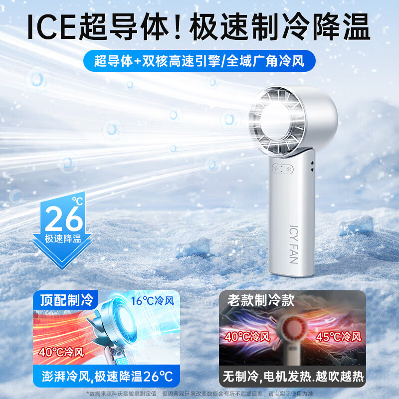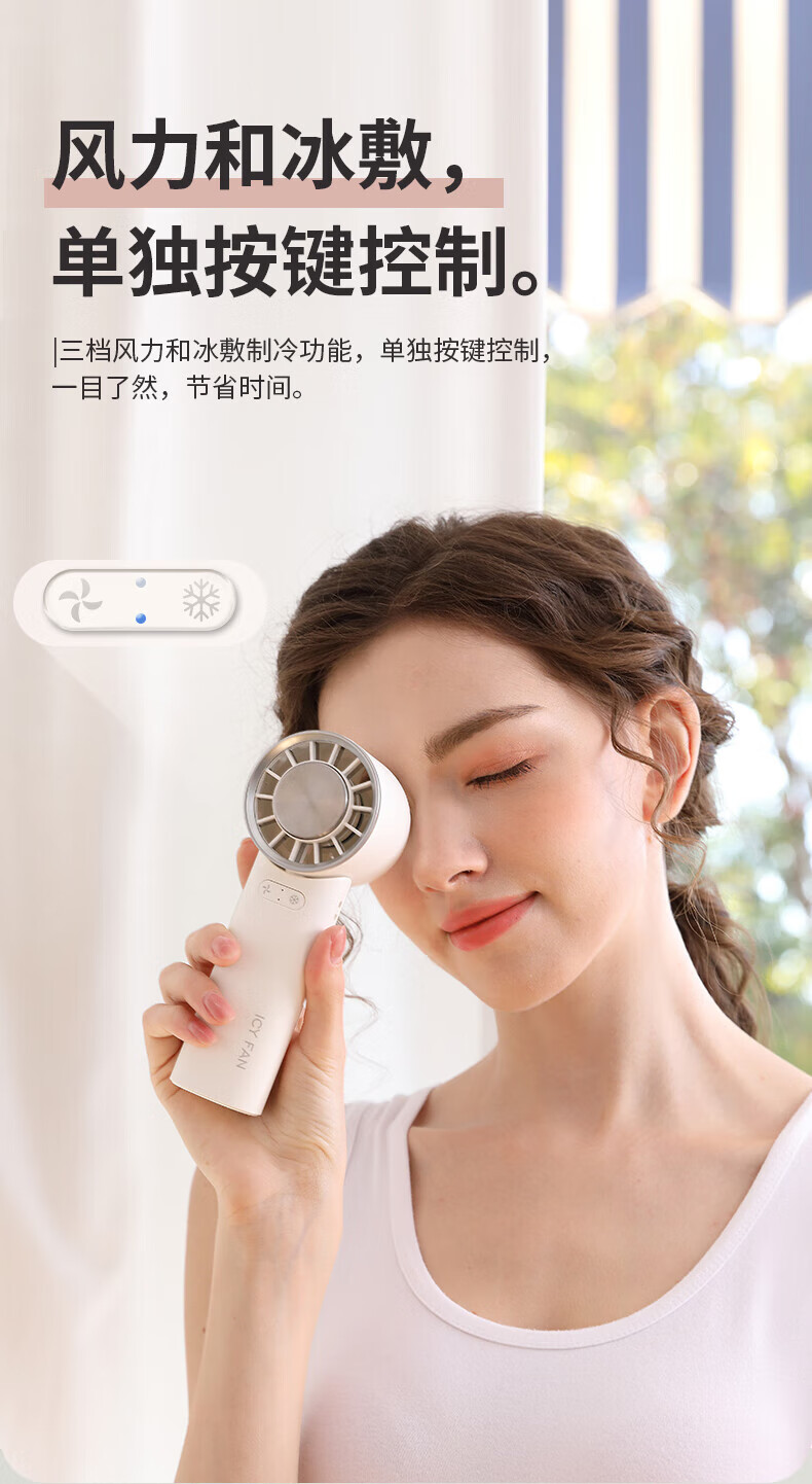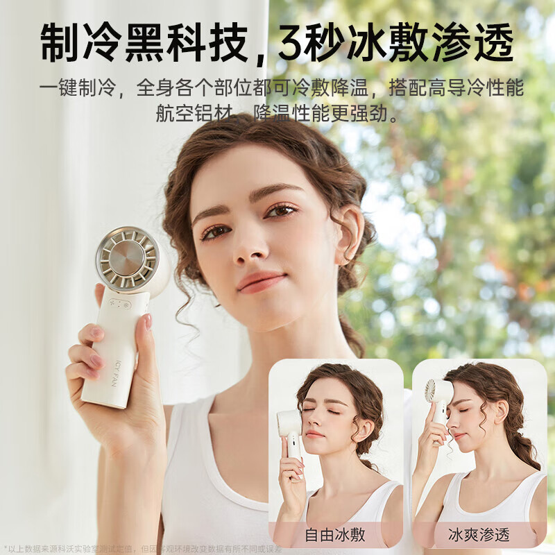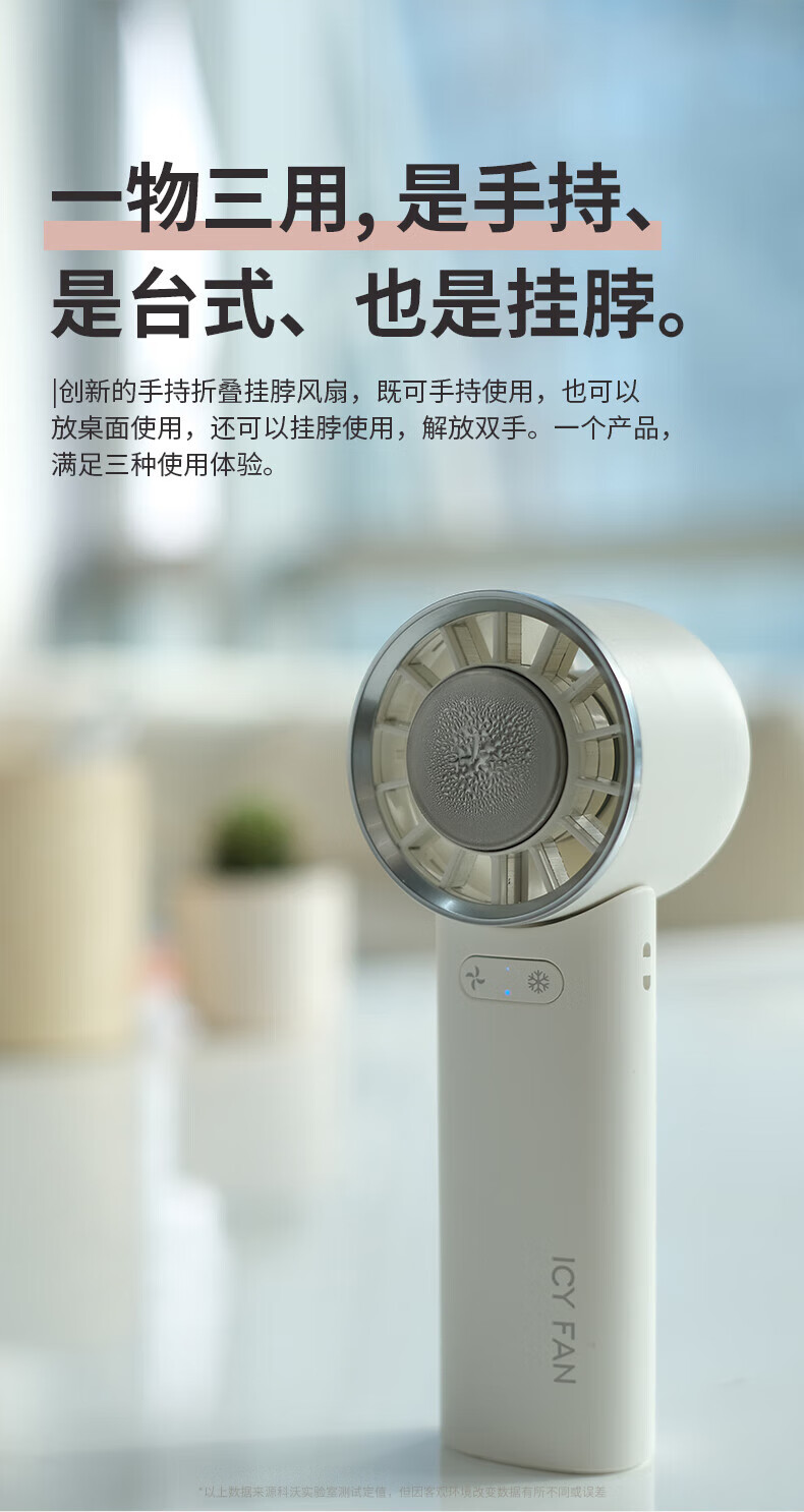 极速冰敷制冷全身直降20°; 劲吹一整天强劲续航;三档可调风力;可桌面可手持