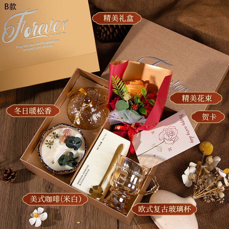 B款配置:香薰蜡烛+美式咖啡液+ 玻璃杯+勺子+花束+贺卡