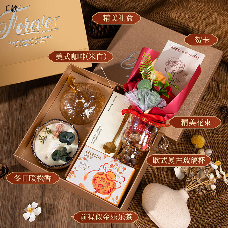 C款配置:香薰蜡烛+美式咖啡液+玻璃杯+ 勺子+乐乐茶+花束+贺卡