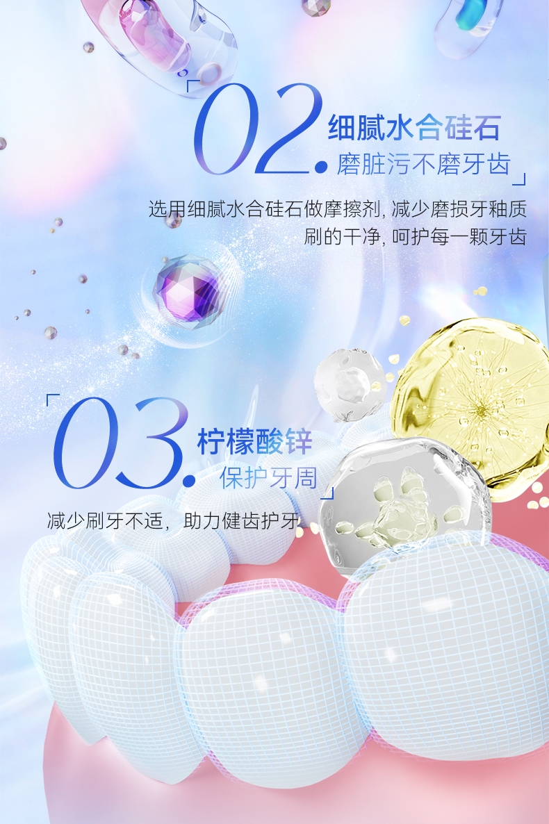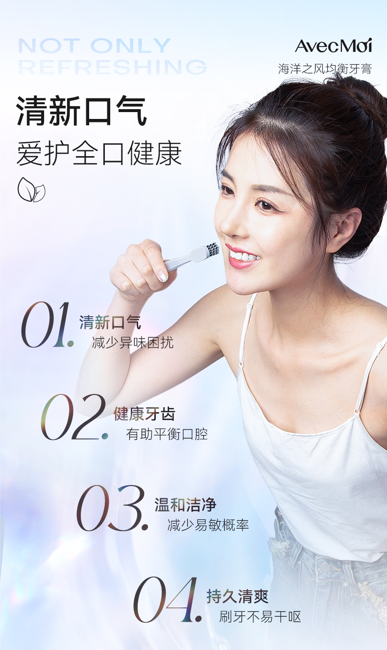 清新口气减少异味困扰;健康牙齿有助平衡口腔;温和洁净减少易敏概率
