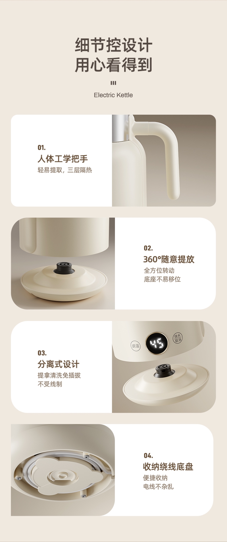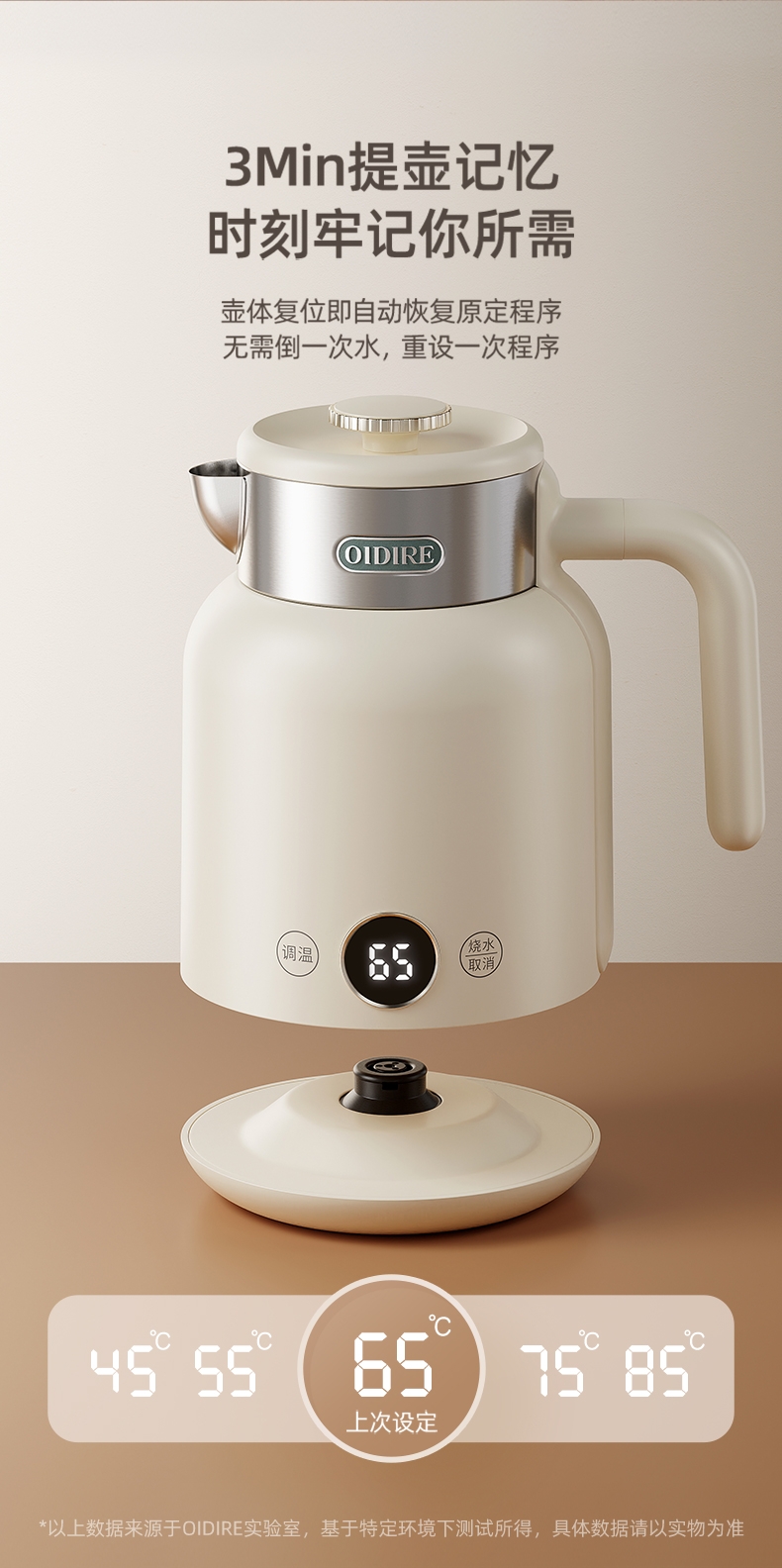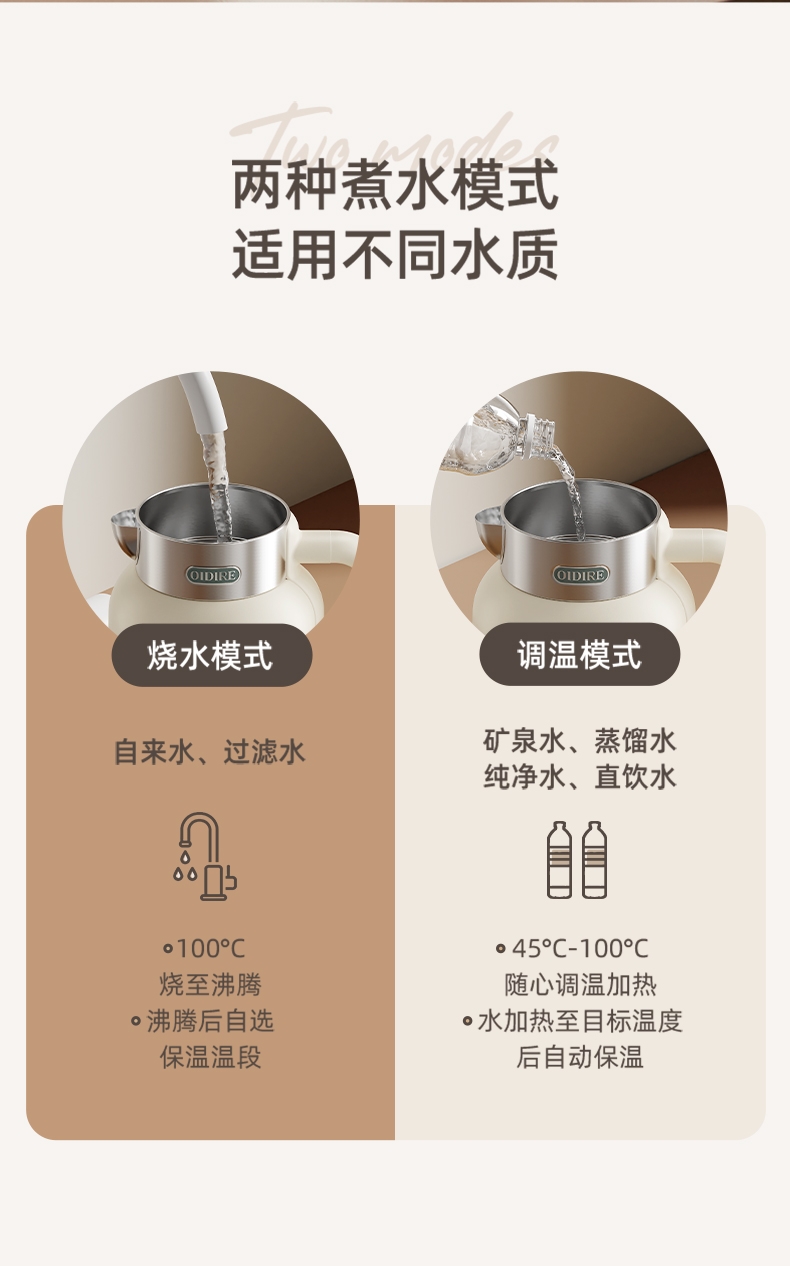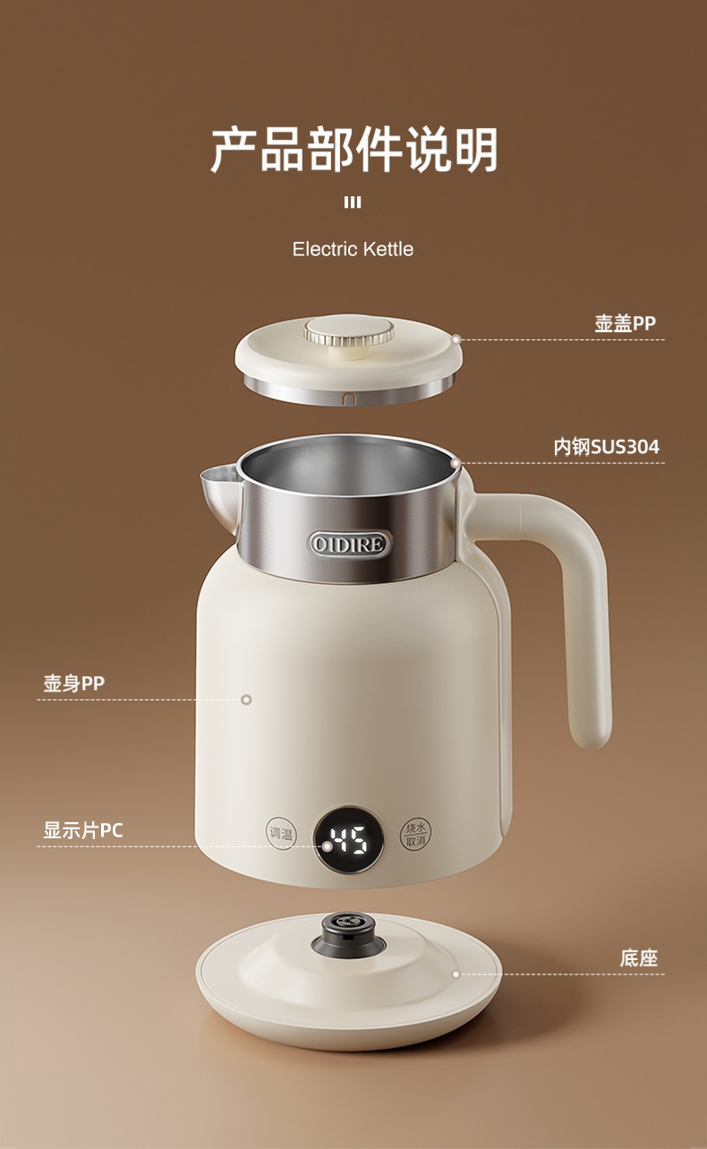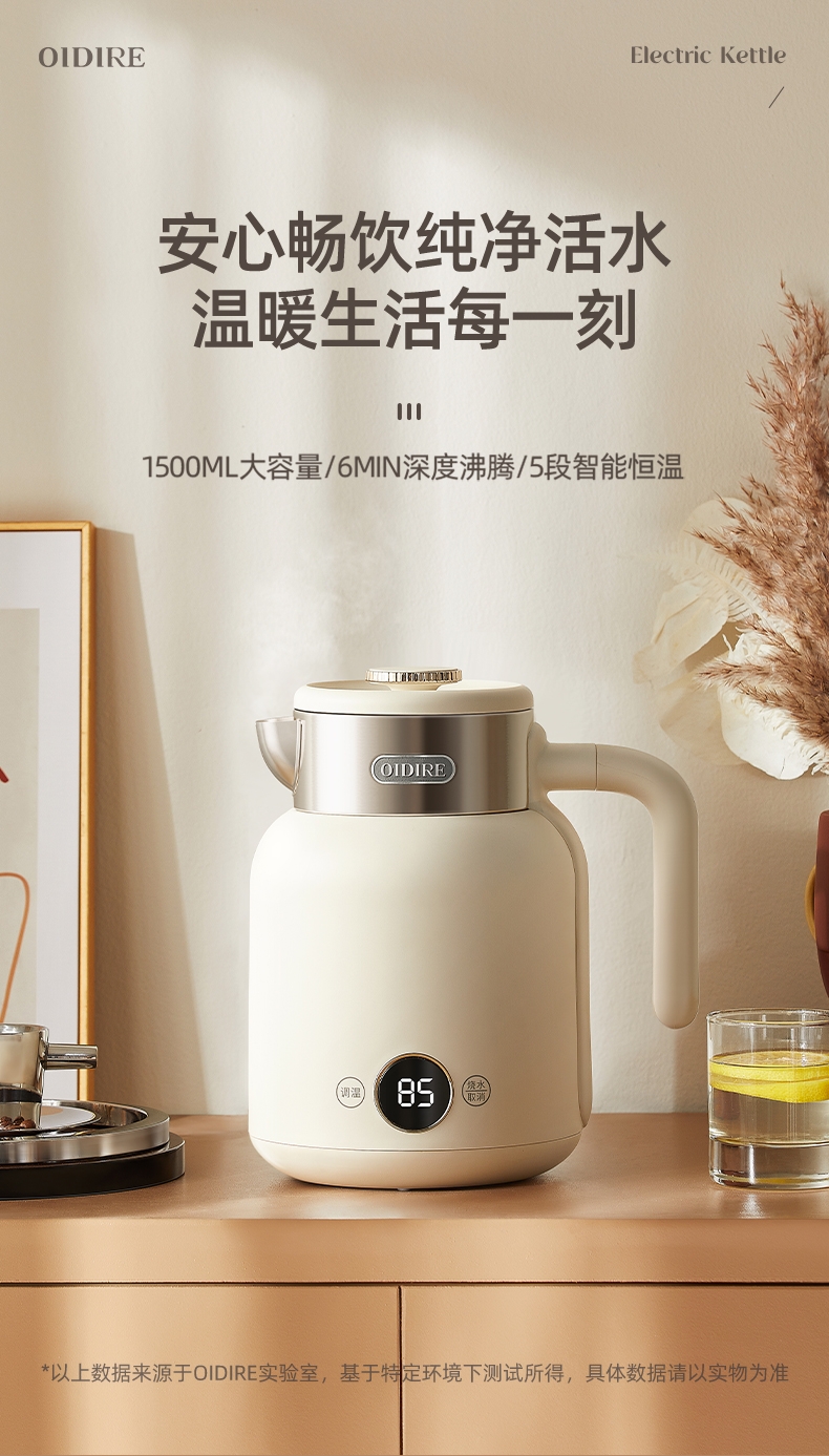 数码显示屏,温度随时可视 ;304不锈钢内胆,健康无异味;智能五段恒温,满足各种需求;双层隔热防烫,三色工作指示灯;提壶记忆功能,干烧断电保护