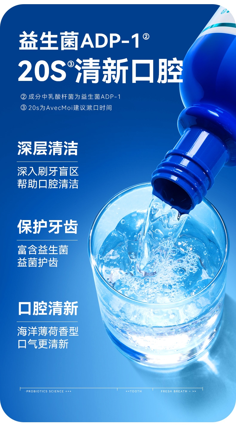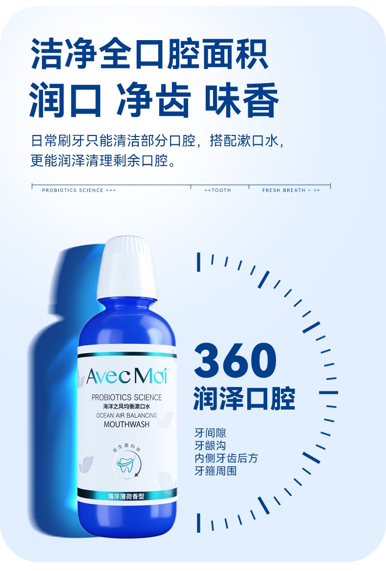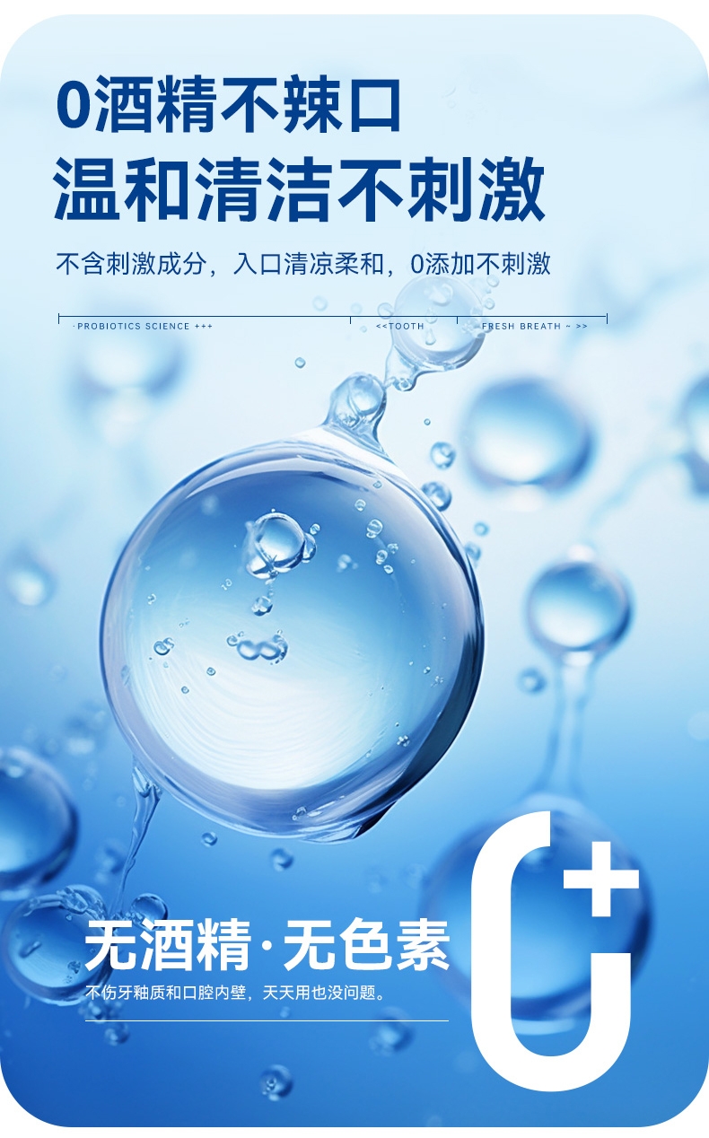 0酒精 温和不刺激;动态平衡口腔菌群 呵护口腔健康;20S漱走有害菌 持久洁净清新