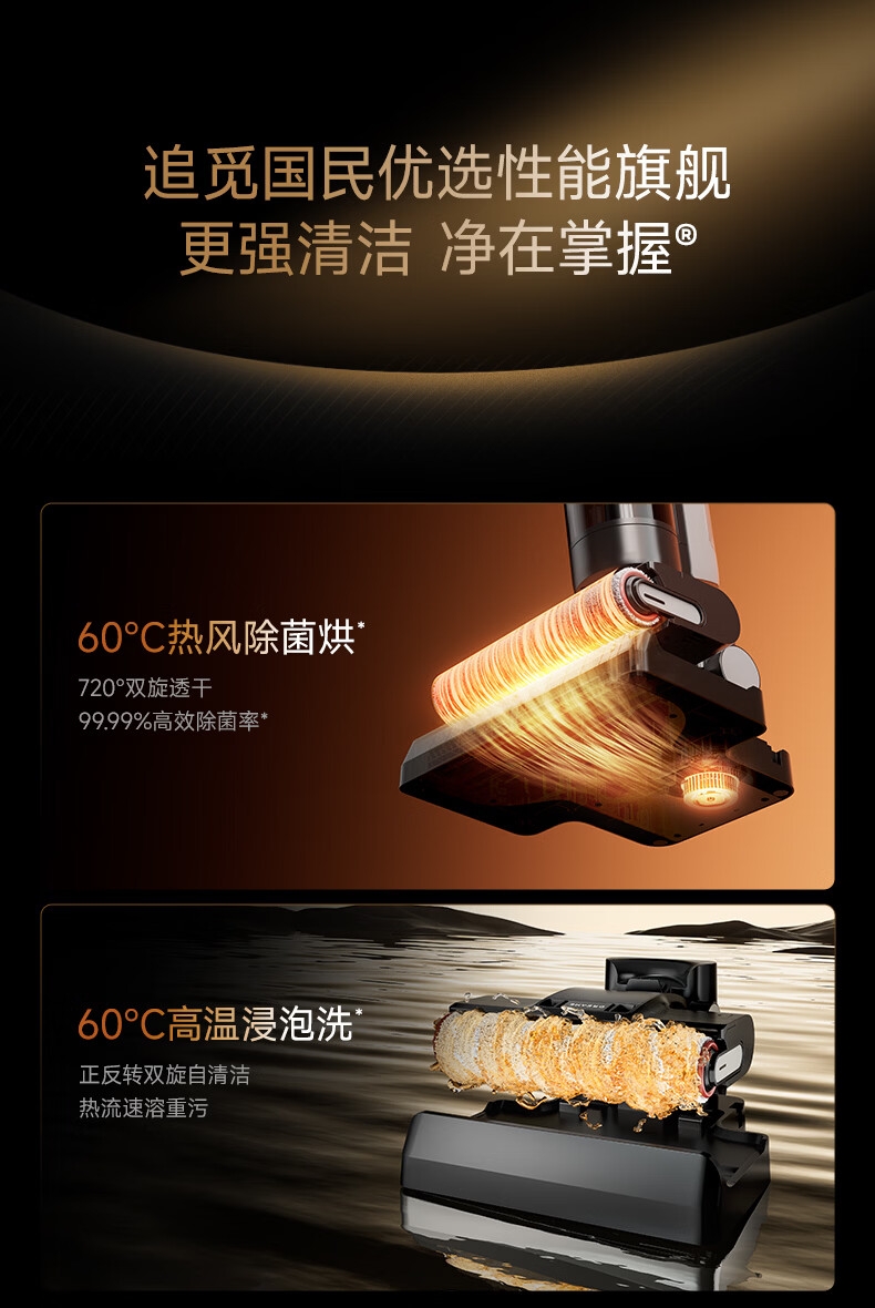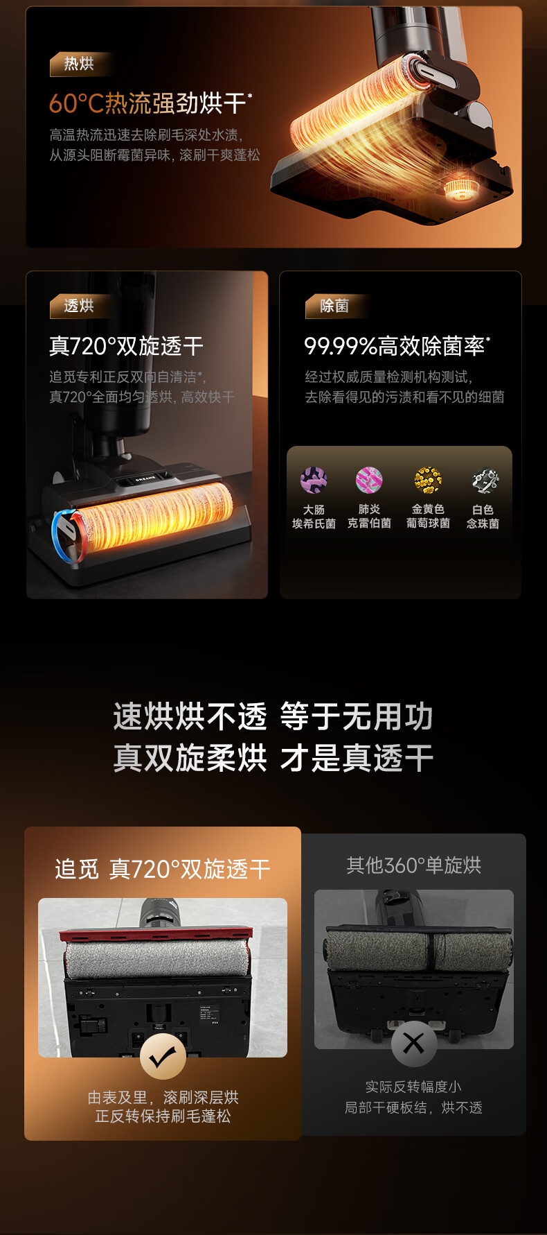 60°C热流强劲烘干;真720°双旋透干;99.99%高效除菌率