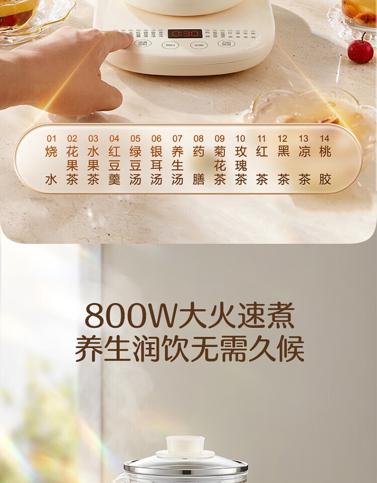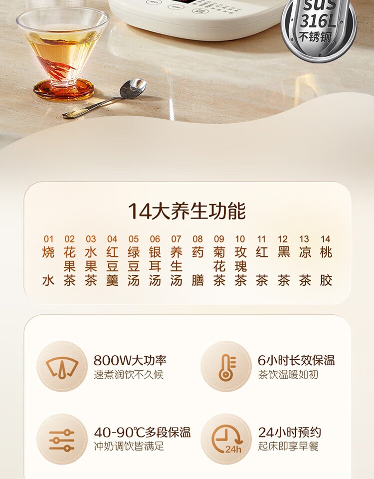 甄选316L不锈钢与高硼硅玻璃,健康炖煮更安心;14大功能,多样功能选择,各式汤饮一机完成。;800W功率,快速炖煮,热力充分煮透,软化食材释放