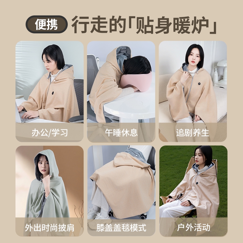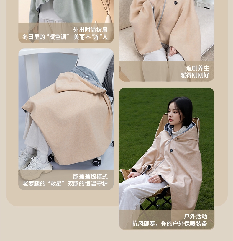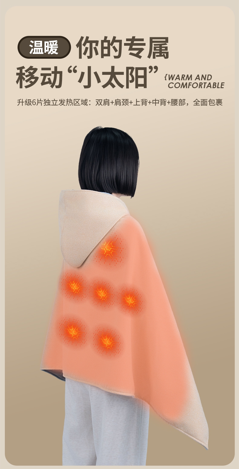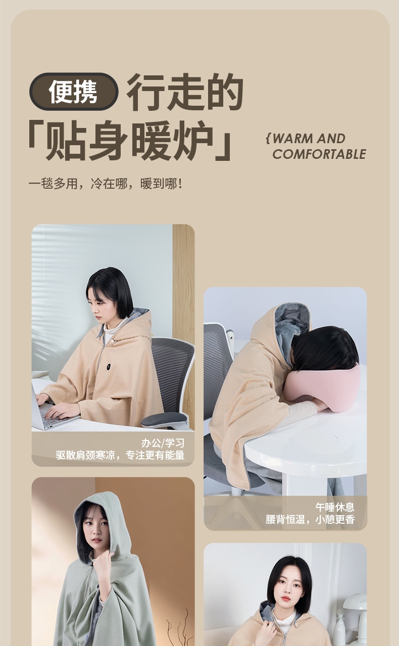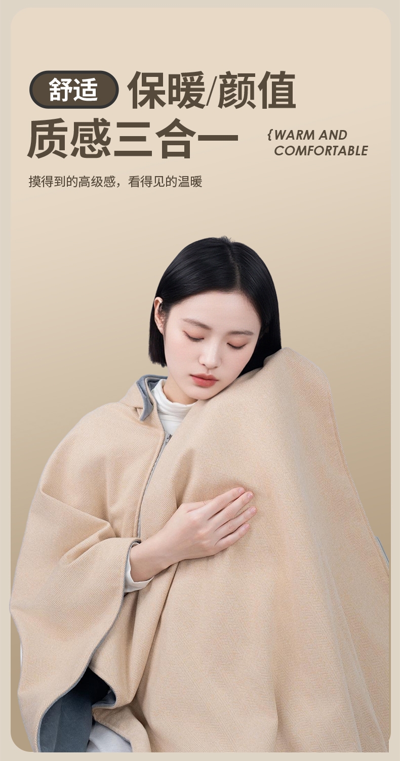 可盖可披,一毯多用,内层超柔水晶绒面料;贴身速暖,六大分区发热片,一键加热;USB接口连接移动电源