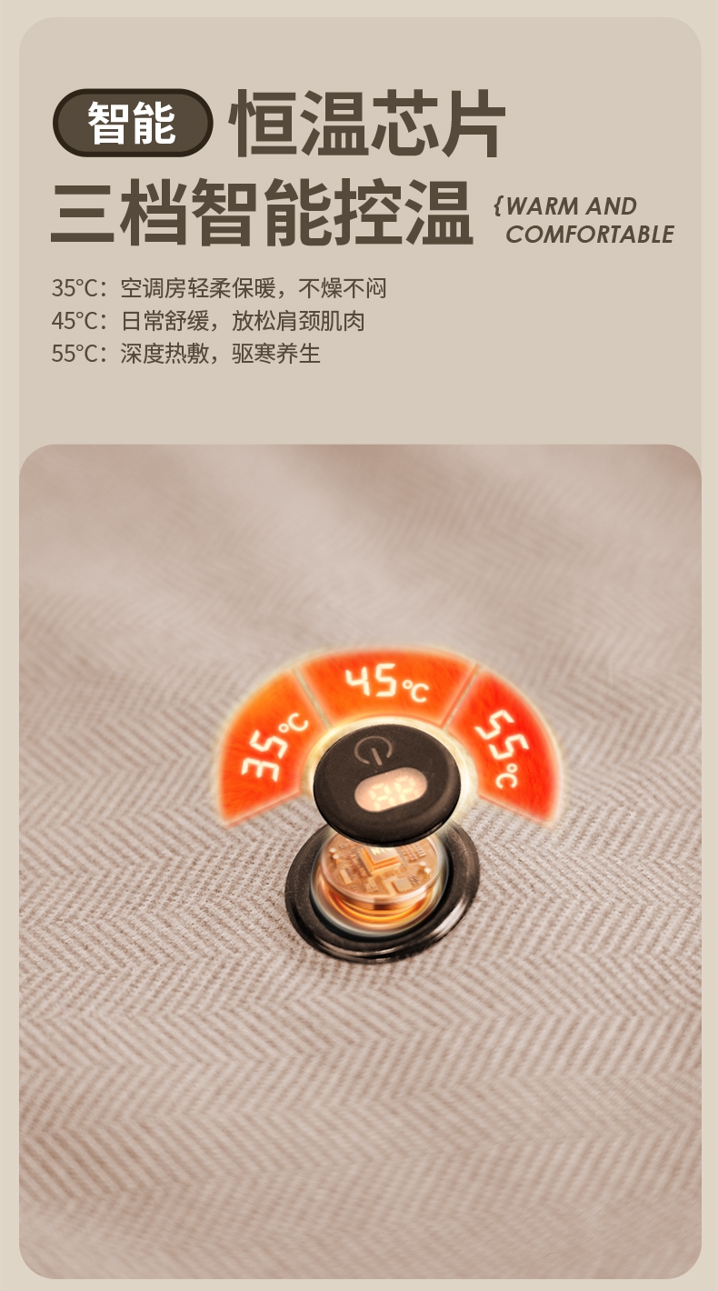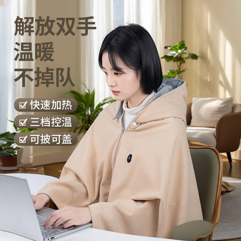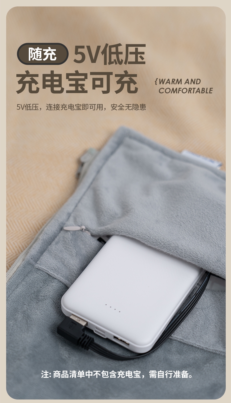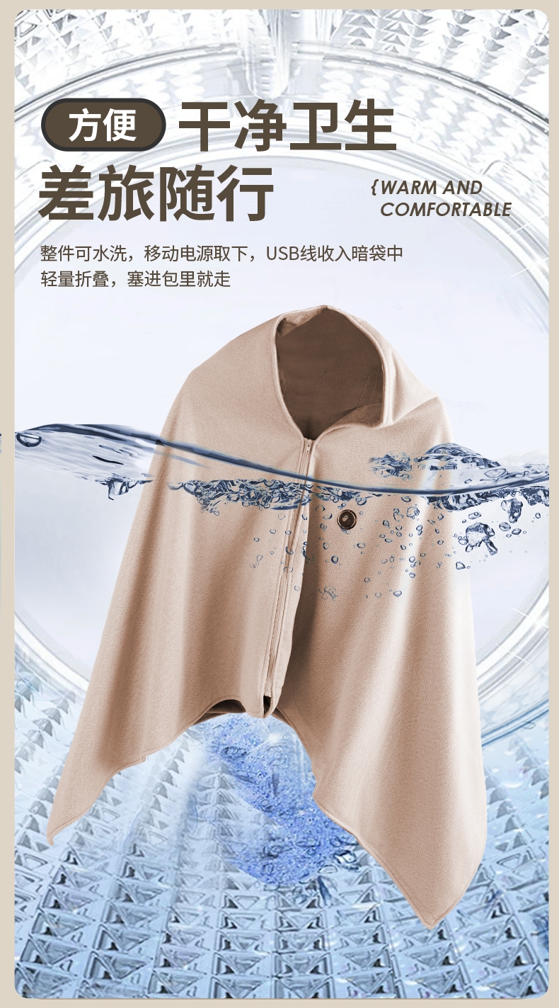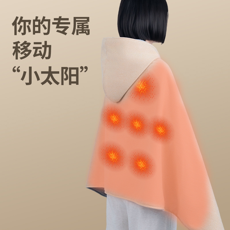 可盖可披,一毯多用,内层超柔水晶绒面料;贴身速暖,六大分区发热片,一键加热;USB接口连接移动电源