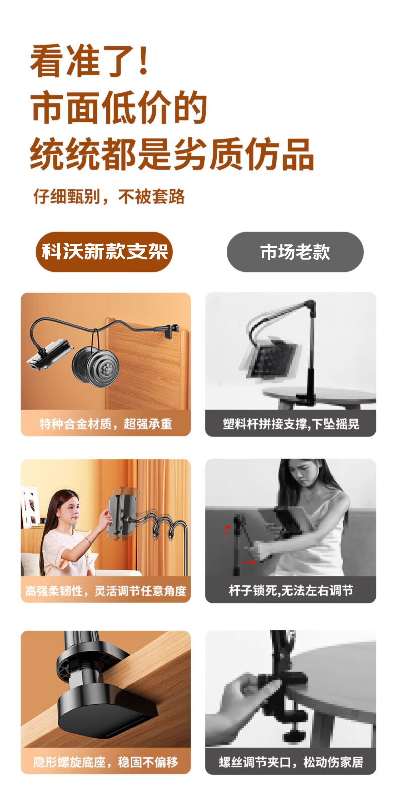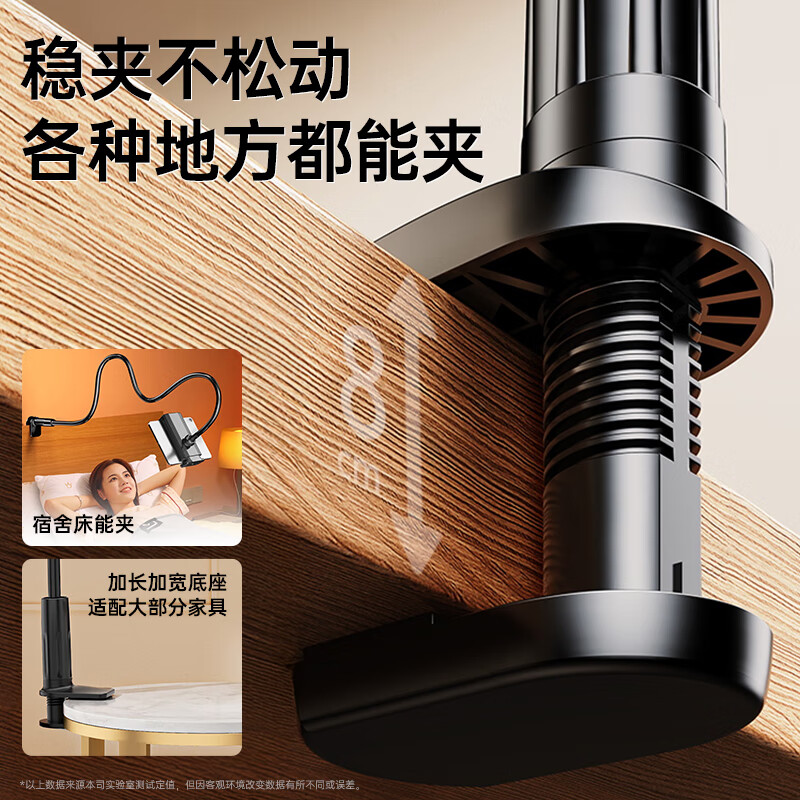 一体合金 懒人支架 不摇晃/不下坠/不断裂;加大加宽底座 稳夹不松动各种地方都能夹;19CM大开口适配多种电子设备