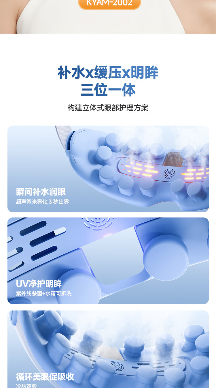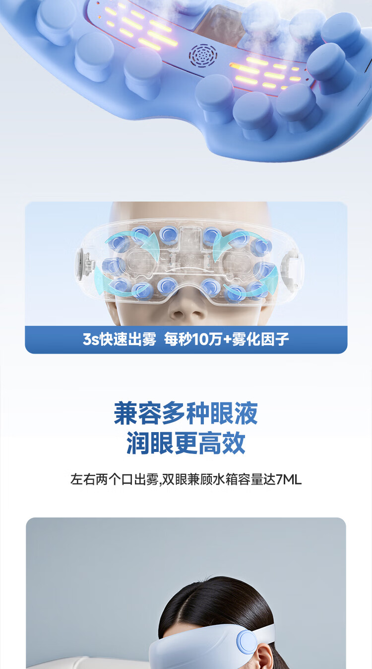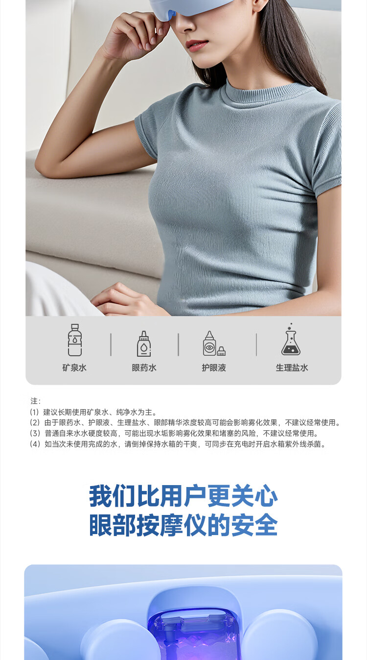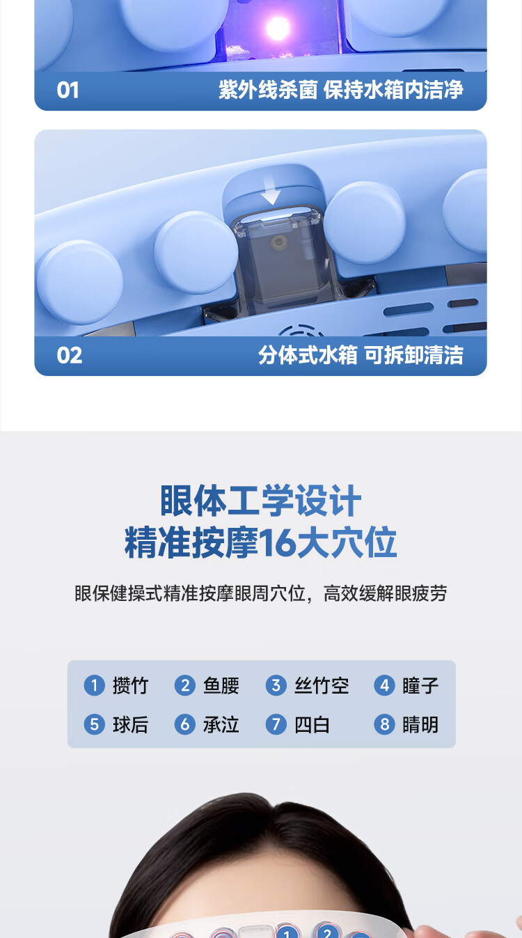 UV净护明眸,紫外线对可拆卸可视化水箱进行杀菌;软硅胶材料更贴合眼部周围,更亲肤。;可调节绑带,适用不同头部尺寸