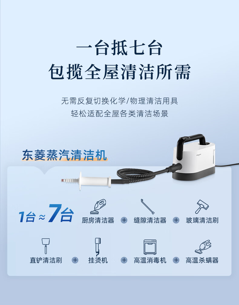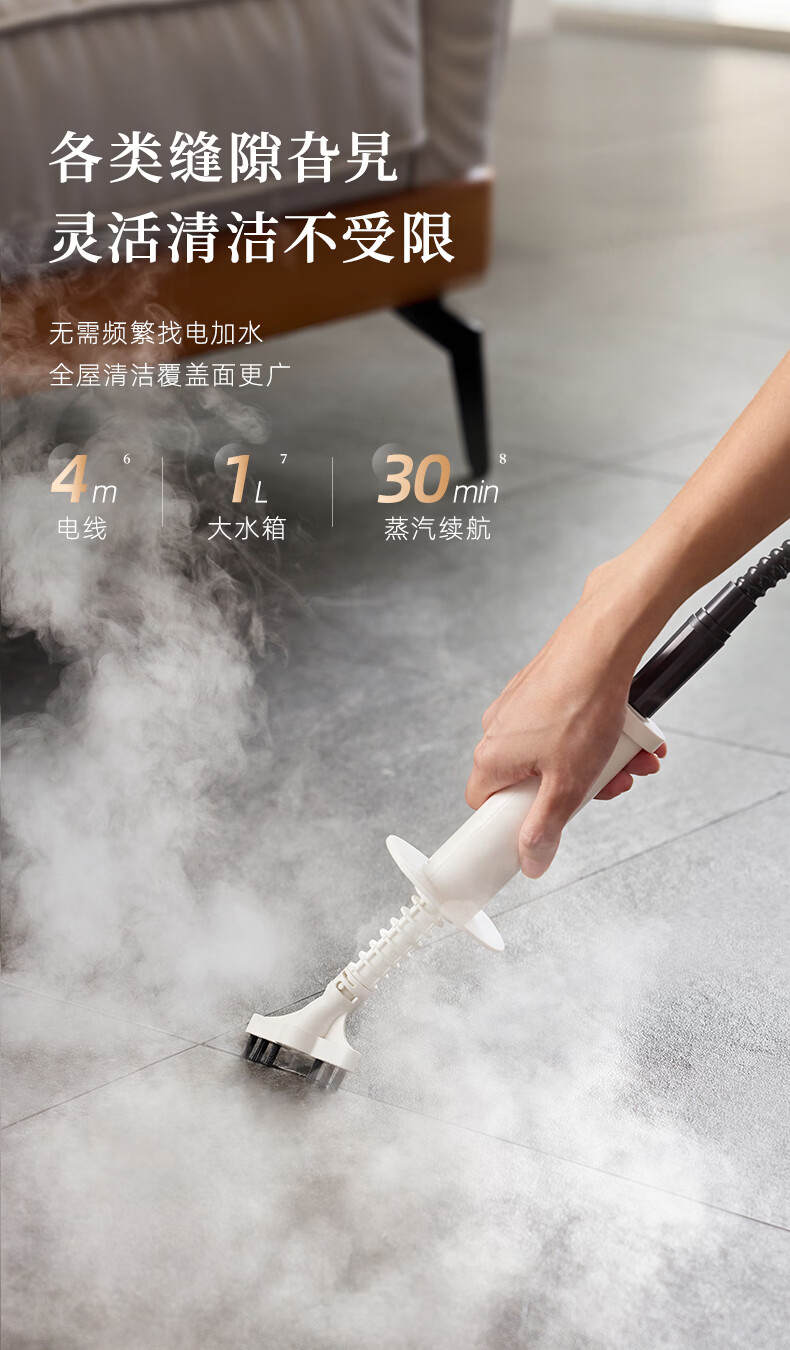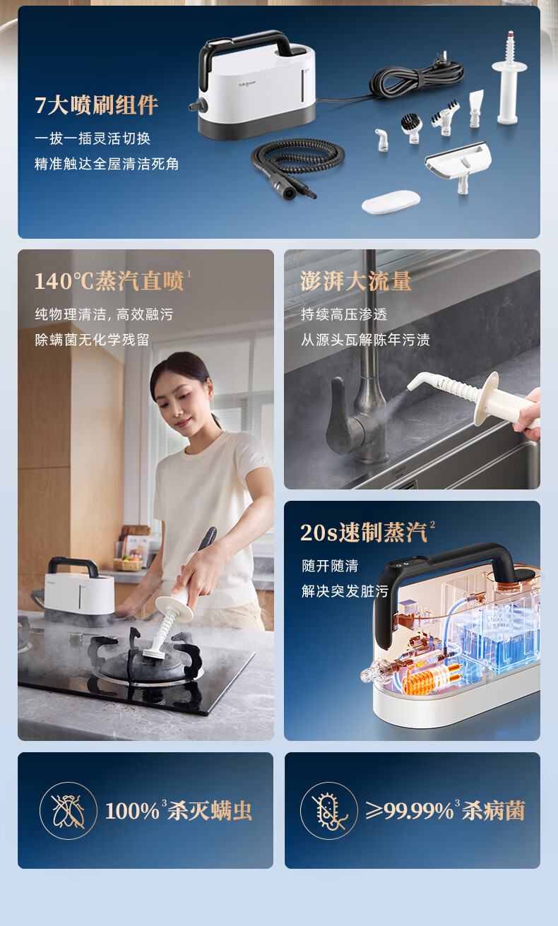 7大喷刷组件,精准触达全屋清洁死角;澎湃大流量,持续高压渗透;20秒140℃蒸汽3bar高压直喷