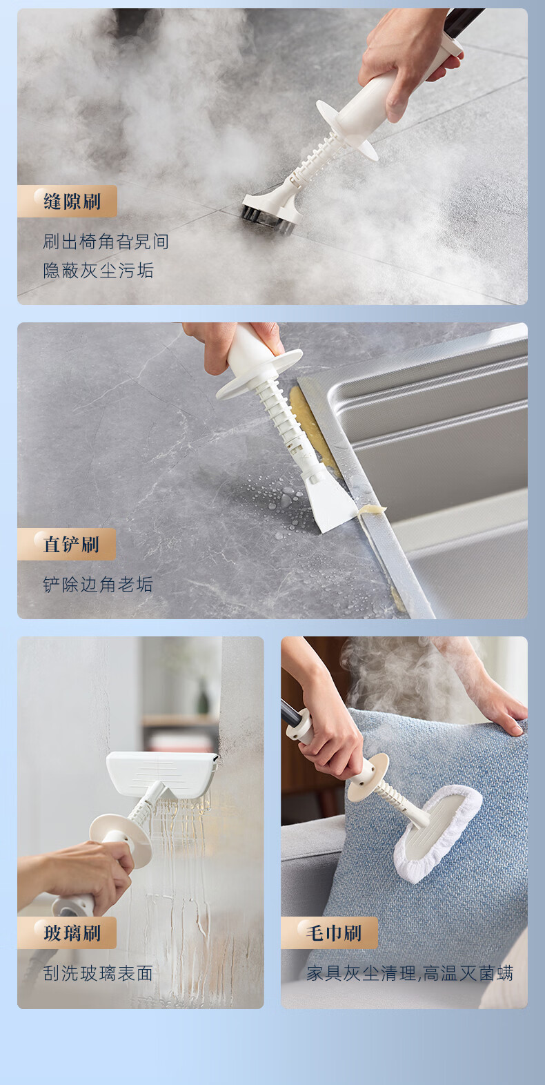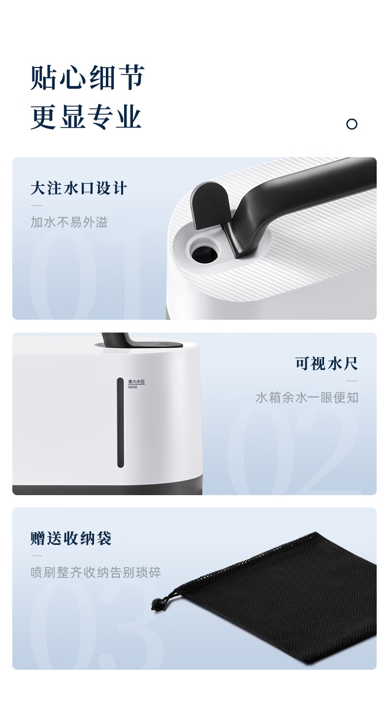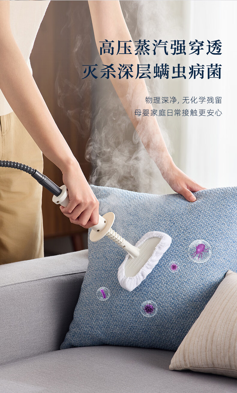 7大喷刷组件,精准触达全屋清洁死角;澎湃大流量,持续高压渗透;20秒140℃蒸汽3bar高压直喷
