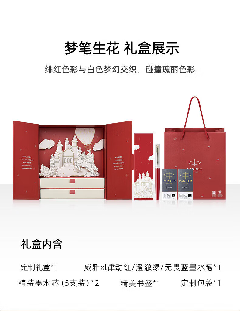 配置:笔*1 5支装墨水芯*2 书签*1 礼盒*1 定制手提袋*1
