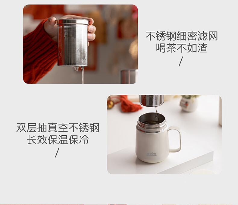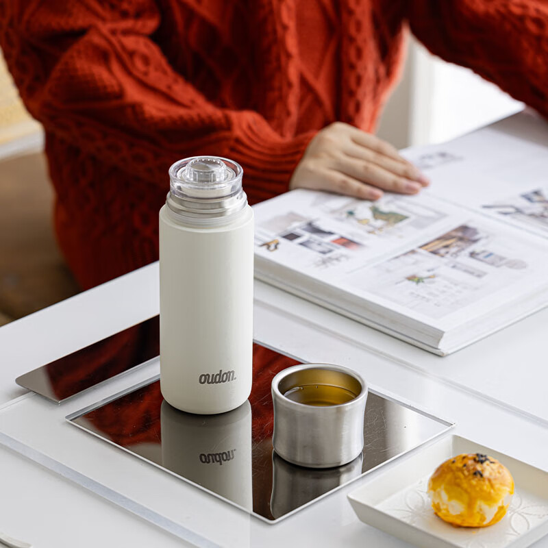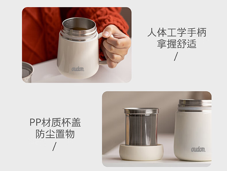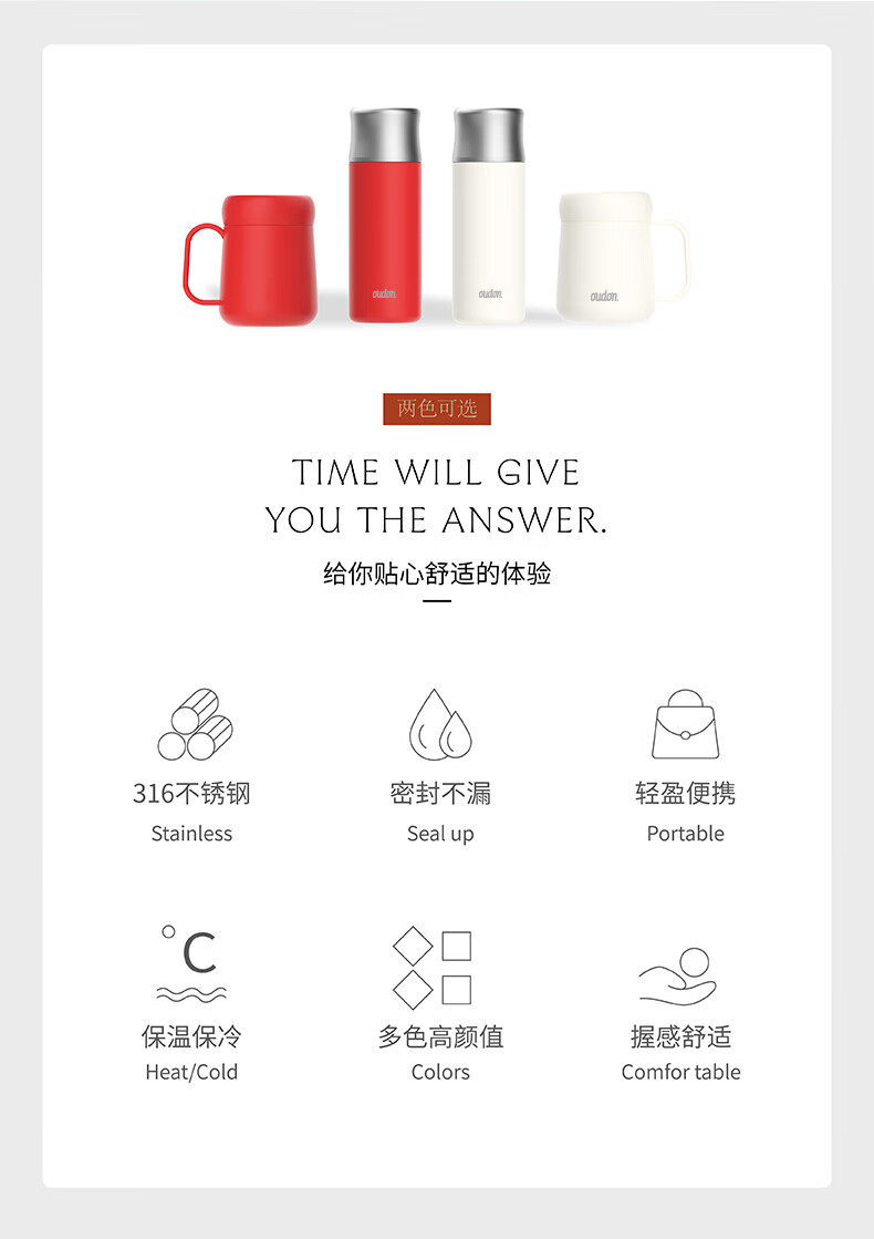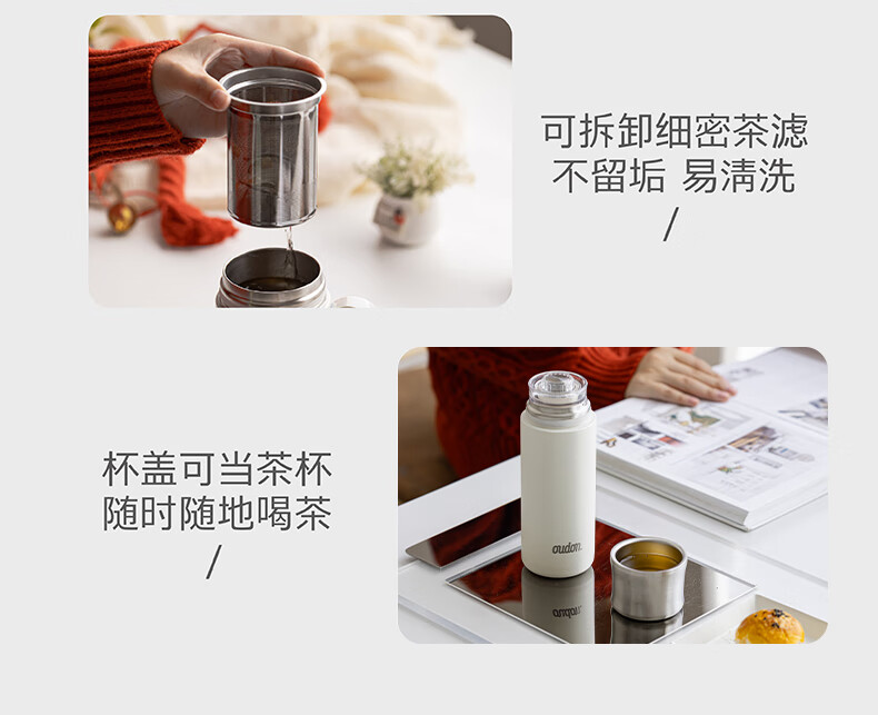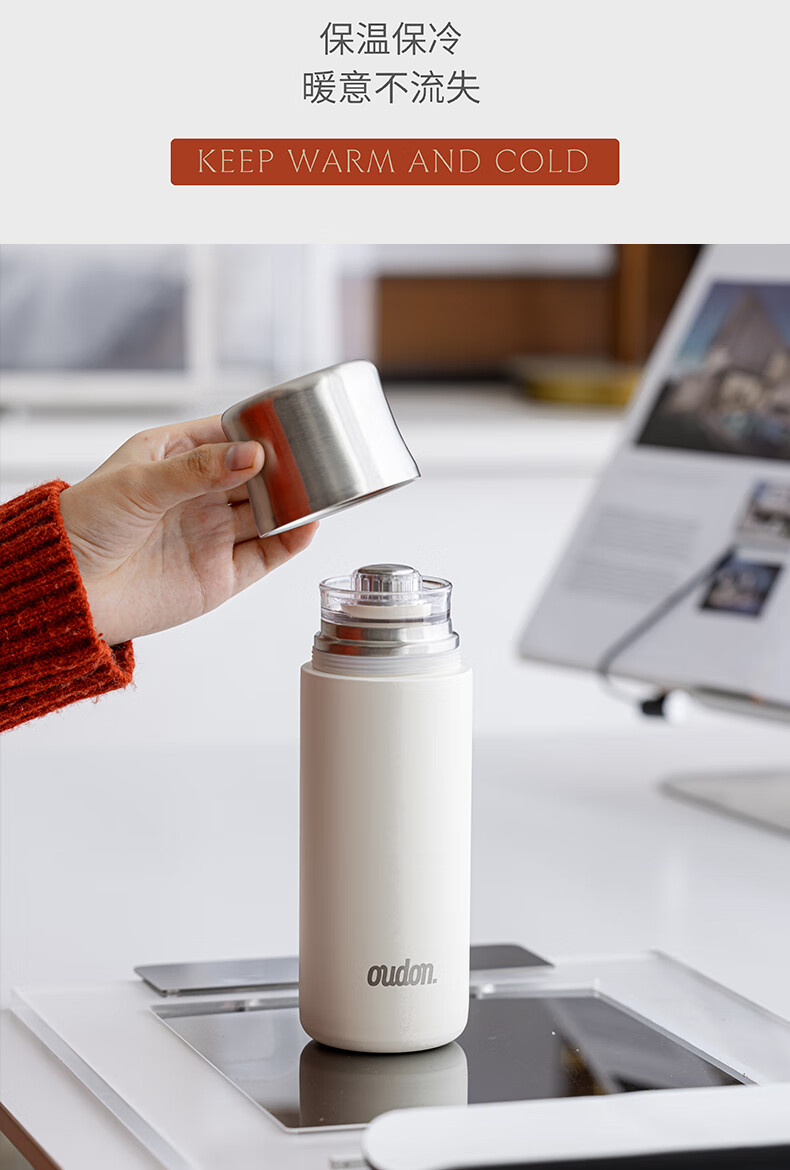 温显内塞,按压即可显示杯内温度; 杯盖即是主人杯;小直径杯体,握感舒适;桌面杯大杯口设计,喝水、清洗方便