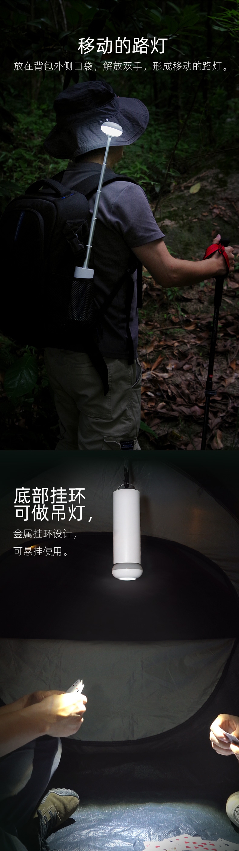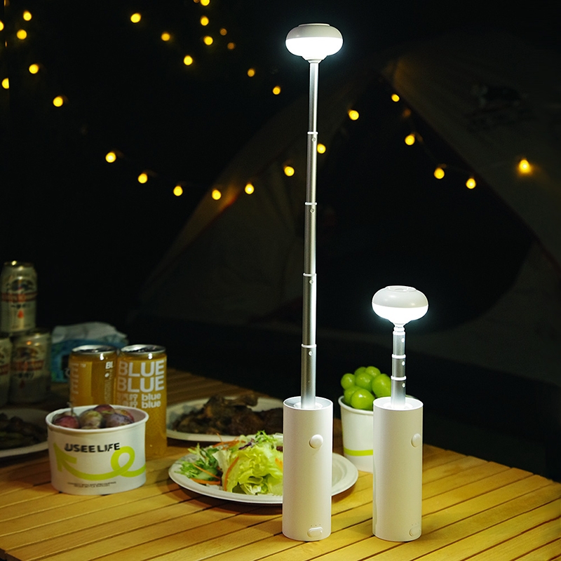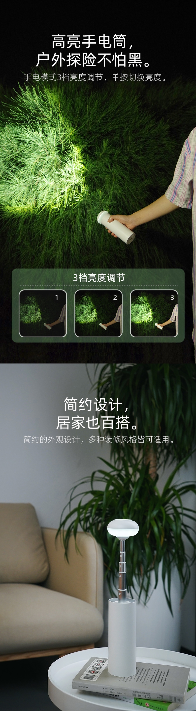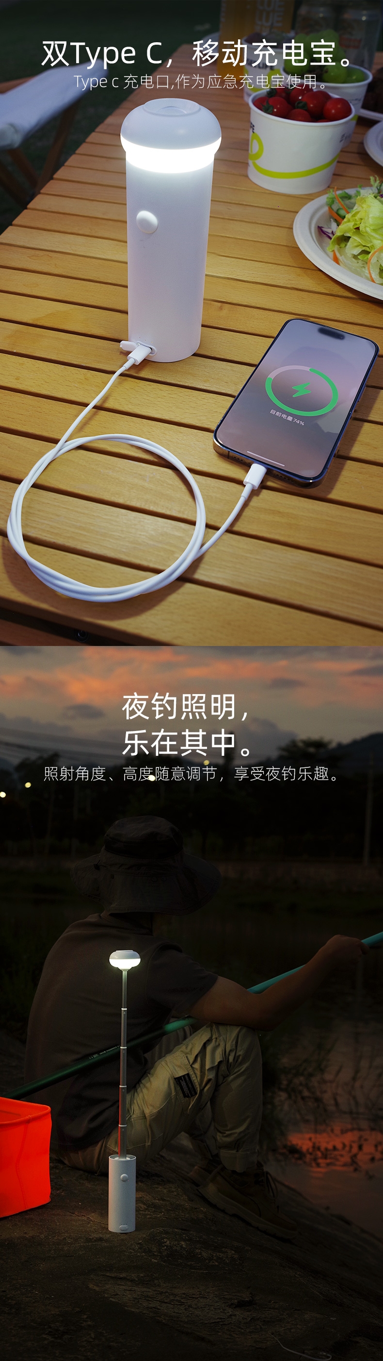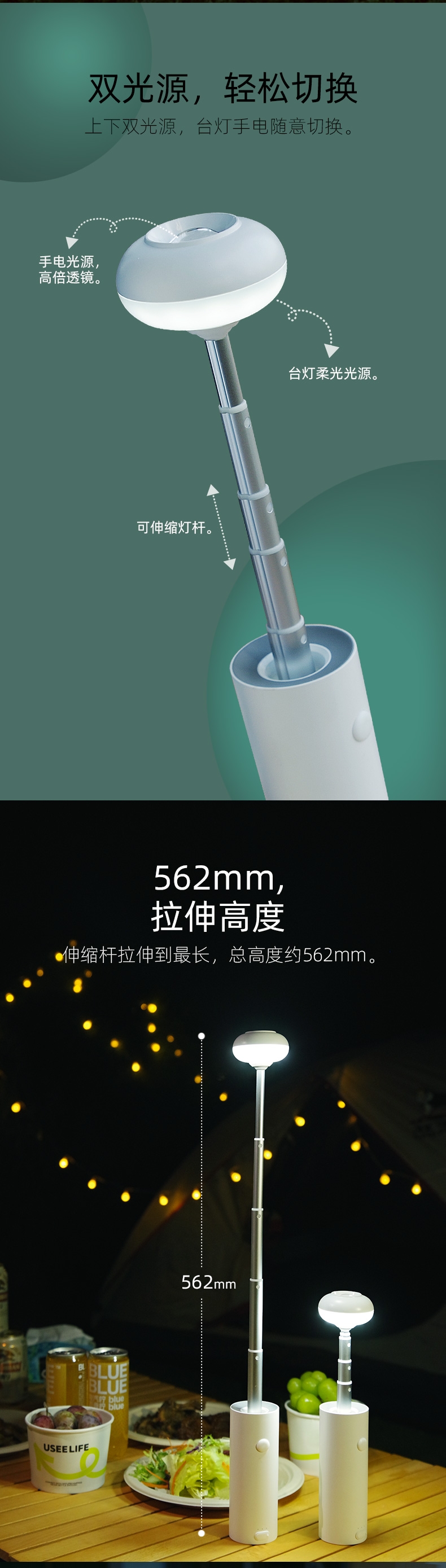 既是桌面台灯、悬挂吊灯,也是便携手电、露营主灯;伸缩灯杆设计,可在短柄便携与长杆照明之间灵活切换;内置大容量电池,支持长时间持续照明