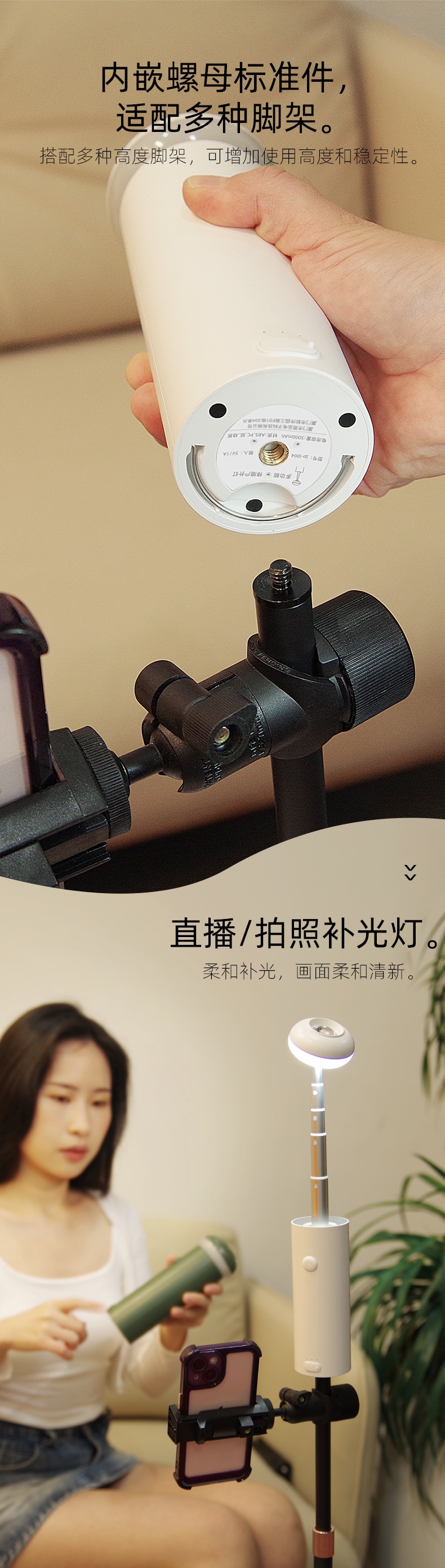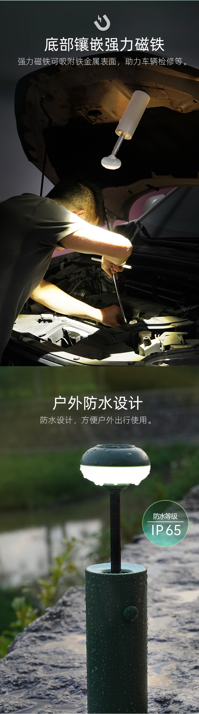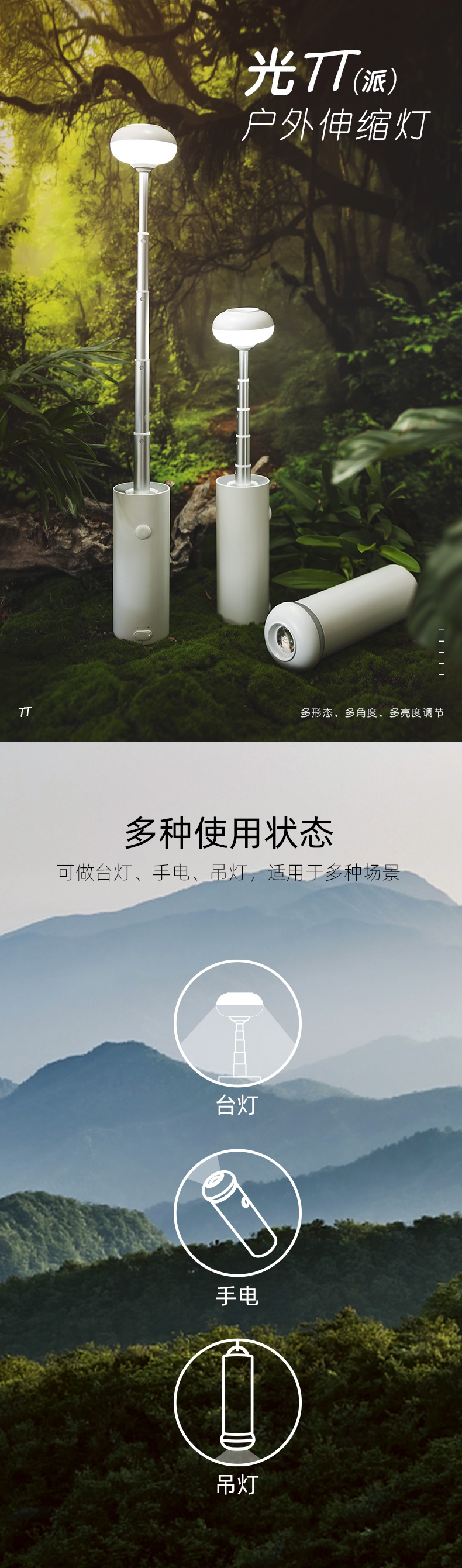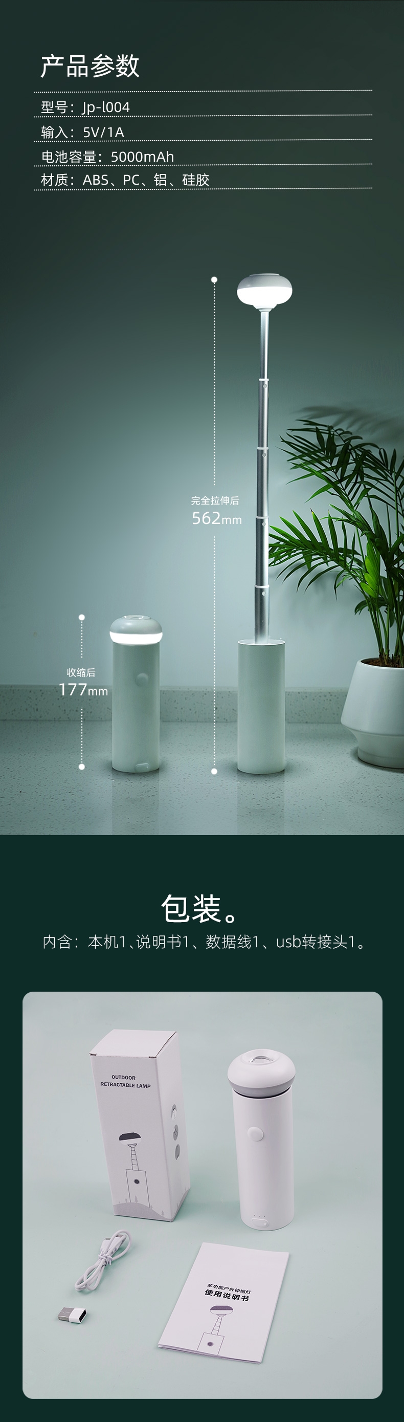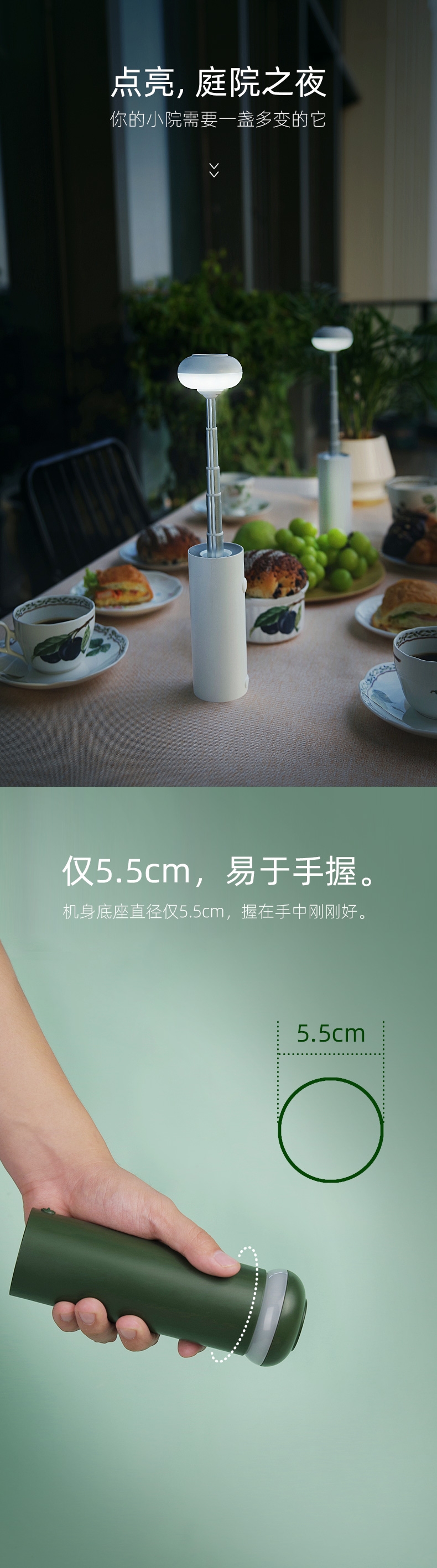 既是桌面台灯、悬挂吊灯,也是便携手电、露营主灯;伸缩灯杆设计,可在短柄便携与长杆照明之间灵活切换;内置大容量电池,支持长时间持续照明