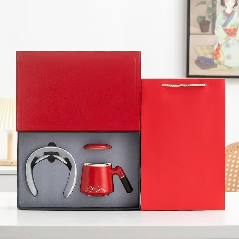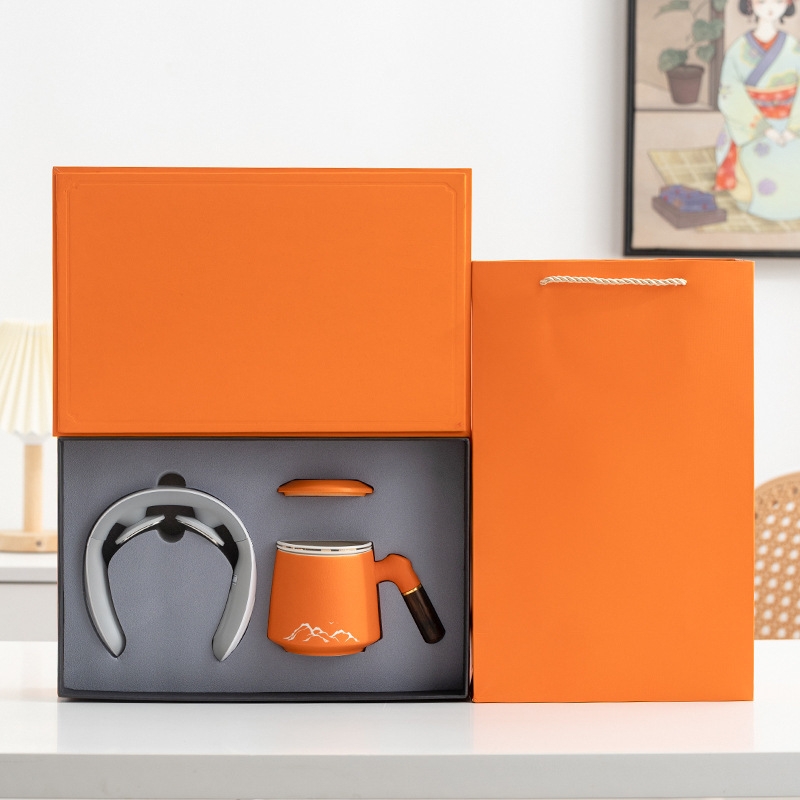 商务实用性礼品,上班族刚需产品。粗陶办公杯,带茶漏;颈椎按摩仪,低频脉冲技术,缓解颈椎疼痛。;红色 ,橘色 ,蓝色三色可选